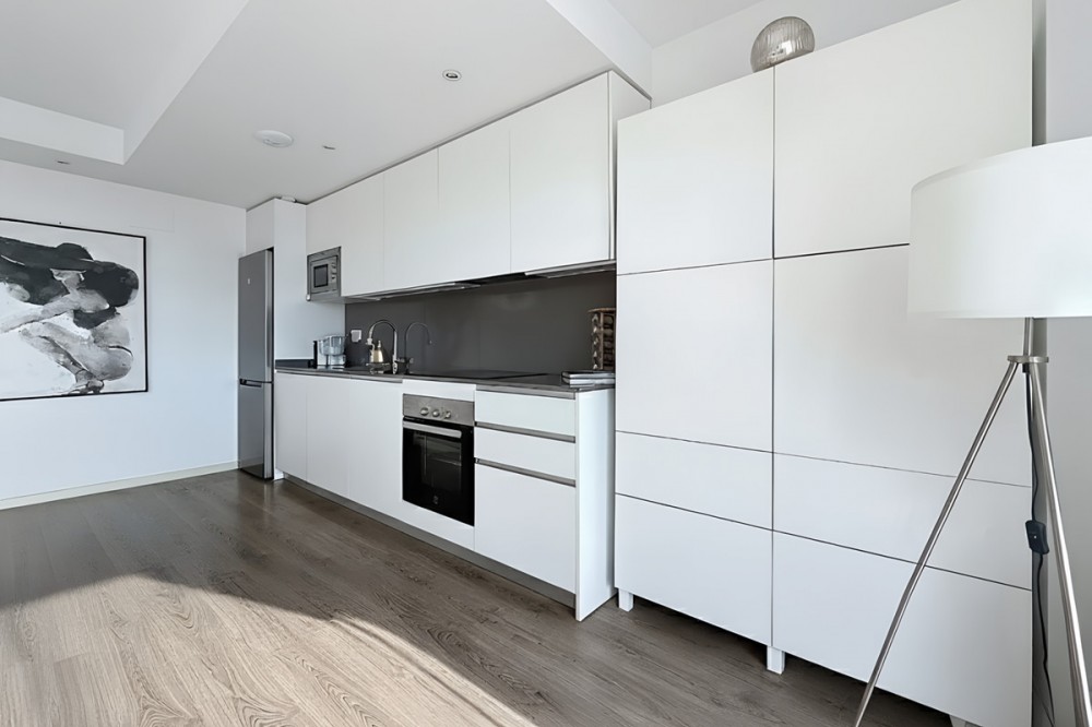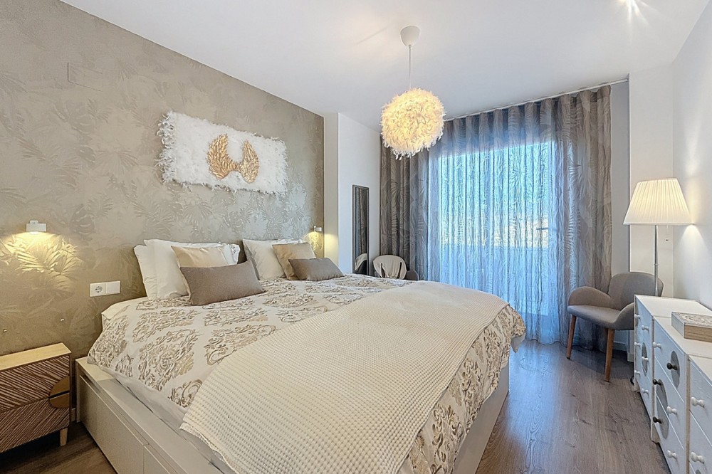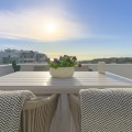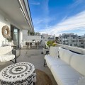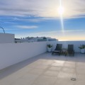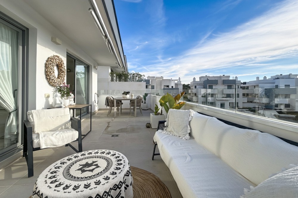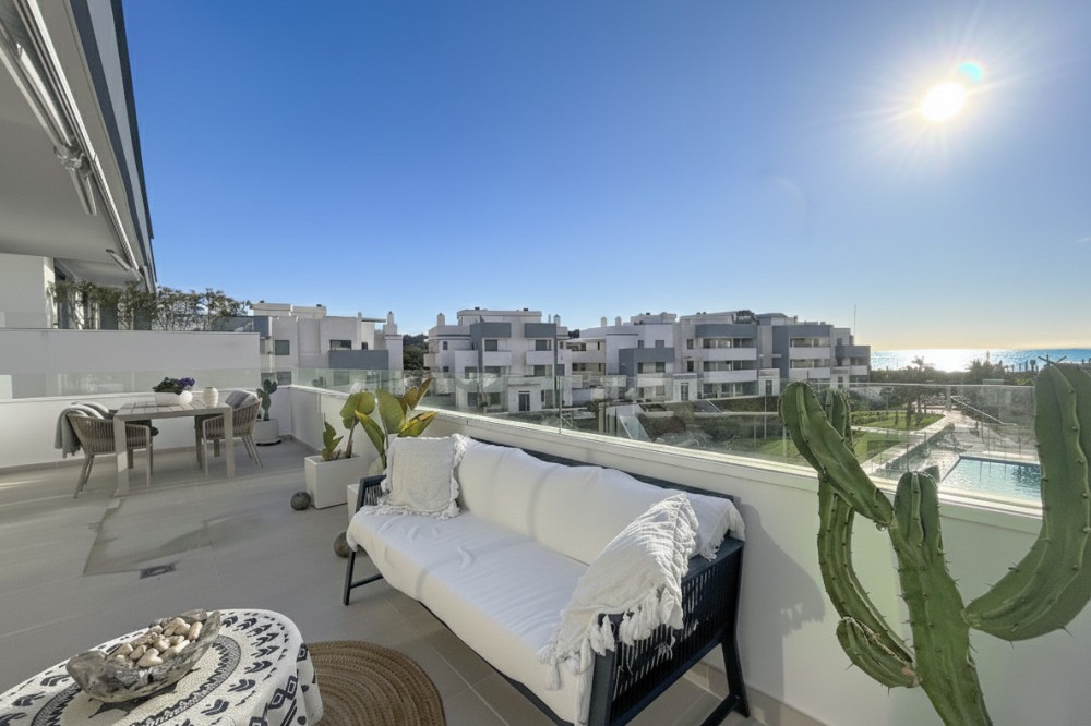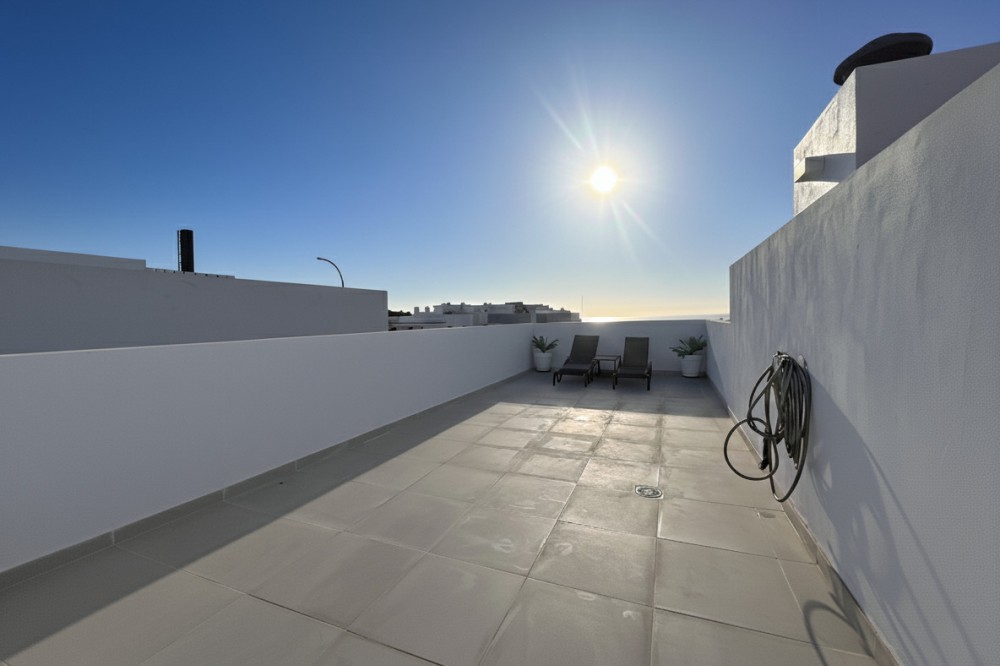 - This duplex penthouse is located in the Serenity Views Urbanization, in West Estepona, and stands out for its impressive sea views and spaciousness. The property, situated in a gated community, offers the tranquility of living close to the sea and the convenience of being near golf courses, shops, restaurants, and schools. The home features a spacious main living room, designed with an open-concept layout, which integrates perfectly with the private terrace, allowing you to enjoy natural light and direct panoramic sea views. The kitchen, fully equipped and modern in style, is connected to the living room and includes high-quality appliances, as well as a practical laundry area. In the sleeping area, there are two bedrooms with built-in wardrobes and two full bathrooms, one of them en suite. The bedrooms are designed to offer comfort and privacy, and the master bedroom also has a private bathroom and a private terrace with views of the countryside and mountains. An elegant staircase leads to the solarium, where the sense of spaciousness and the breathtaking sea views are truly impressive. Among the extras offered by this duplex penthouse are air conditioning, double glazing, reinforced door, as well as a garage and storage room included. The complex features a swimming pool and mature communal gardens, and elevator. The property is in excellent condition and has close access to all amenities, including the port, city center, and the beach.