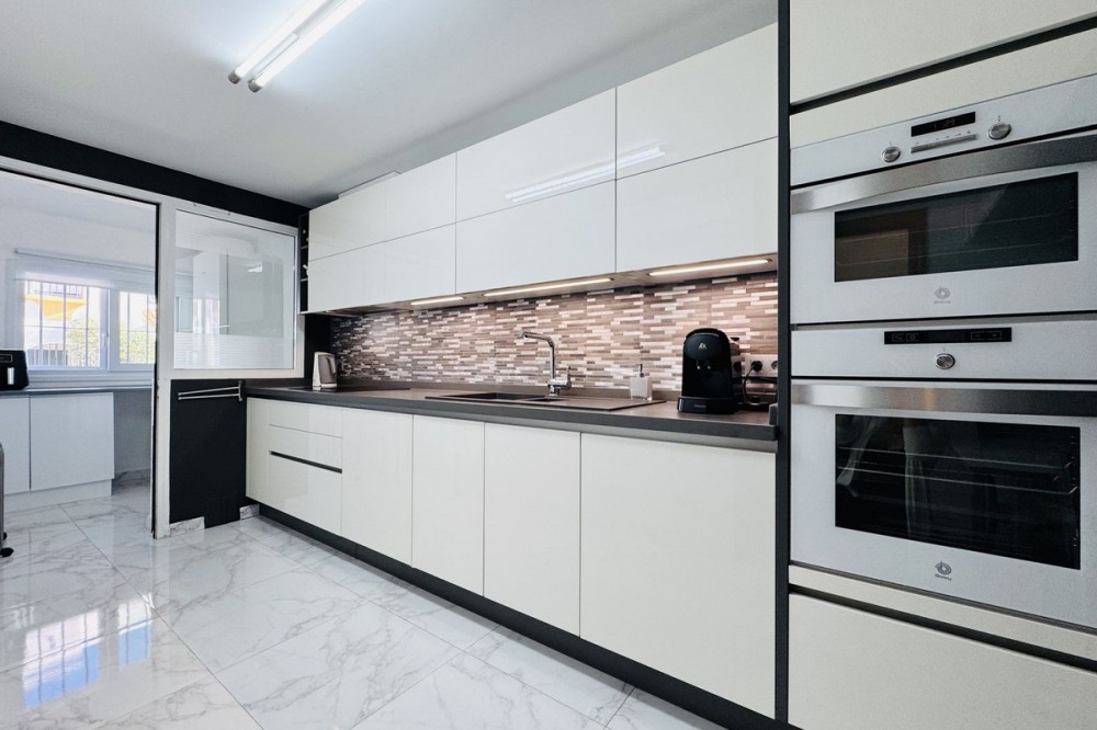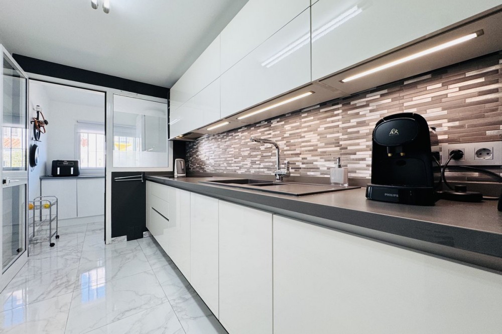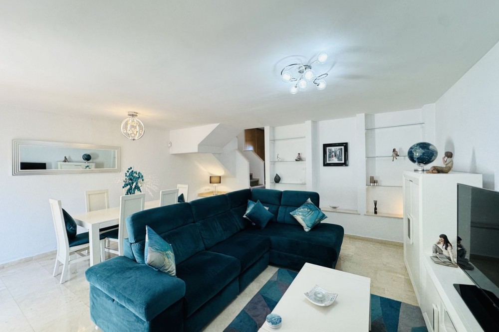 - Elegant 3-Bedroom Townhouse in the Sought-After Marina de Casares. Located in the ever-popular Marina de Casares Urbanization, this spacious three-level townhouse offers the perfect blend of comfort, style, and convenience. Situated in a quiet phase of the development, residents enjoy exclusive access to a beautiful communal pool and landscaped gardens, with low community fees of just €90 per month. On the main level, you’ll find a large, modern fitted kitchen with timeless white gloss cabinetry, abundant storage, and a separate laundry area. There’s also a convenient guest toilet. The open-plan living and dining area features a cozy fireplace and French doors leading out to a sunny west-facing terrace and private garden, complete with a canopy for shade and direct access to the communal gardens and pool. The first floor hosts three double bedrooms, all with fitted wardrobes. The master bedroom includes a beautifully renovated en-suite bathroom with a walk-in shower, while the second bathroom serves bedrooms two and three. Individual hot and cold air conditioning units are fitted in two of the bedrooms and the main living area for year-round comfort. The third level opens to a private roof terrace, perfect for sunbathing or entertaining, with all-day sunshine and additional storage space. Some owners in the community have even converted this area into a fourth bedroom or studio. Perfectly positioned, the property is just a five-minute walk to the beach and a 15-minute stroll to the charming town of San Luis de Sabinillas, offering a variety of shops, restaurants, and local amenities. Rarely on offer, there is an optional underground parking space in a neighboring community. Whether you’re looking for a family home, a holiday getaway, or a high-yield rental investment, this stunning townhouse ticks every box.