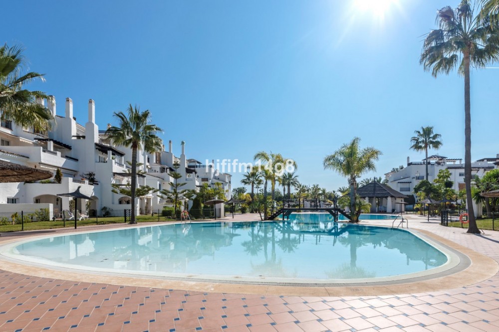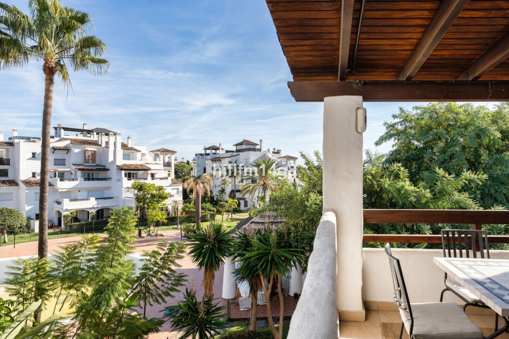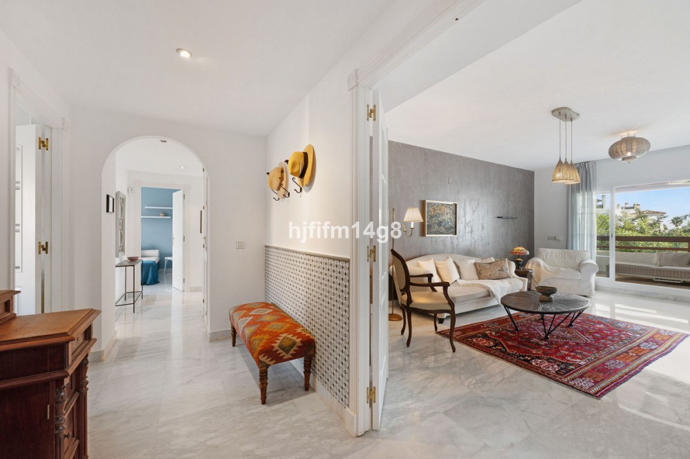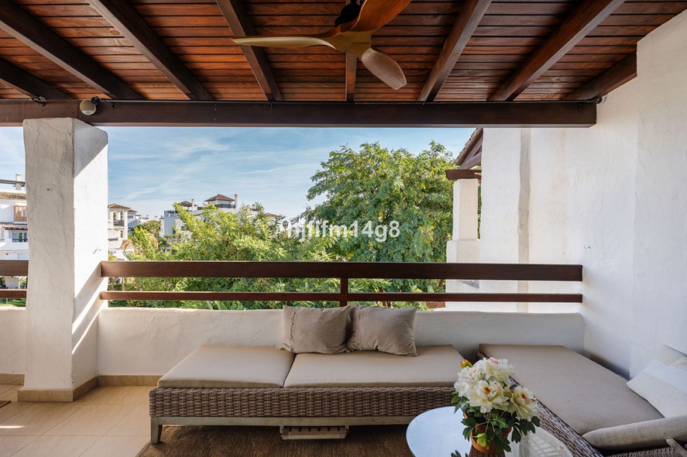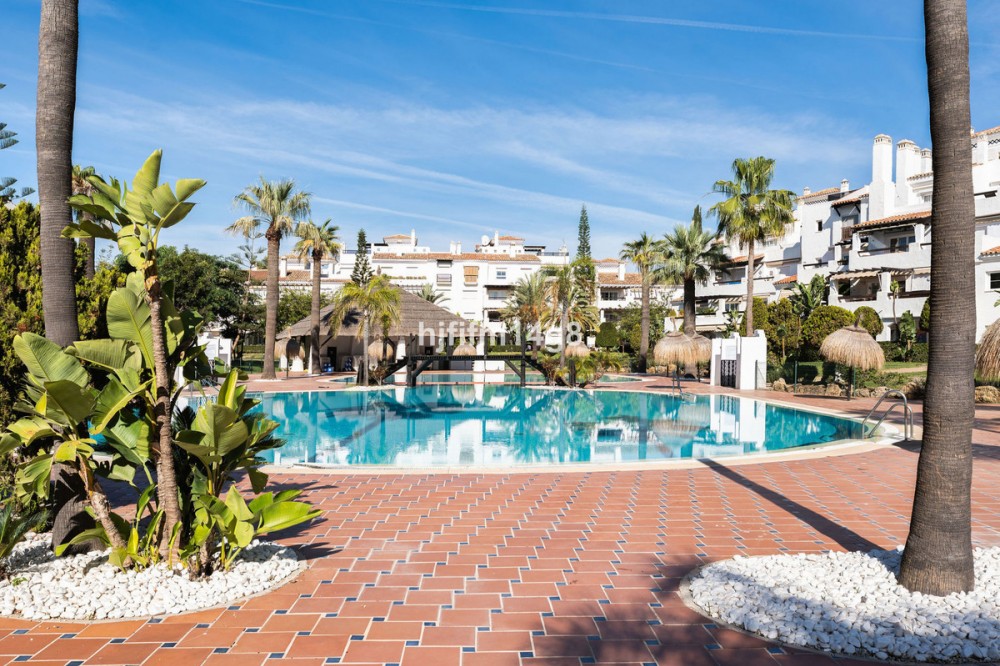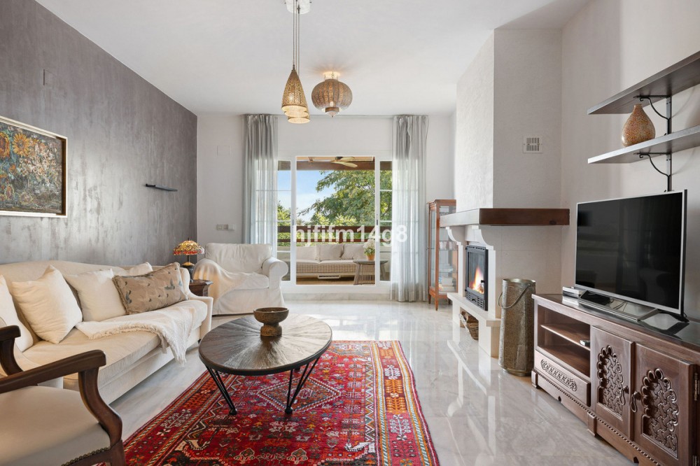 - Location, location, location! Look no further — the sought-after Las Adelfas complex is one of the most desirable communities in the area, and we’re delighted to present this charming 2-bedroom apartment perfectly positioned within the urbanisation. Partly renovated, this home beautifully combines modern comfort with authentic Andalusian style, staying true to the charm that makes Las Adelfas so special. Step into a welcoming entrance hall that leads to the spacious living room, featuring a cassette fireplace — perfect for cozy winter evenings. From here, large sliding doors open onto a private, L-shaped covered terrace. Thanks to its corner position, the terrace enjoys excellent privacy and offers two distinct areas — one for relaxing and another perfect for alfresco dining. The kitchen is generously sized and includes a dining area plus a separate utility/storage room with a washing machine and dryer — a great space for those who love cooking and entertaining. Further inside, you’ll find two bedrooms. The guest bedroom sits opposite a full bathroom, which also serves conveniently as a guest WC. The master bedroom is especially spacious, currently featuring a sofa bed and a large en-suite bathroom with both a walk-in shower and bathtub, plus a window for natural light and ventilation. From the master suite, you also have direct access to the terrace, creating a lovely indoor-outdoor connection. Additional highlights include: - New air-conditioning system, installed two years ago - Underground parking for one car - Private storage room, ideal for golf clubs, bicycles, or beach gear This delightful property offers comfort, character, and an unbeatable location — a rare opportunity to own a home in one of the most popular complexes in the area.