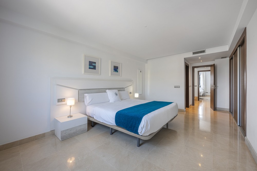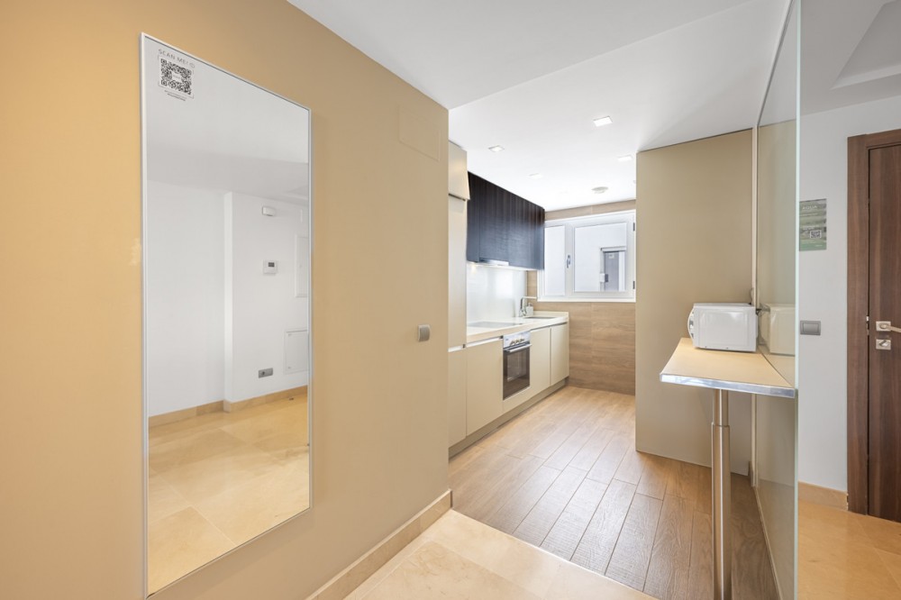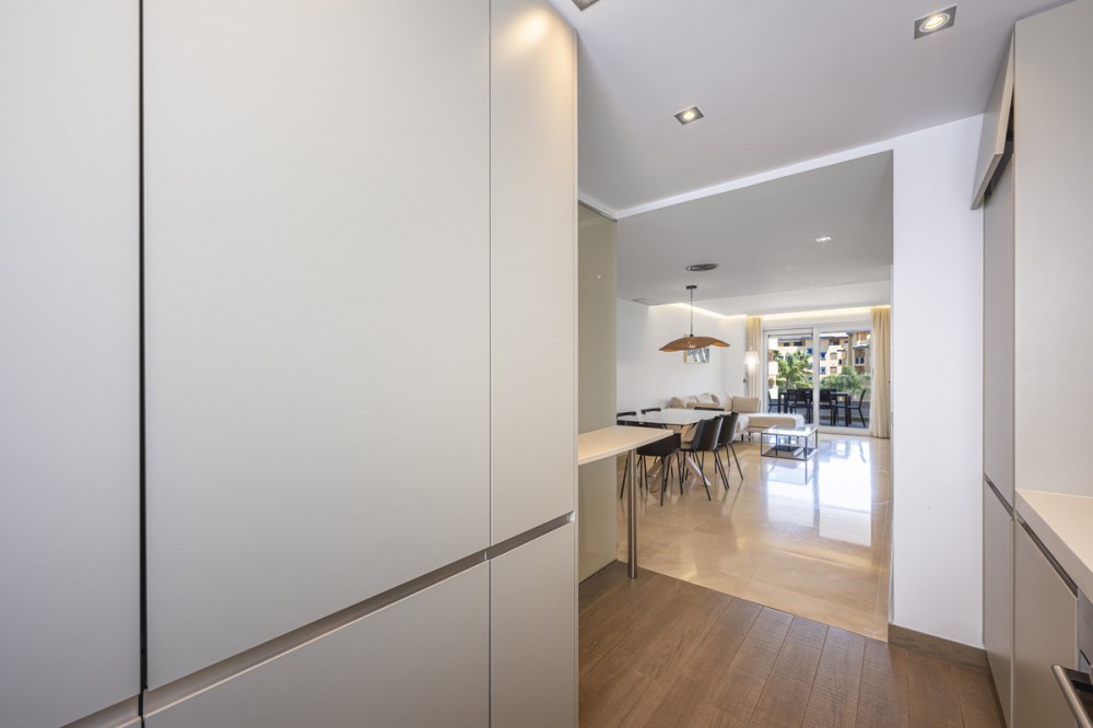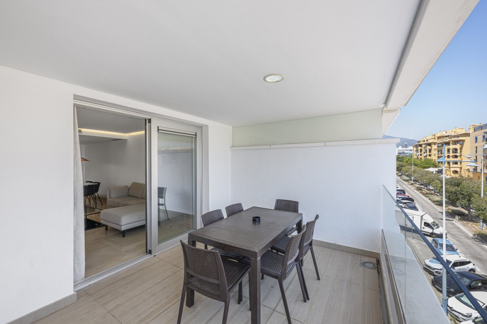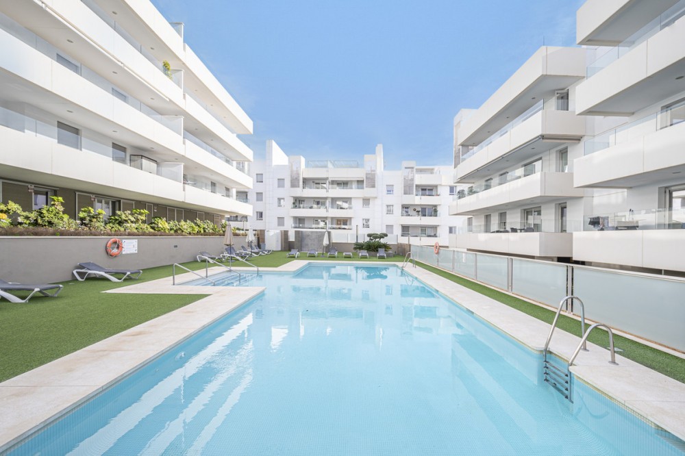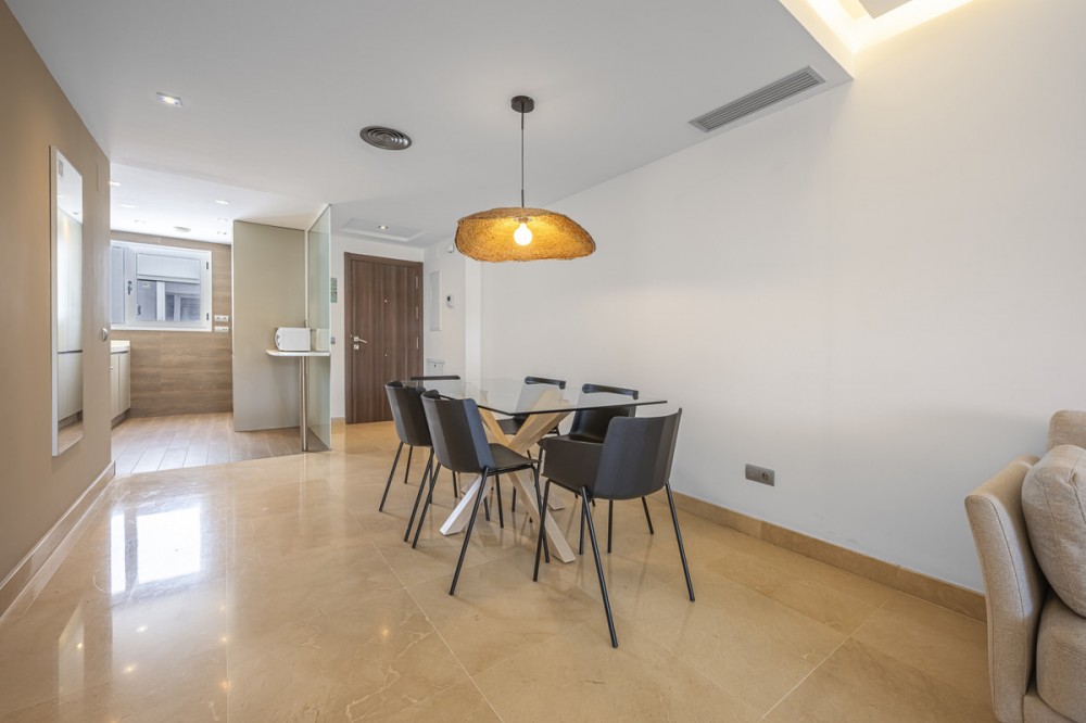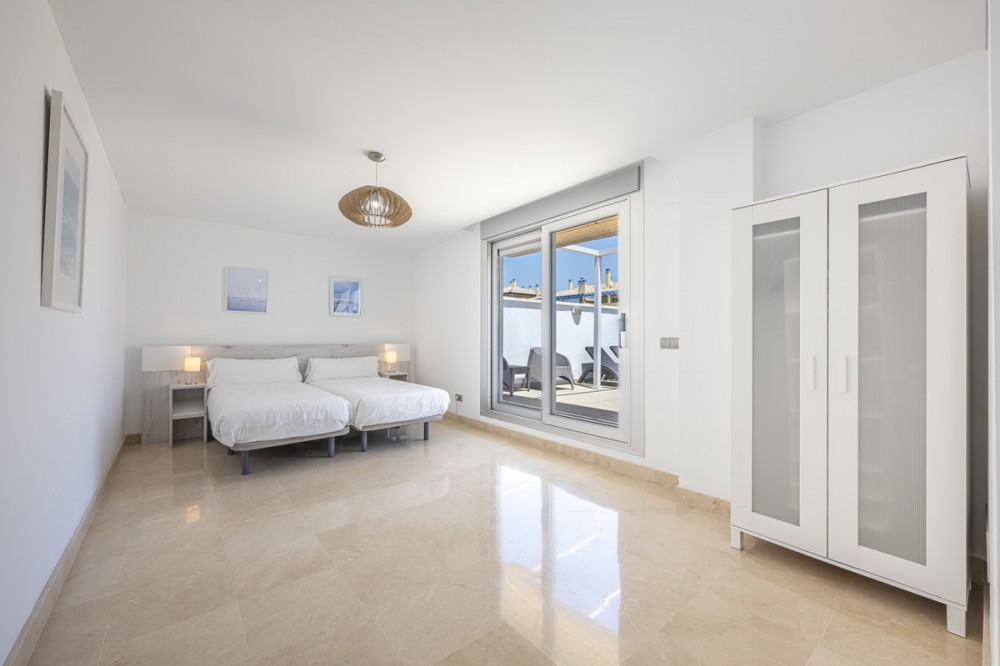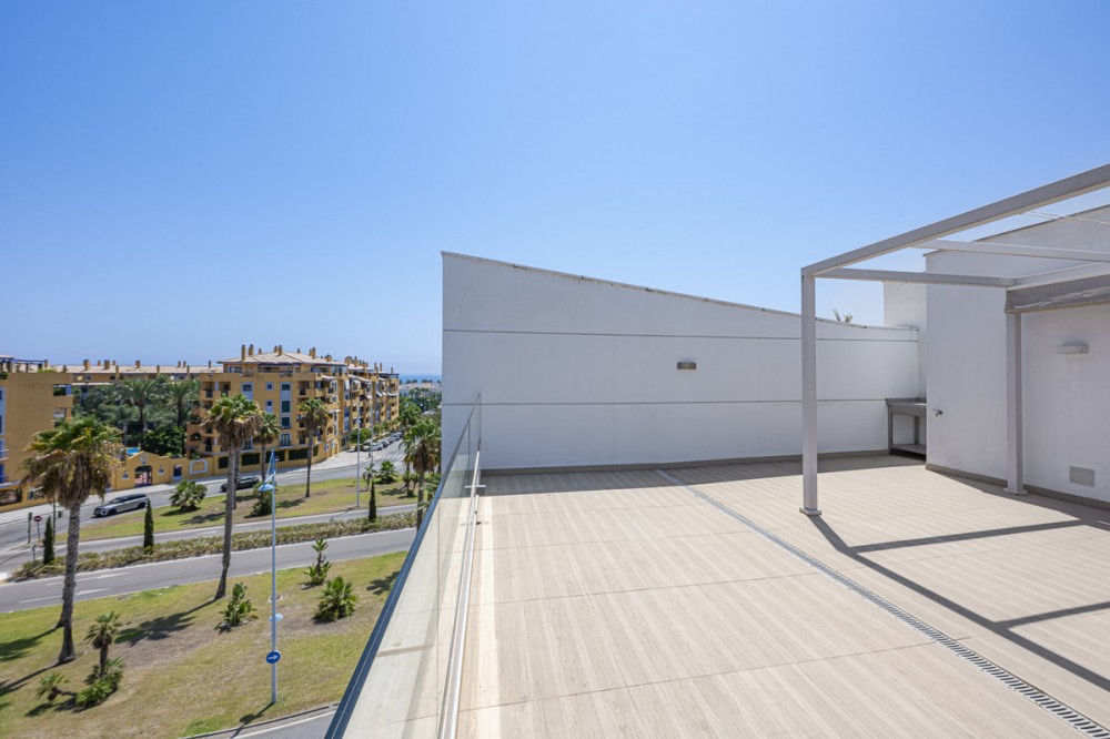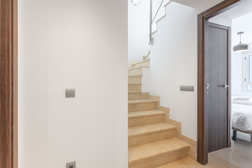 - The property is located in one of the most sought-after areas of San Pedro de Alcantara, connected to the new boulevard and just a stone's throw from the beach. It is considered to be the most modern part of the city, offering a wide variety of high-quality services, international restaurants and typical tapas bars, leisure areas, pharmacies, shops and a wide range of amenities. The development is located next to the Nueva Alcantara Padel Club, one of the most popular in the area. The duplex penthouse offers a spacious living room with direct access to one of the terraces with open and partial sea views. The kitchen is integrated into the living room but is somewhat separate at the same time and is fully furnished with high-end appliances. The master bedroom is en suite and has built-in wardrobes. Also on this floor is a guest bedroom with two single beds and an external bathroom. Upstairs, there is a bedroom with a wardrobe that has direct access to the large solarium with open views of the boulevard and partial sea views. The property includes two parking spaces. The residential complex is located a short distance from the beach and offers a communal swimming pool with a relaxation area.