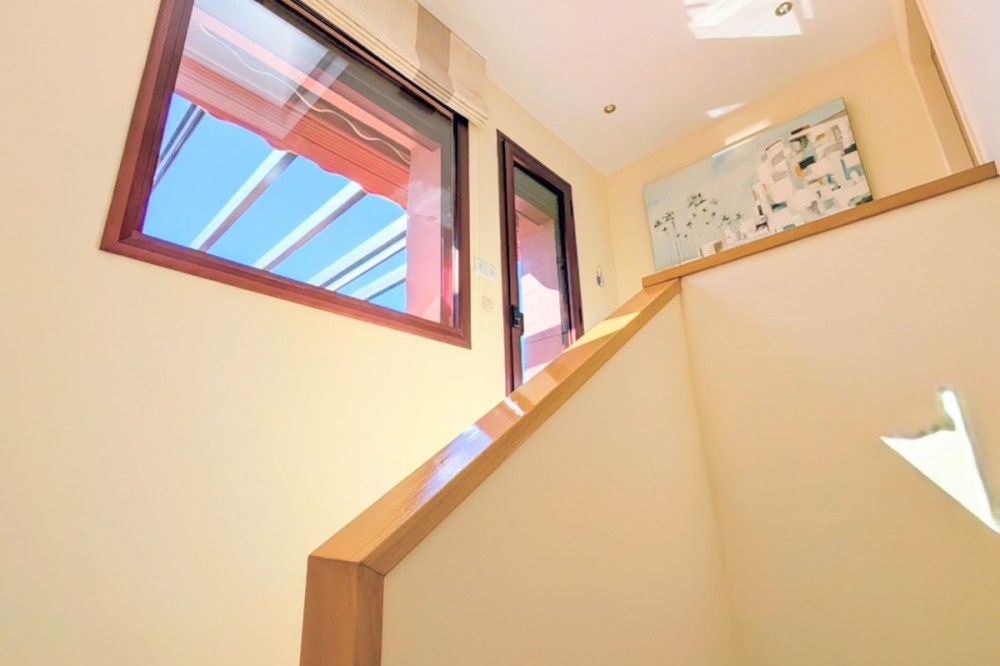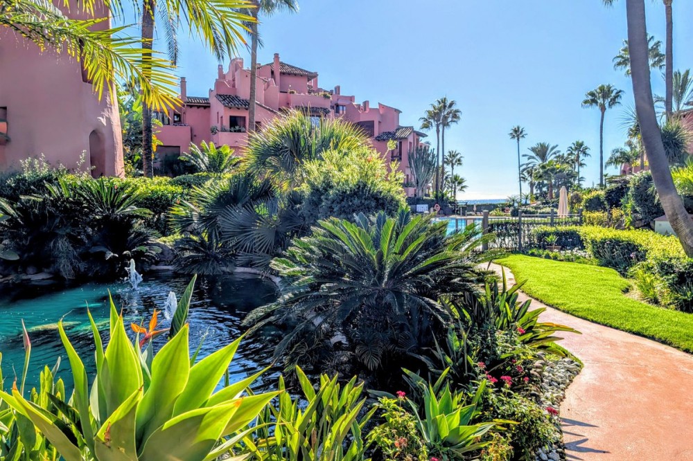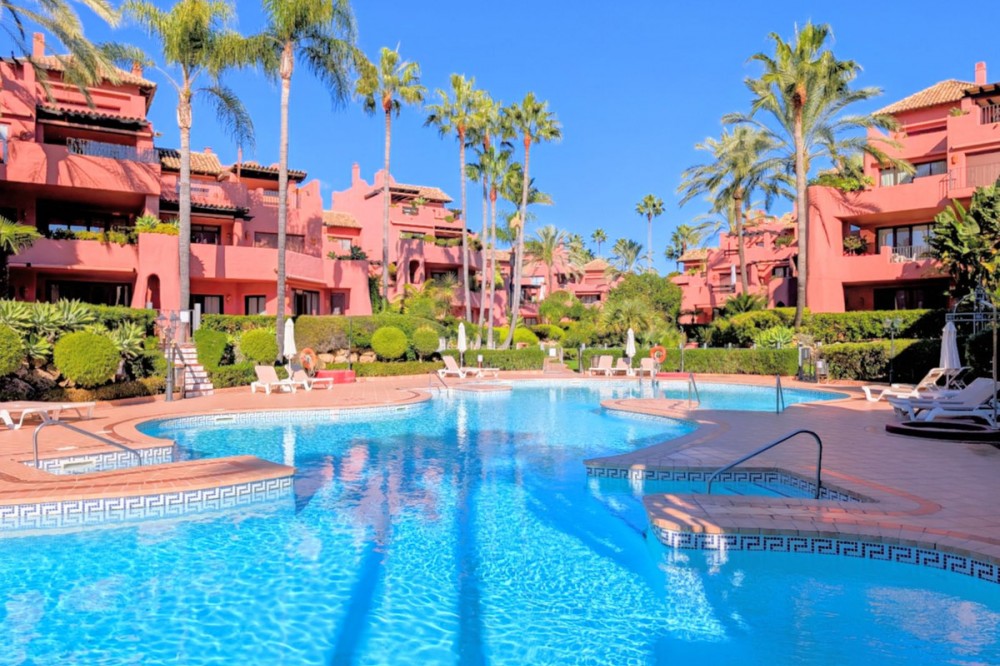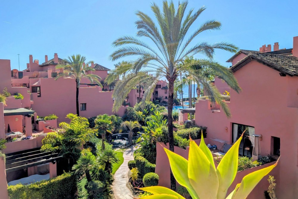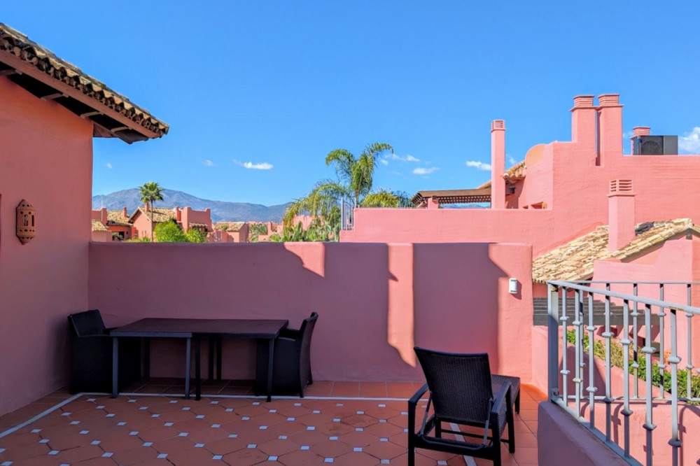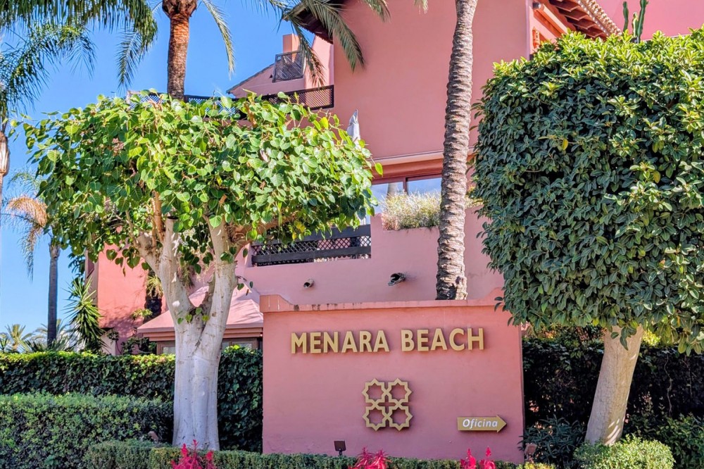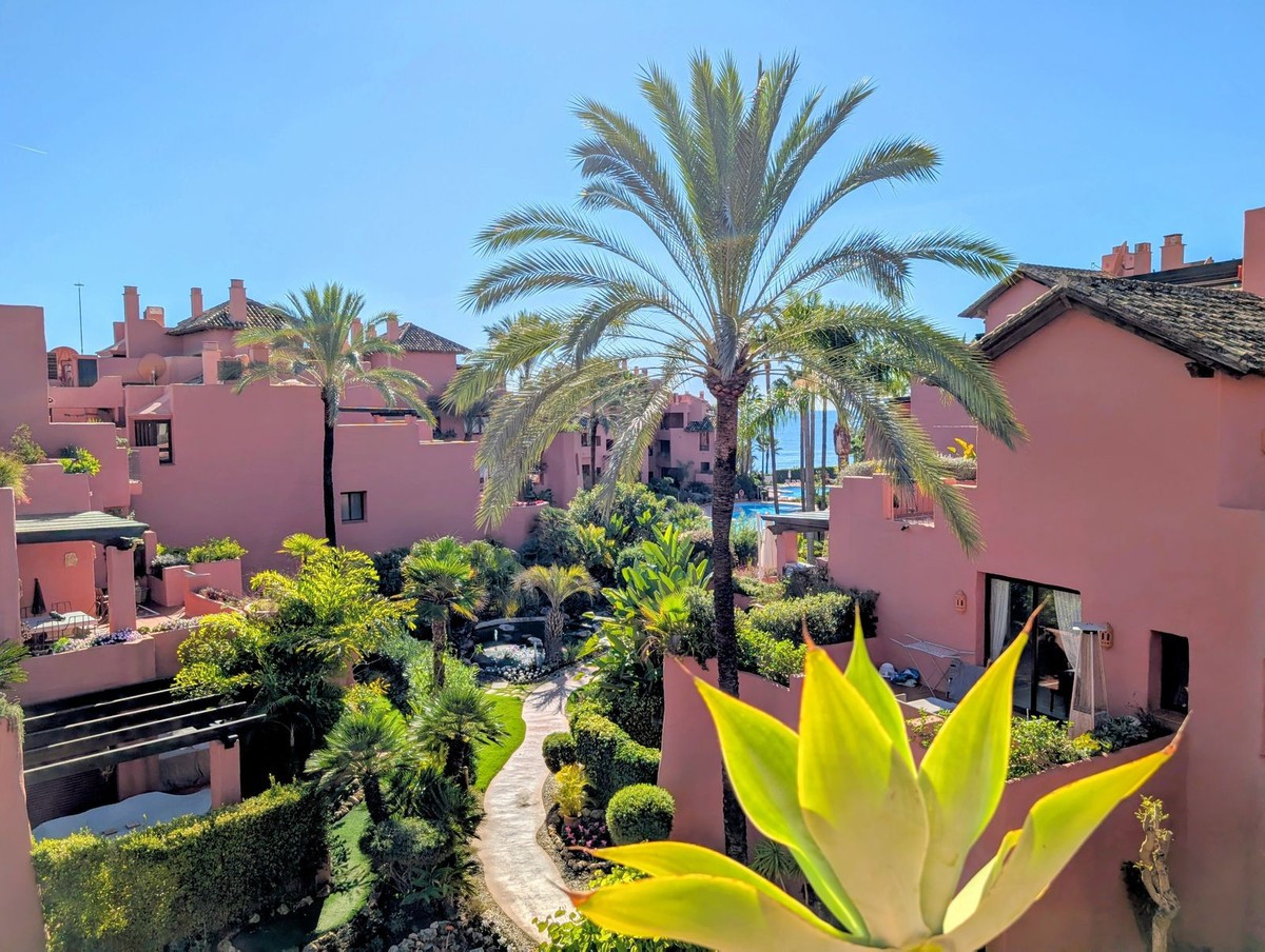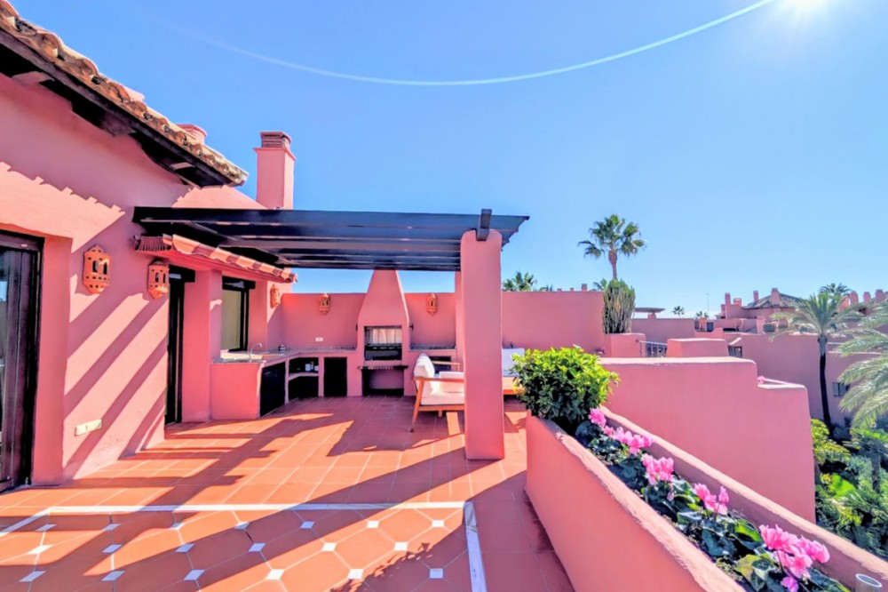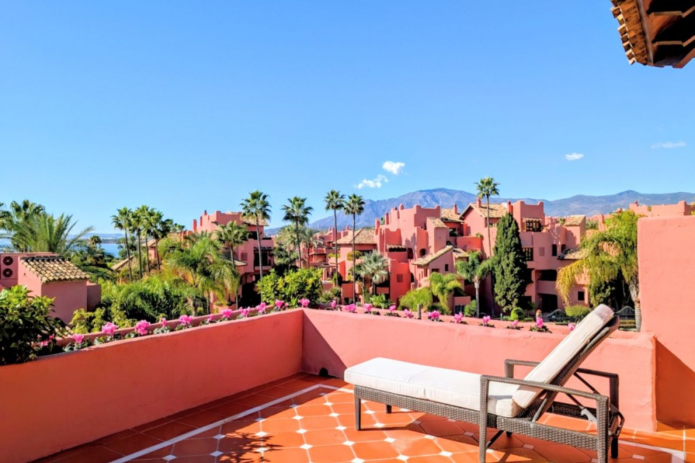- NEW on the market! Stunning Penthouse duplex in exclusive luxury beachfront complex on the New Golden Mile, East Estepona. The property benefits from prominent position within the urbanisation, with breathtaking views towards the Mediterranean sea, Sierra Bermeja mountains and amazing landscaped gardens with lakes, fountains, swimming pools and lush vegetation. This fully gated urbanisation is renowned for its five-star facilities such as 24/7 security, two amazing swimming pools with waterfall, a heated indoor swimming pool, gym, library, summer bar & table tennis, a sauna and direct access to the beach. The community services all the properties for hassle free living, including technical check-ups etc. The Penthouse benefits from sunlight all day long, there are three ample terraces with excellent views and one of them comes with built in BBQ and summer kitchen. The entrance level comprises of: entrance hall, fully fitted & equipped kitchen with service bar, great size lounge with dining area and access onto uncovered terrace for al fresco dining. On this floor, there are also two guest bedrooms and two bathrooms. Underfloor heating throughout with independent thermostates per room. Nice staircase takes to upper level which is entirely occupied by master suite, including the bedroom, bathroom with dressing area and two large terraces, one of these private for master suite and other one has independent access from distribution hall. This amazing sunny terrace comes with sunbathing and sitting areas, BBQ & kitchenette. Absolutely stunning panoramic views and incredible sunsets can be enjoyed from this terrace. This beachfront complex - Menara - is surrounded by other exclusive complexes which all benefit from landscaped public park with ancient wathing tower. There are also several amenities at the walking distance such as well known restaurant Tikitano and some shops and a bar in nearby complex, more amenities can be found just a short drive from home. Estepona town is 6min drive from Menara and its easily accessible from Malaga Airport using AP-7 toll road. Spectacular property in an exceptional location!