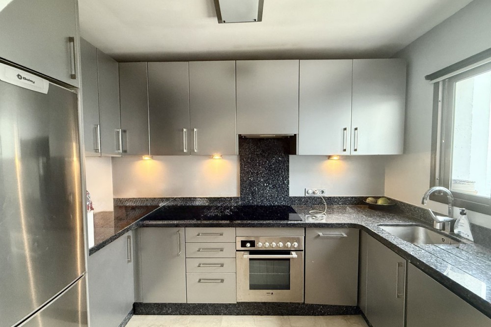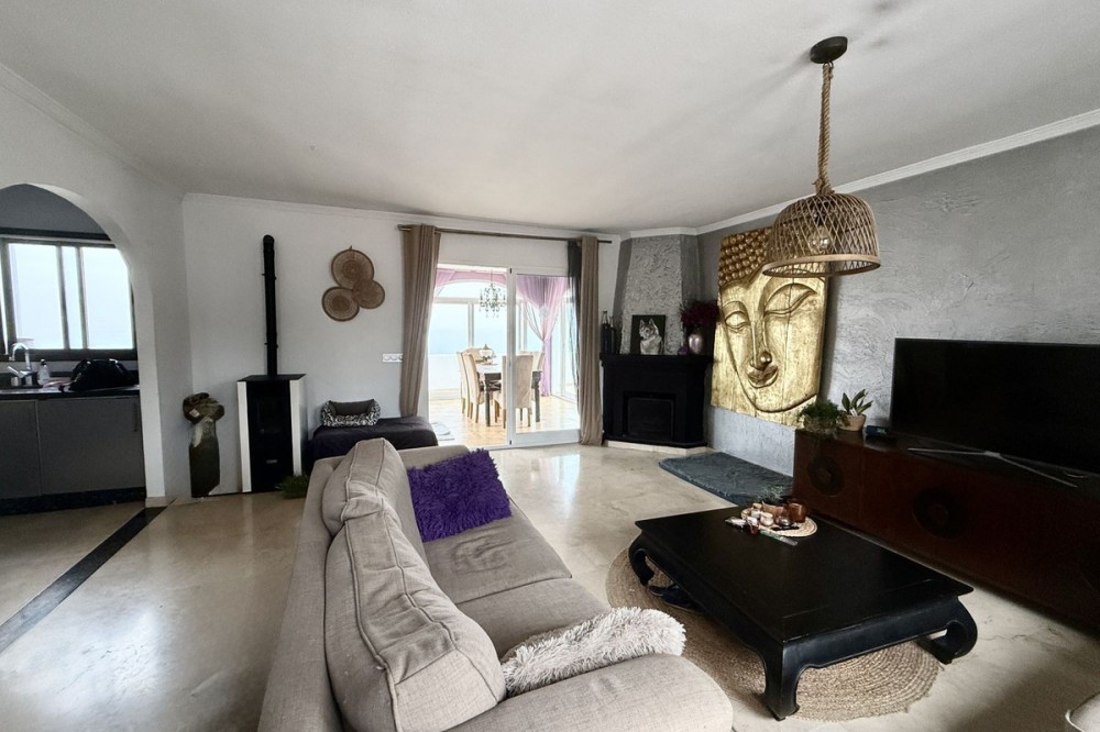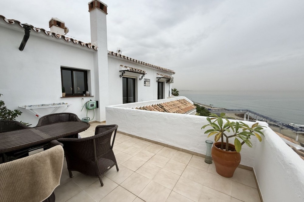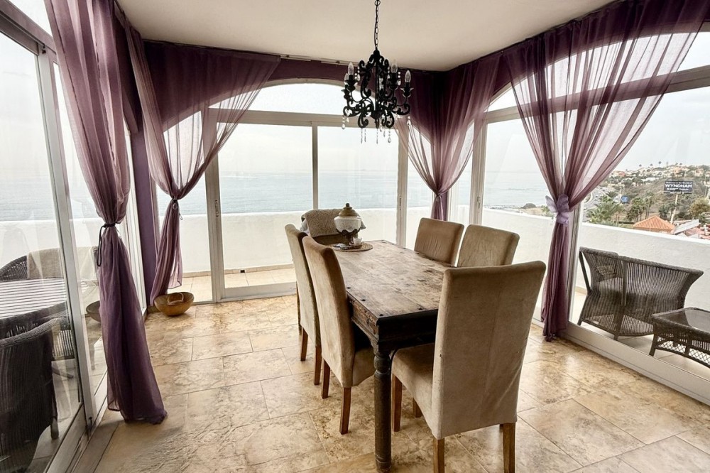 - Penthouse apartment with the most stunning, panoramic sea views!!! Located within just a few minutes¨walk to the beach and just a few minutes¨drive to Fuengirola and La Cala de Mijas, this trully superb property is a rare find! The property comprises of a spacious lounge/dining room with pelllet burning fireplace, open plan modern kitchen, one double bedroom with bathroom plus the master bedroom with ensuite bathroom. Both bedrooms have patio door access to the terrace and built in wardrobes. Via patio doors from the lounge, is a stunning glass conservatory/sun lounge, used by the current owner as the dining room. The terrace of the property extends the full length of the apartment and to the side, being a corner property, and offers south facing full frontal and lateral uninterrupted sea views. The community is immaculately maintained, with gated access to the communal carparking area. There is a large swimming pool with sunbathing areas. Local amenities can be walked to also, including bars and restaurants, supermarket, bakery etc. Community fees - 160 euros per month including water