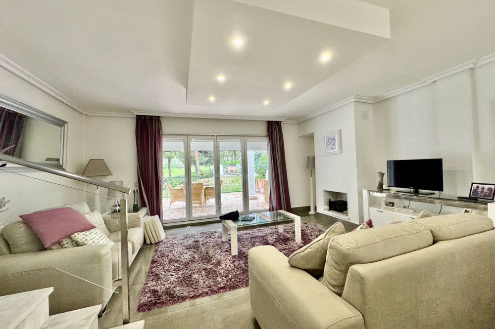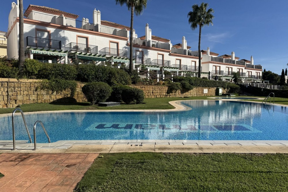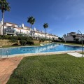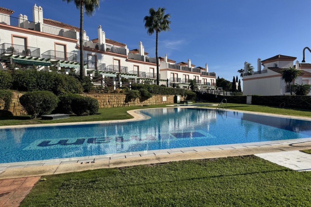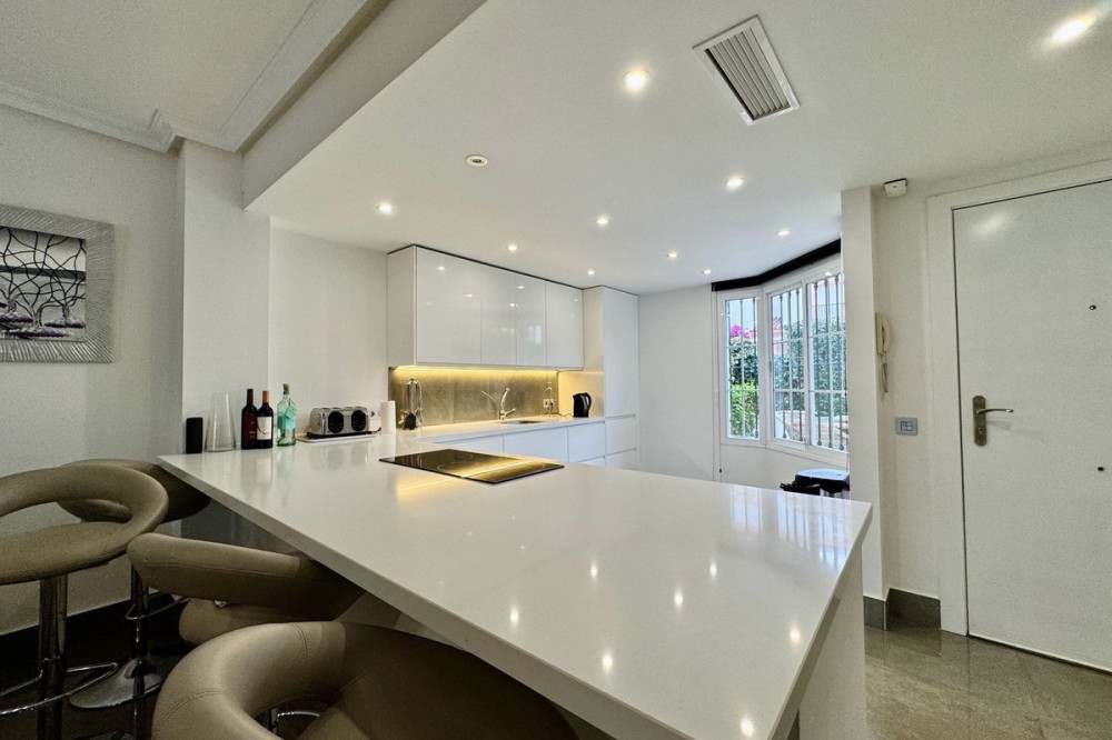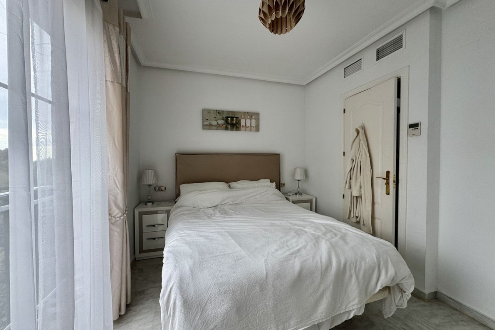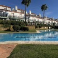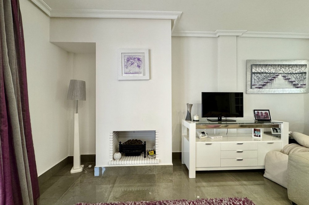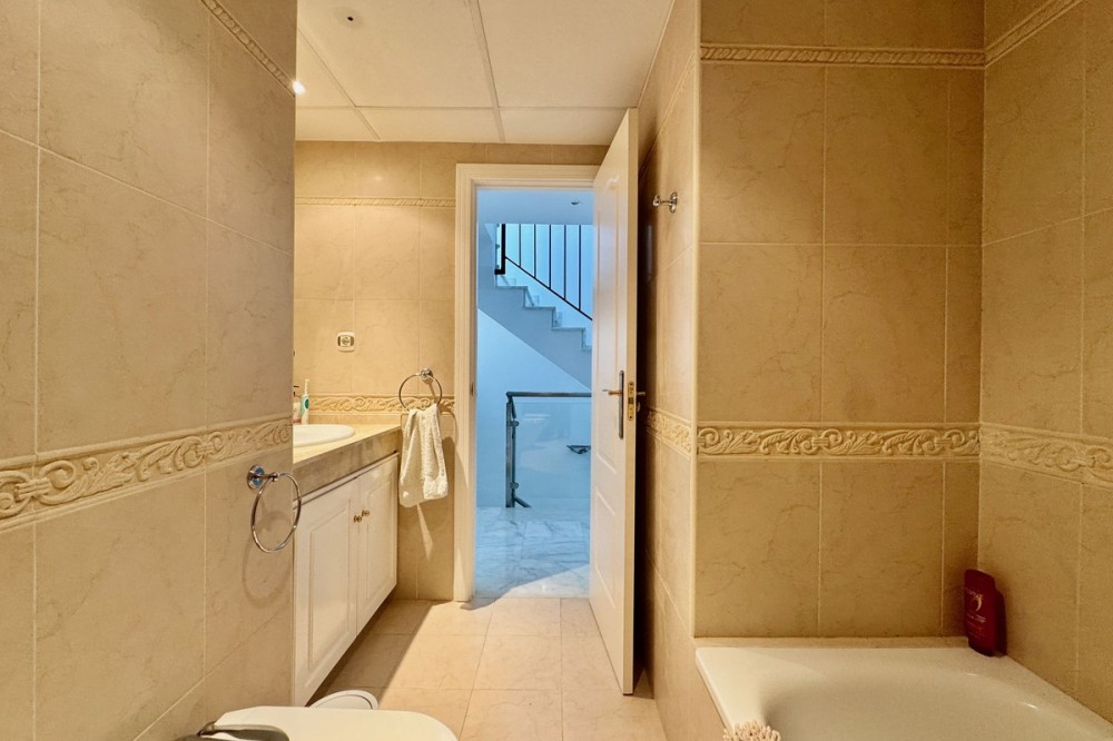 - This attractive three bedroom house is located in a frontline golf position while still being walking distance to the beach. The house has three real bedrooms on the upper level and two bathrooms plus a guest toilet. Many owner have even added an extra bedroom and bathroom in the basement/garage while this owner has choosen to keep the garage and storage space. The owner has improved the property with an amazing modern kitchen false ceilings with spot lights giving the property a modern feel. With two nice terraces on the lower level and also a roof terrace one has plenty of outdoor space to really allow one to enjoy the Spanish climate. The complex is gated with two swimming pools.