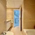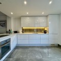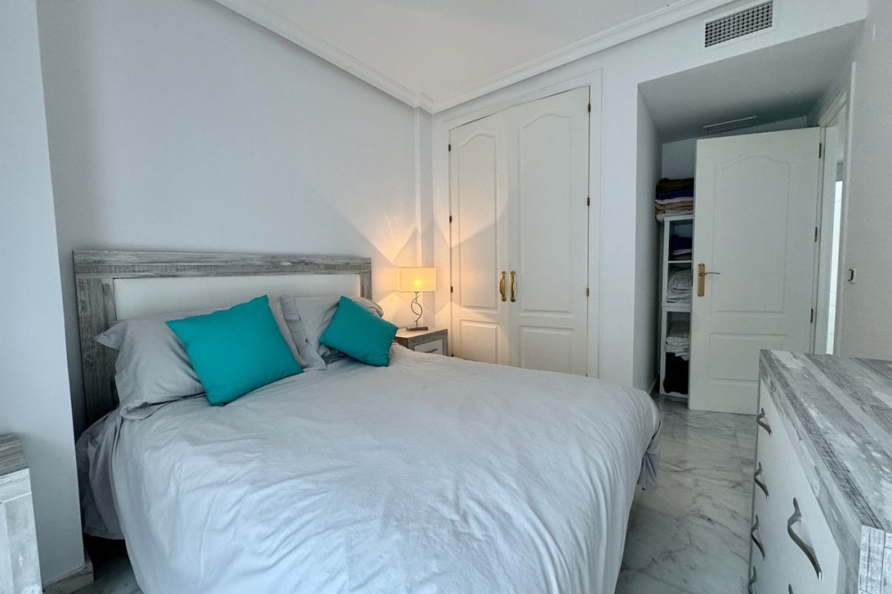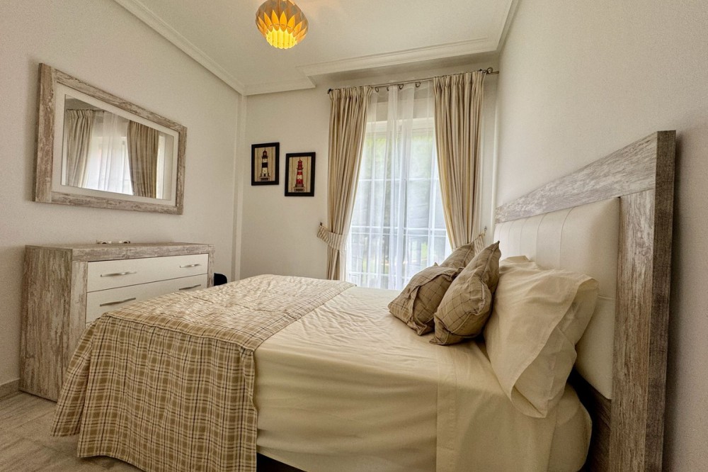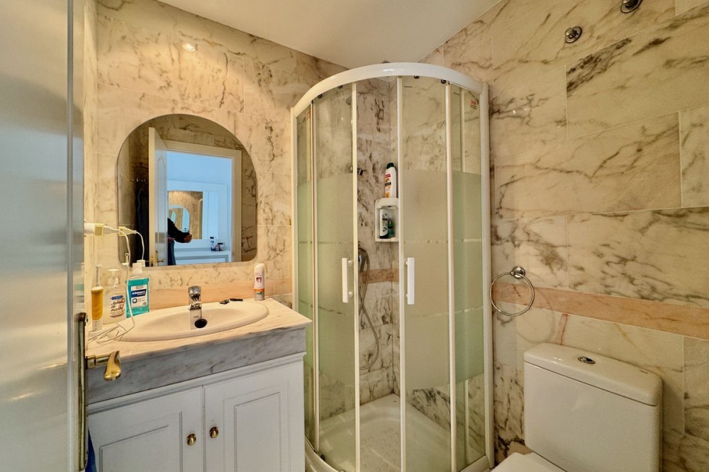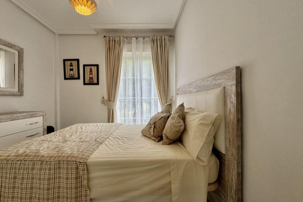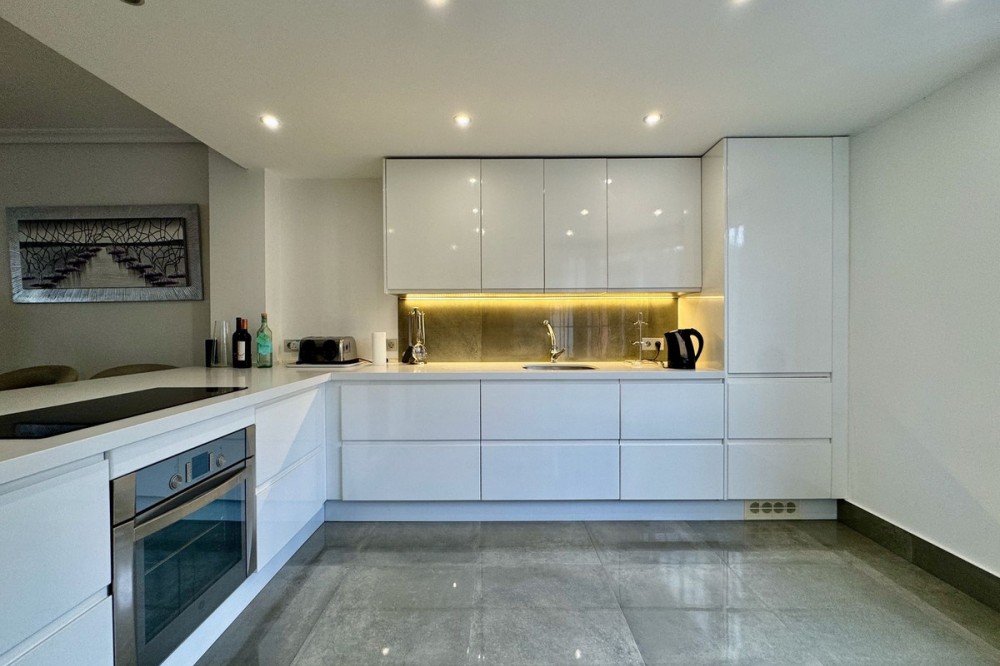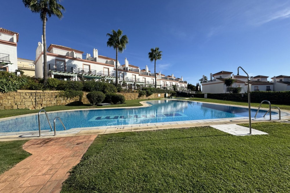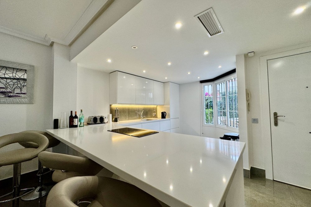 - This attractive three bedroom house is located in a frontline golf position while still being walking distance to the beach. The house has three real bedrooms on the upper level and two bathrooms plus a guest toilet. Many owner have even added an extra bedroom and bathroom in the basement/garage while this owner has choosen to keep the garage and storage space. The owner has improved the property with an amazing modern kitchen false ceilings with spot lights giving the property a modern feel. With two nice terraces on the lower level and also a roof terrace one has plenty of outdoor space to really allow one to enjoy the Spanish climate. The complex is gated with two swimming pools.