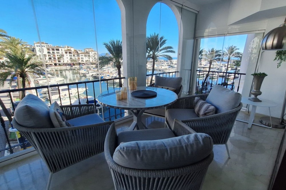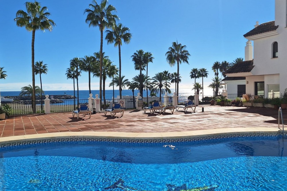 - Middle Floor Apartment, La Duquesa, Costa del Sol. 2 Bedrooms, 2 Bathrooms, Built 100 m², Terrace 13 m². Exclusive first Line Beach- direct to the Duquesa Port Setting : Beachfront, Commercial Area, Port, Close To Shops, Marina, Urbanisation, Front Line Beach Complex. Condition : Excellent. Pool : Communal. Climate Control : Air Conditioning, Hot A/C, Cold A/C. Views : Sea, Port. Features : Covered Terrace, Lift, Fitted Wardrobes, Private Terrace, Storage Room, Utility Room, Ensuite Bathroom, Marble Flooring, Double Glazing, Fiber Optic. Furniture : Fully Furnished. Kitchen : Fully Fitted. Garden : Communal. Security : Gated Complex, Alarm System, 24 Hour Security. Parking : Underground, Covered, Private. Category : Beachfront, Luxury.