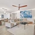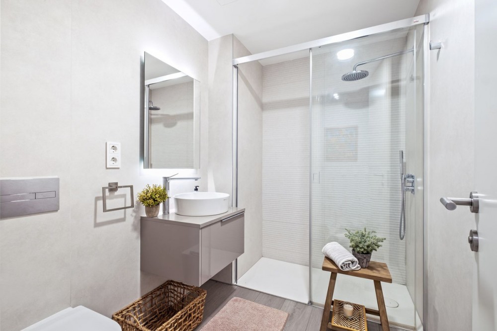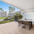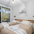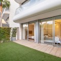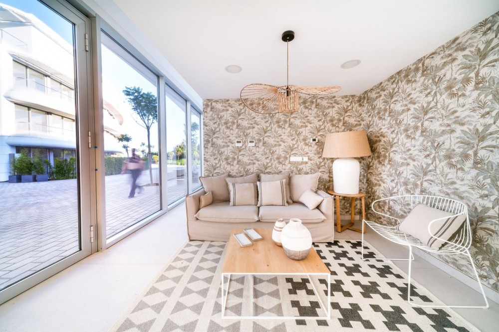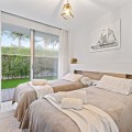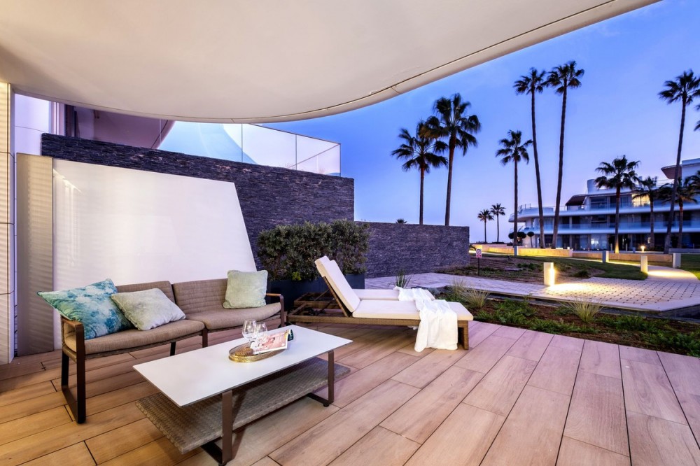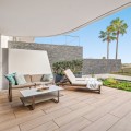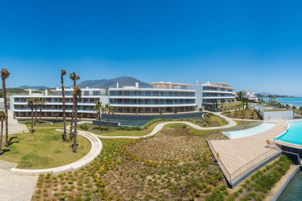 - This bright and spacious property offers an elegant layout designed for comfort and outdoor living. The large living and dining area opens directly onto a beautiful 35 m² terrace with sea views and an expansive garden, creating a seamless connection between the interior and exterior spaces. The kitchen is fully equipped with high-end Gaggenau appliances, combining style and functionality. The master bedroom features its own bathroom, built-in wardrobe, and direct access to a private outdoor garden. The second bedroom also includes a built-in wardrobe and opens onto a private garden area, making both rooms feel airy and connected to nature. All the furniture throughout the apartment is of premium quality, enhancing the refined and modern atmosphere. The complex offers exceptional amenities, including 24-hour security, a fully equipped gym, a complete spa with dry and wet sauna, a heated indoor pool, and two stunning outdoor infinity pools with sea views. Additional facilities such as a padel court and a coworking area make this community ideal for both relaxation and productivity. Located in Costa Natura, Guadalobón, the property is just minutes from Estepona’s town centre and close to supermarkets, restaurants, golf courses, the hospital, and other essential services. It also holds a tourist license, offering the opportunity to generate high rental income. The home has a usable interior surface of 103.58 m², a main terrace of 35 m², and a private garden of 32.2 m². It includes two bedrooms and two bathrooms, one of them en-suite, as well as a 7 m² storage room and a private parking space. The property is equipped with aerothermal heating, underfloor heating, air conditioning, and domotic automated blinds, ensuring both comfort and modern convenience.
