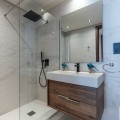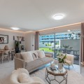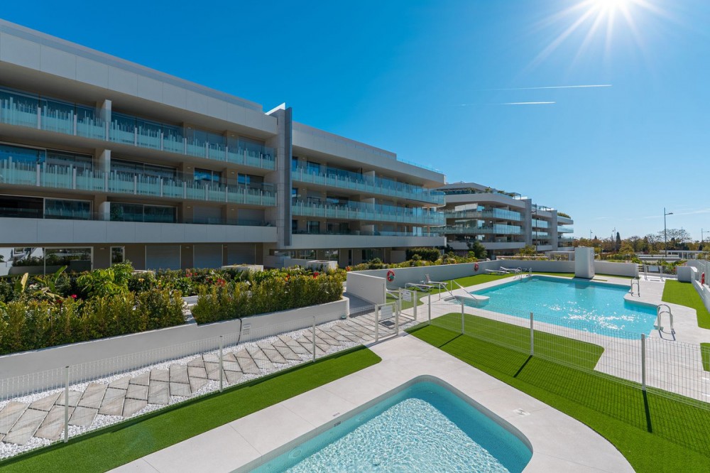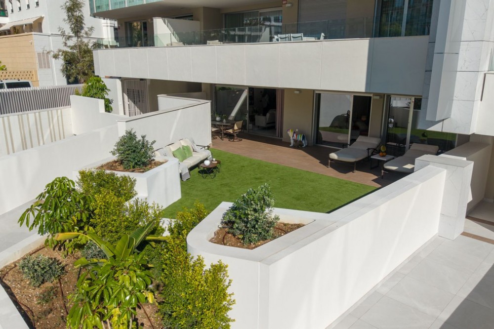 - This elegant 2-bedroom, 2-bathroom ground-floor apartment is located in one of the most desirable areas of the Costa del Sol, just steps from the beach and all essential amenities. Designed for comfort, style, and convenience, this home offers a perfect blend of indoor and outdoor living thanks to its spacious private garden and generous covered terrace. With high-quality finishes throughout, the apartment features a bright open-plan living area, a fully fitted kitchen, and two well-proportioned bedrooms with fitted wardrobes. Large glass doors connect the interior with the outdoor spaces, creating a natural flow ideal for relaxation or entertaining. Set within a contemporary gated community with beautifully maintained gardens and a communal swimming pool, the property also includes private garage parking for one car and additional storage. With amenities, shops, restaurants, schools, playgrounds, and transport links all within walking distance, this home is perfectly positioned for both full-time living and holiday use. Whether as a primary residence or a premium investment opportunity, this apartment stands out for its excellent condition, prime beachside location, and rare combination of private garden and modern design.