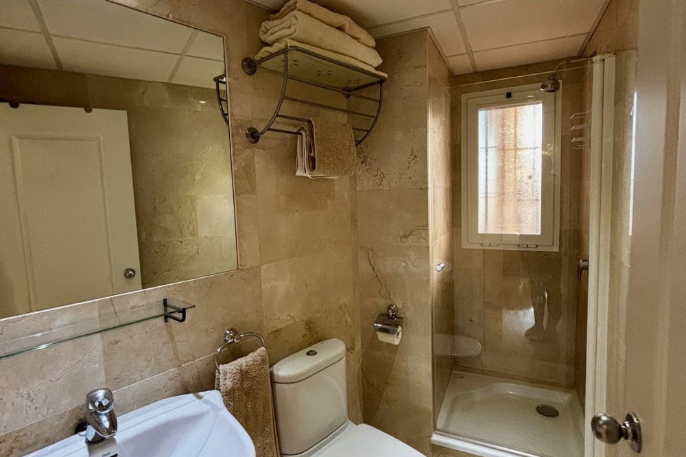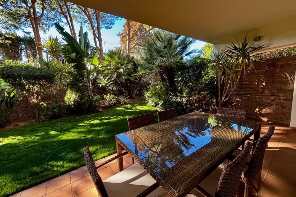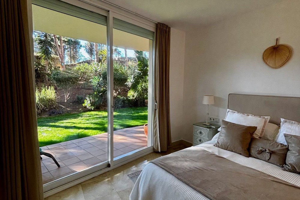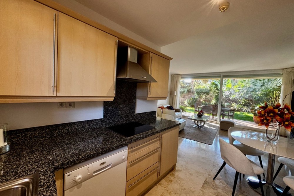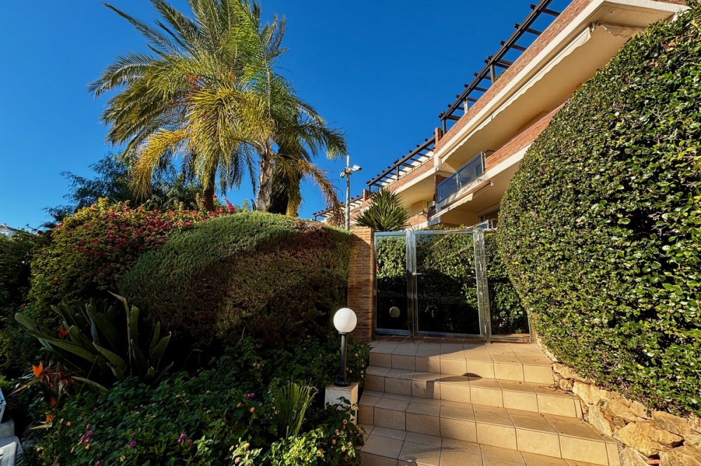 - Discover this elegant 2-bedroom, 2-bathroom ground-floor apartment located in the sought-after Milenio complex in Miraflores, perfectly positioned front line to the golf course. This charming home combines comfort, style, and resort-like amenities—ideal for both full-time living and holiday escapes. Stepping inside, you’ll find a bright, spacious layout with an inviting open-plan living and dining area, flowing seamlessly onto a generous private landscaped garden. Enjoy tranquil views and direct outdoor living—perfect for relaxing, entertaining, or soaking in the peaceful surroundings of the course. The apartment features two well-appointed bedrooms, including a master suite with its own bathroom, along with a modern second bathroom. A fully equipped kitchen offers functionality and convenience. The Milenio community adds to the lifestyle appeal with its beautiful communal swimming pool, complete with a seasonal snack bar, ideal for sunny days by the water. Residents also benefit from access to an on-site gym, well-kept gardens, and a welcoming, secure environment. A rare opportunity to enjoy golf-side living in one of Miraflores’ most desirable developments.