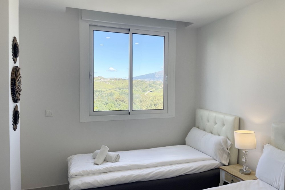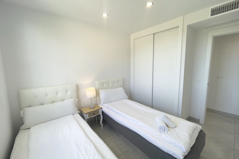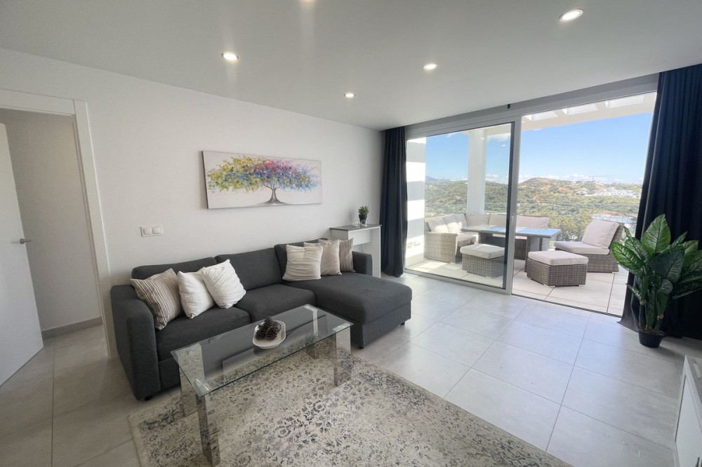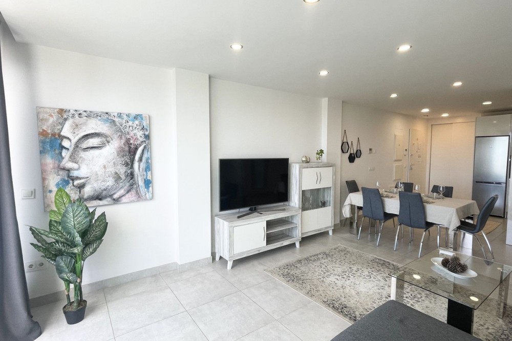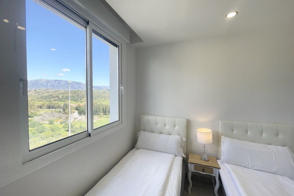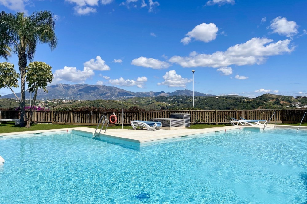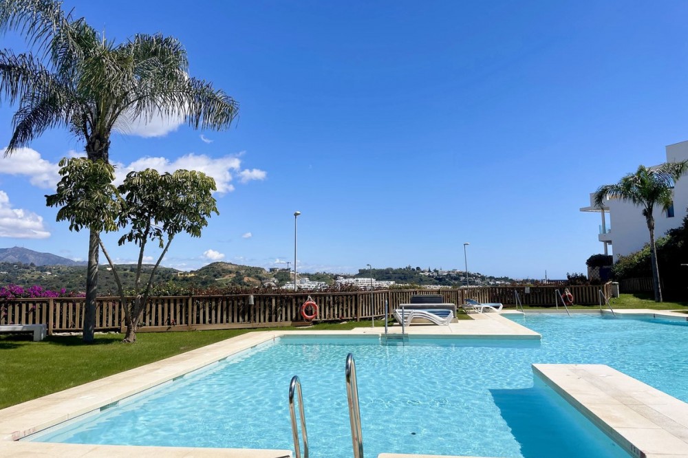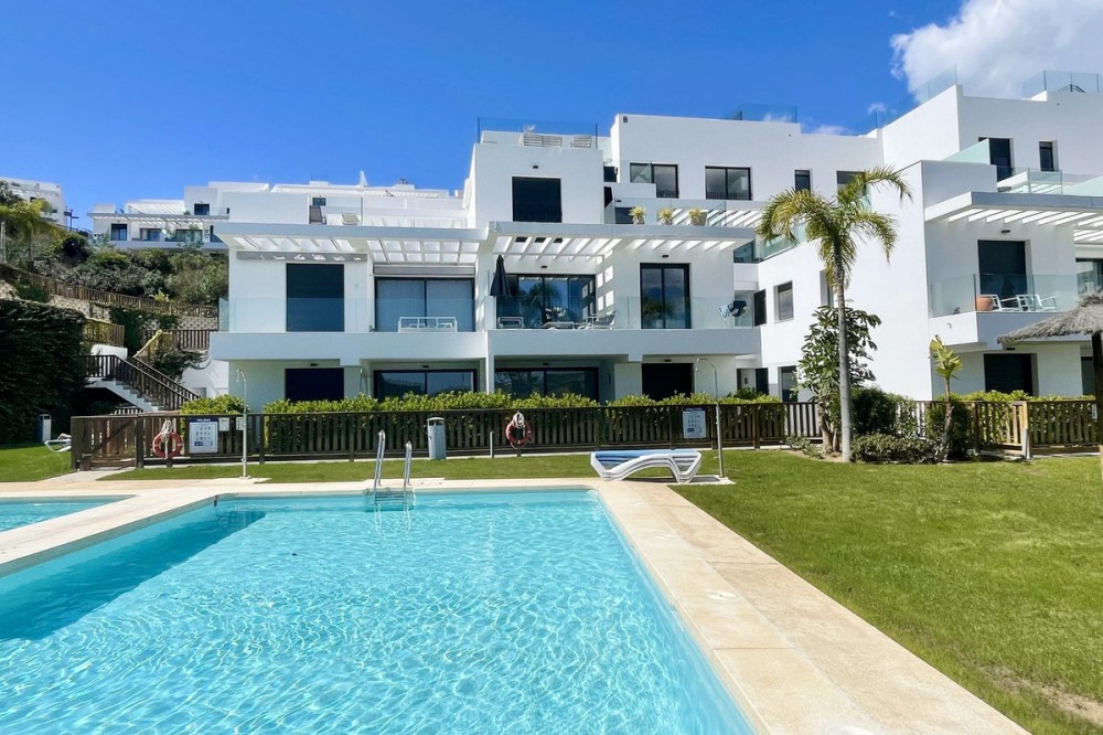 - Welcome to this bright and modern corner apartment in the sought-after Las Banderas complex in La Cala de Mijas! The property features 3 bedrooms, 2 bathrooms, and a spacious terrace with stunning mountain and sea views. The apartment is located on the first floor with elevator access and convenient entry from the private parking space. Upon entering, you are greeted by a bright, open-plan living area where the kitchen and living room seamlessly connect, leading out to the terrace with morning sun. One of the bedrooms is en suite with a private bathroom, while the other two bedrooms share a separate bathroom. All bedrooms feature built-in wardrobes, lush mountain views, and air conditioning throughout for year-round comfort. All windows and glass doors are double-glazed. The gated community has a concierge on site during the day. The beautifully maintained gardens include three outdoor pools, an indoor pool, a social lounge with barbecue area, sauna, gym, paddle tennis court, and a playground for the little ones. The purchase includes one private parking space close to the apartment, a storage room (8 m²), and partial furnishings. La Cala de Mijas offers a perfect mix of sandy beaches, golf, restaurants, shops, and a vibrant town center with a large supermarket – an ideal area for both year-round living and sunny holidays on Costa del Sol. Centrally located along the coast, it is only 15 minutes to Fuengirola and 20 minutes to Marbella, giving you everything within easy reach! Don’t miss the opportunity to book a viewing today!
