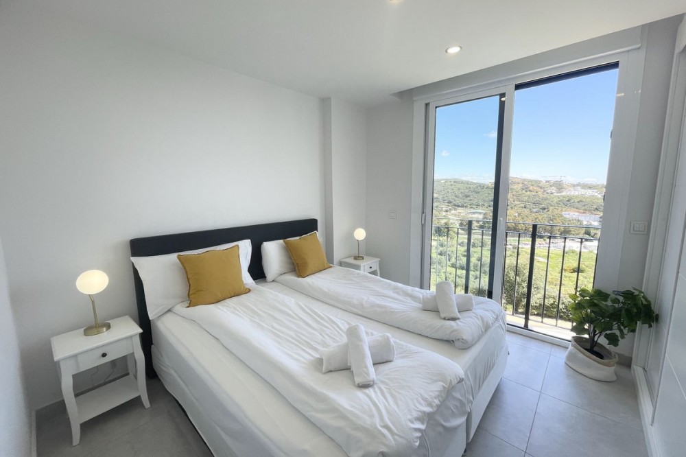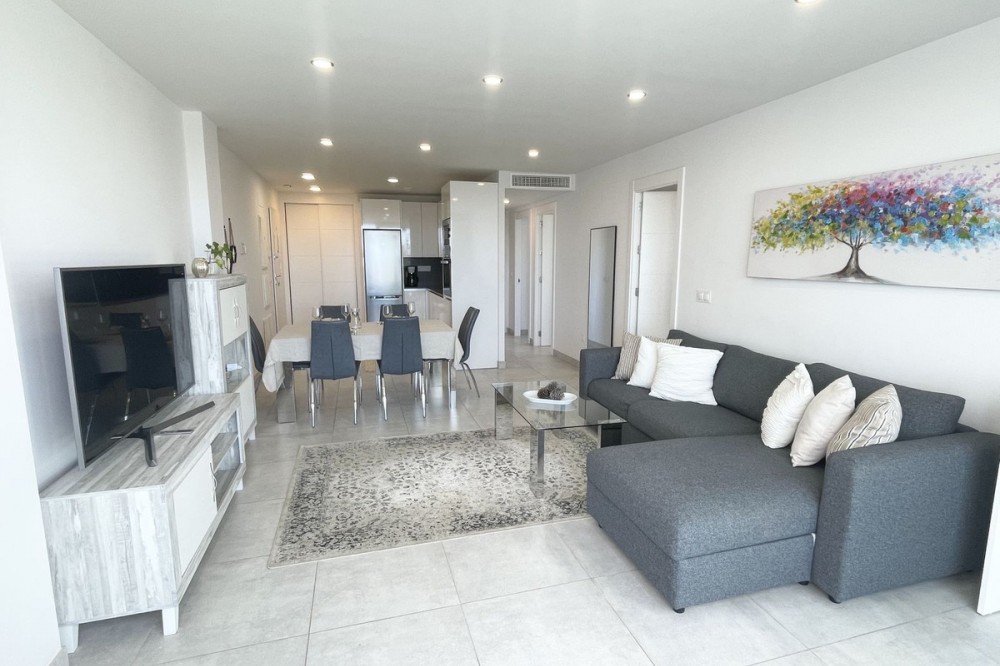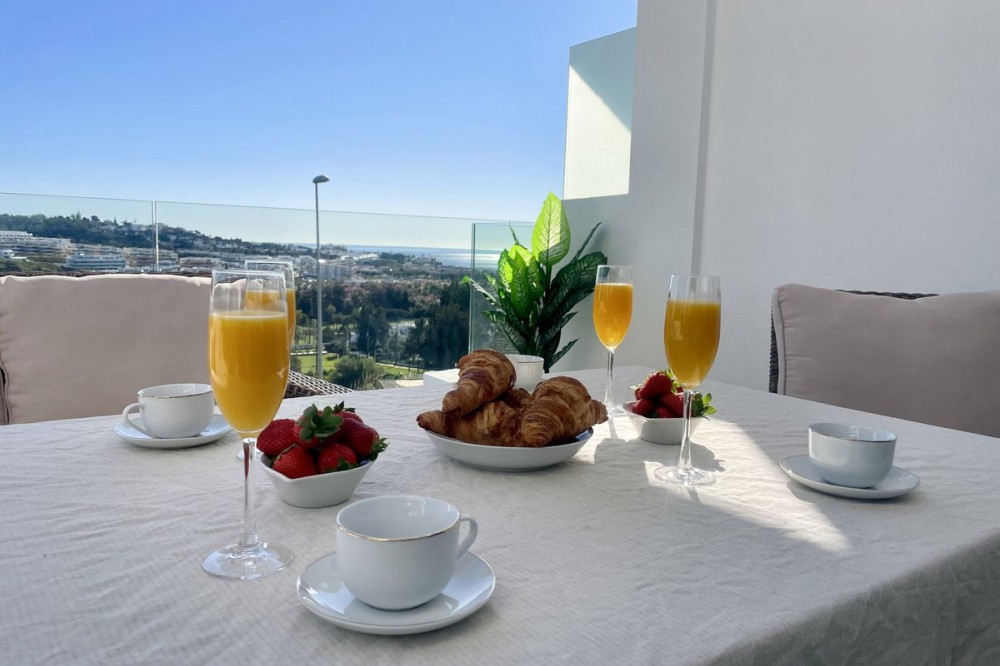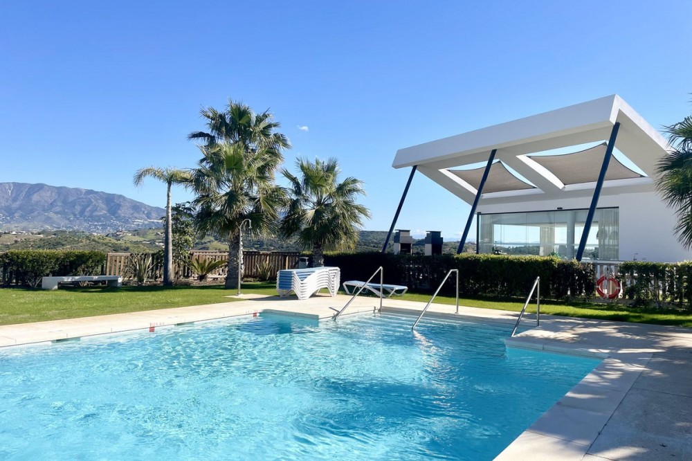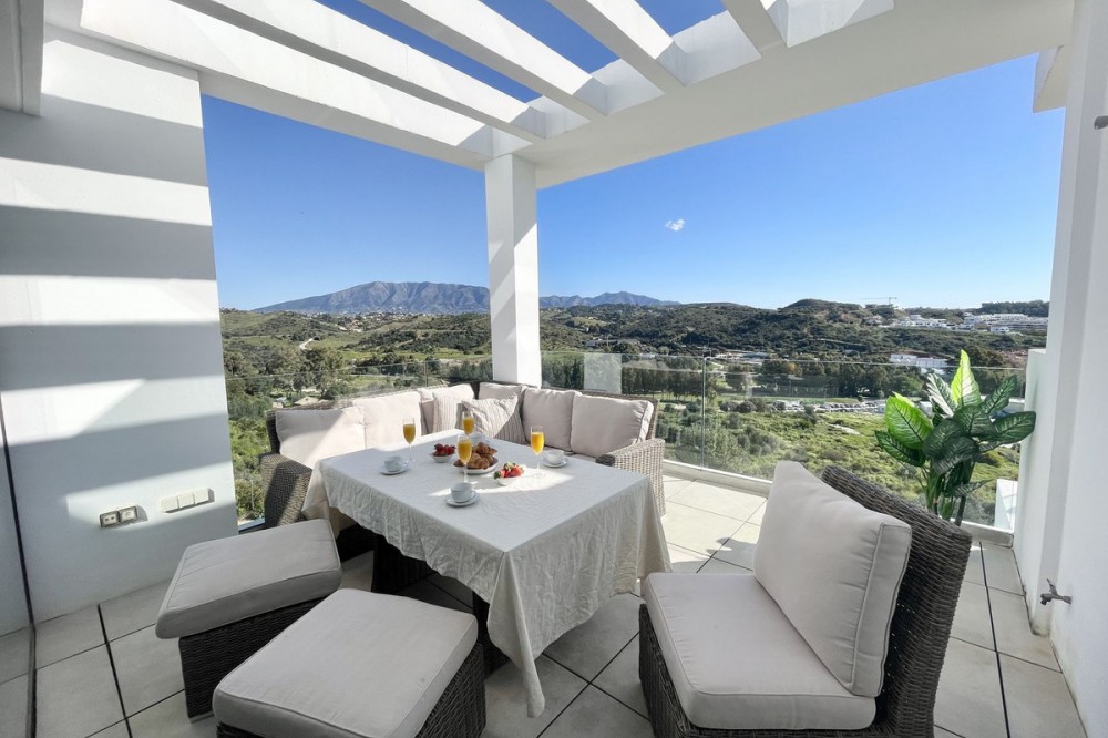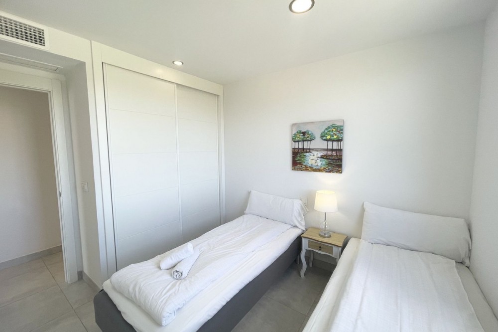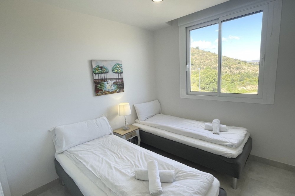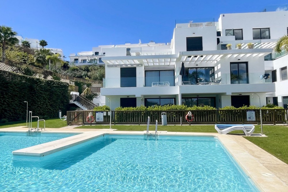 - Welcome to this bright and modern corner apartment in the sought-after Las Banderas complex in La Cala de Mijas! The property features 3 bedrooms, 2 bathrooms, and a spacious terrace with stunning mountain and sea views. The apartment is located on the first floor with elevator access and convenient entry from the private parking space. Upon entering, you are greeted by a bright, open-plan living area where the kitchen and living room seamlessly connect, leading out to the terrace with morning sun. One of the bedrooms is en suite with a private bathroom, while the other two bedrooms share a separate bathroom. All bedrooms feature built-in wardrobes, lush mountain views, and air conditioning throughout for year-round comfort. All windows and glass doors are double-glazed. The gated community has a concierge on site during the day. The beautifully maintained gardens include three outdoor pools, an indoor pool, a social lounge with barbecue area, sauna, gym, paddle tennis court, and a playground for the little ones. The purchase includes one private parking space close to the apartment, a storage room (8 m²), and partial furnishings. La Cala de Mijas offers a perfect mix of sandy beaches, golf, restaurants, shops, and a vibrant town center with a large supermarket – an ideal area for both year-round living and sunny holidays on Costa del Sol. Centrally located along the coast, it is only 15 minutes to Fuengirola and 20 minutes to Marbella, giving you everything within easy reach! Don’t miss the opportunity to book a viewing today!