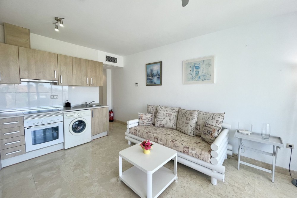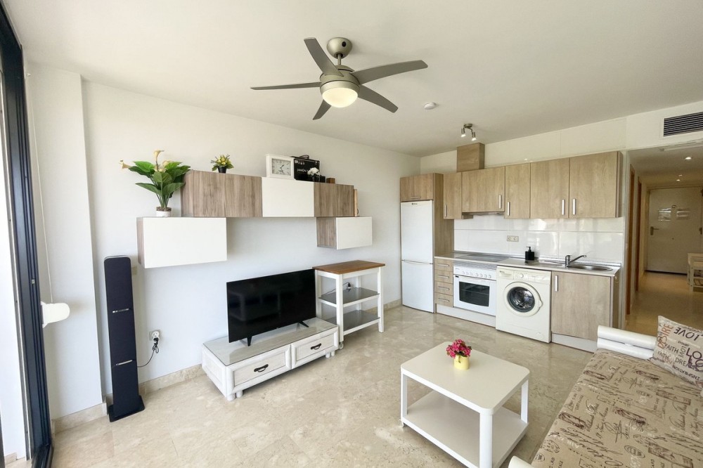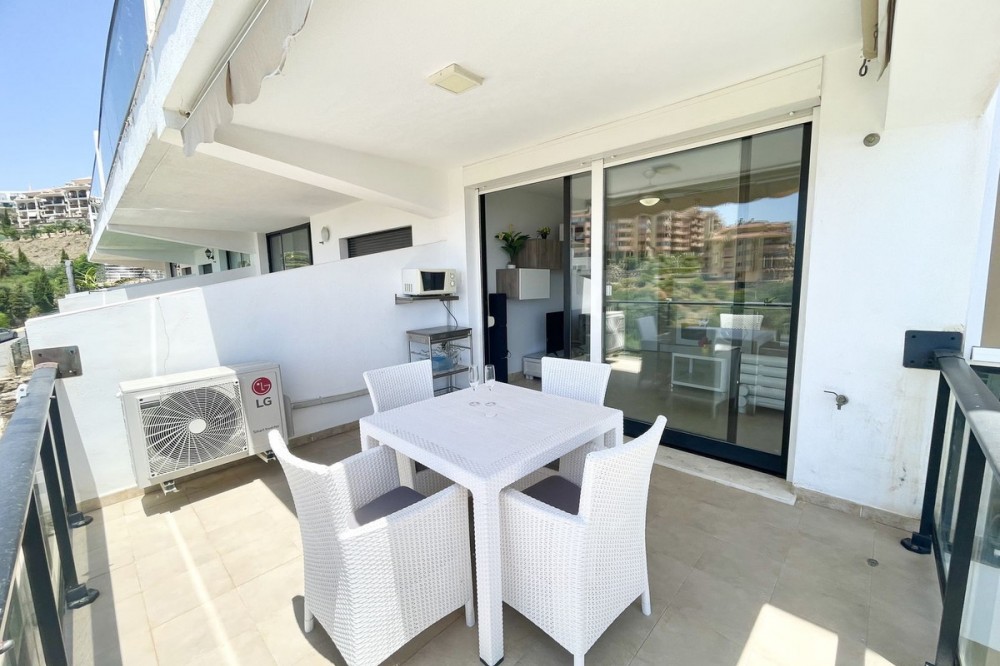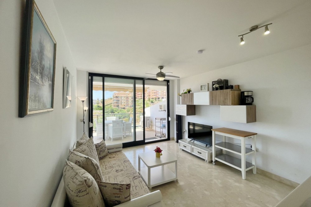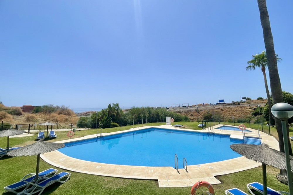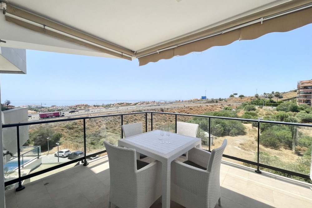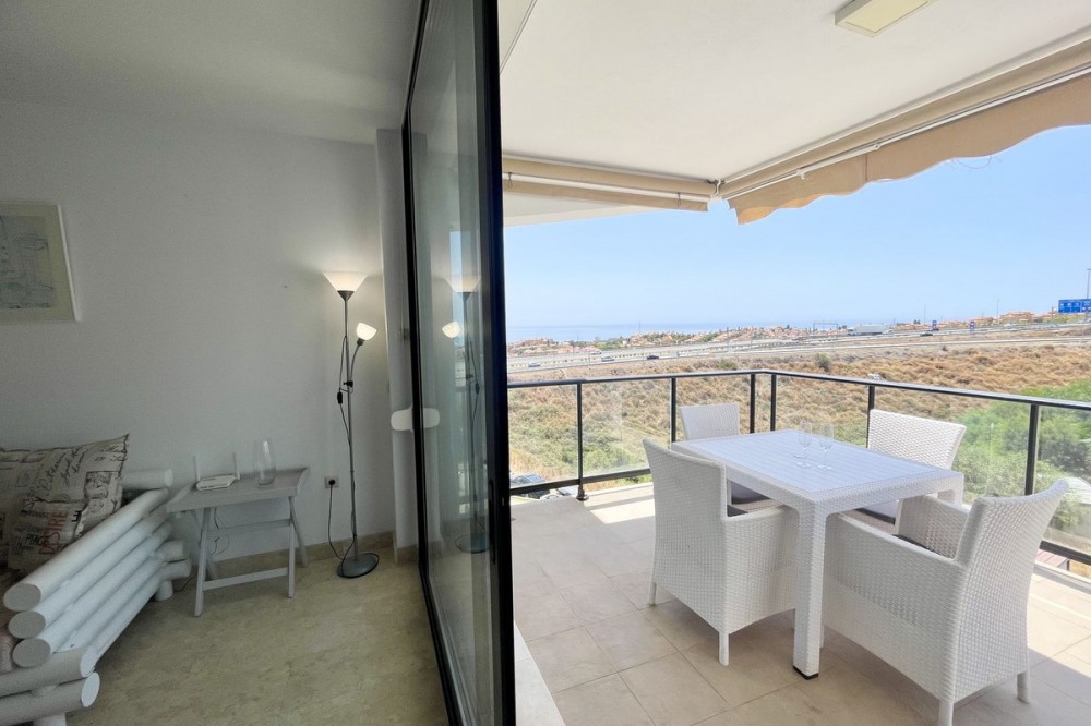 - Welcome to this charming apartment with stunning Mediterranean views and afternoon sun – perfect as a holiday home or permanent residence. The property features a spacious bedroom with built-in wardrobes and ceiling fan, fully tiled bathroom with shower, and a bright open-plan living room connected to a fully equipped kitchen with fridge/freezer, oven, and washing machine. From the living room, step out onto the generous terrace with panoramic sea and garden views – ideal for year-round enjoyment. Located on the first floor with elevator access from the garage, the apartment includes furniture, private parking, storage, and central AC throughout. The well-maintained community offers landscaped gardens and a communal pool – a perfect oasis for relaxation. Riviera del Sol enjoys an ideal location between Marbella and Fuengirola, close to beaches, golf courses, restaurants, and all amenities. With easy access to the AP-7 and just 25 minutes to Málaga airport, it’s a strategic choice for living or investment. Don’t miss out – contact us today to arrange a viewing!
