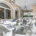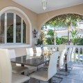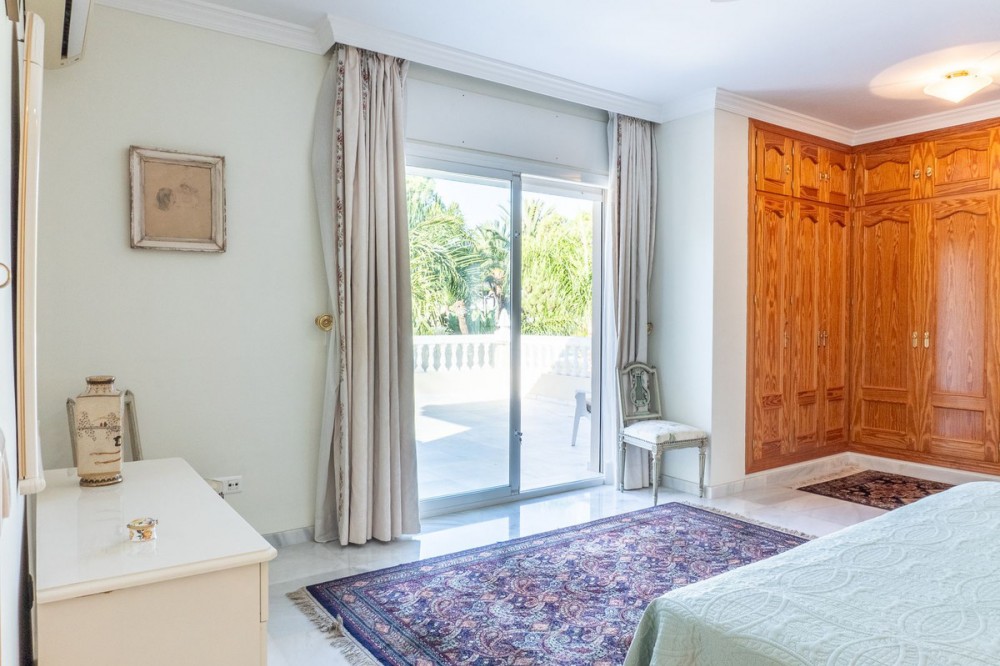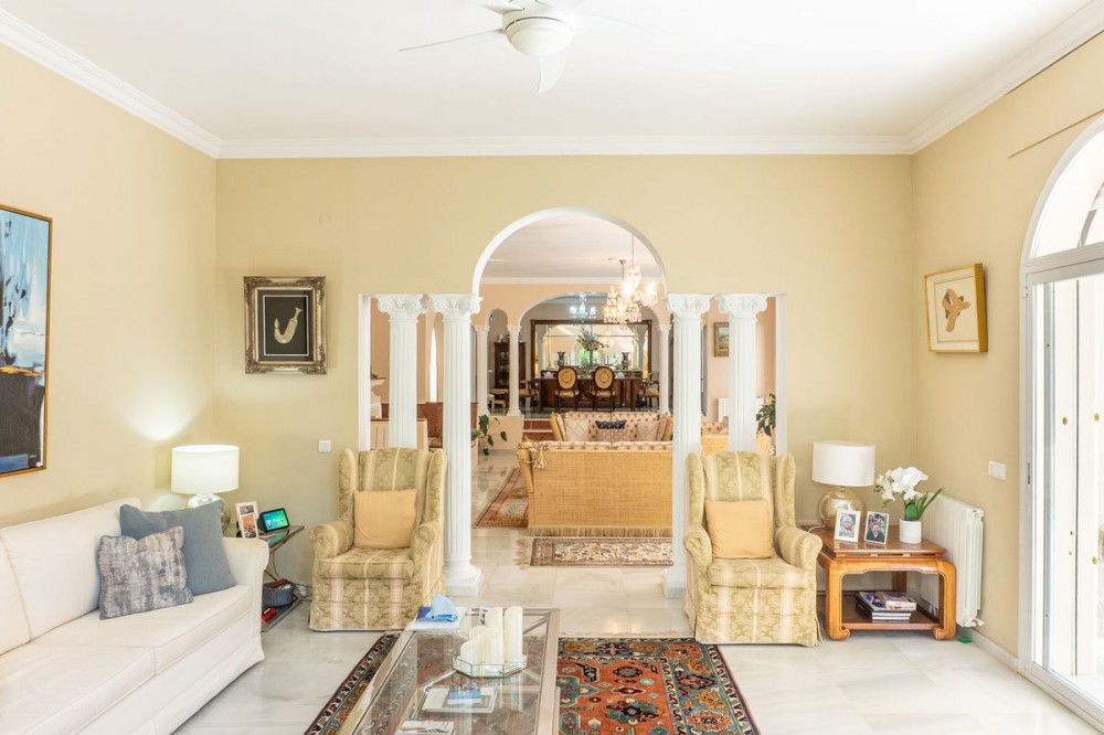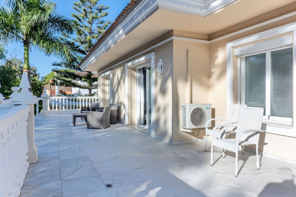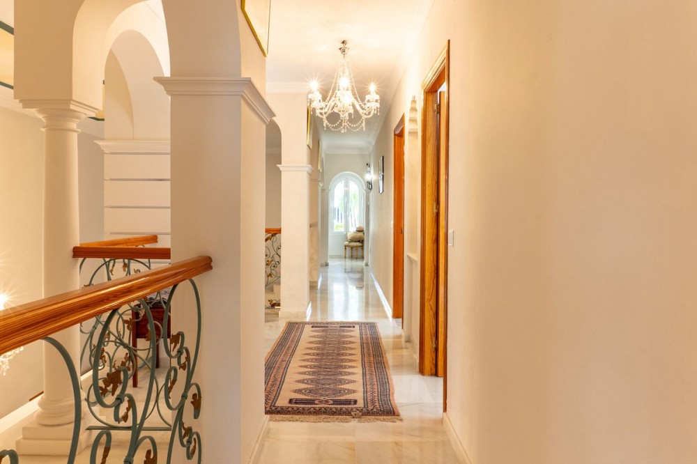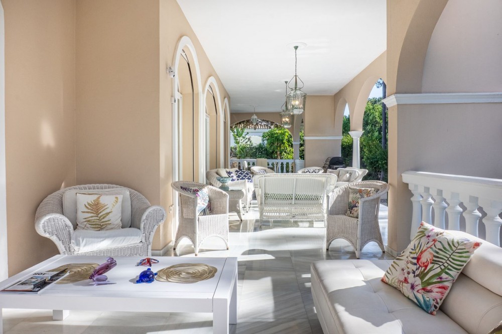 - This magnificent traditional-style villa is located in the exclusive New Golden Mile, within the prestigious El Presidente community, just 50 metres from the beach and its newly built seaside promenade. The location is exceptional, surrounded by all kinds of amenities and only five minutes’ drive from Puerto Banús and ten minutes from both Marbella and Estepona. The property sits on a 1,275 m² plot and offers 539 m² built, including 461 m² of internal living space and 80 m² of terraces, all facing south to ensure exceptional brightness throughout the day. Upon entering the villa, you are greeted by a spacious and luminous main living room featuring large windows that fill the space with natural light and provide seamless access to the terrace and the beautifully maintained garden. On this floor there is also a cozy tea room, a generous kitchen and dining area, a laundry room, a bedroom with an en-suite bathroom and walk-in wardrobe, as well as a guest bathroom. A large garage and several storage areas complement this level. The upper floor hosts the remaining four bedrooms, all exceptionally spacious, each with its own en-suite bathroom and direct access to large terraces that benefit from the south-facing orientation and pleasant open views. The property stands out for its charming traditional architecture, high ceilings, excellent condition and abundant natural light in every corner. This is a unique home, perfect as a family residence or as an investment opportunity in one of the most sought-after locations on the Costa del Sol.