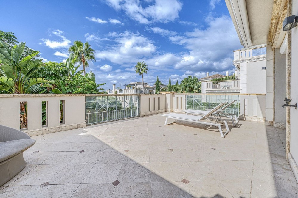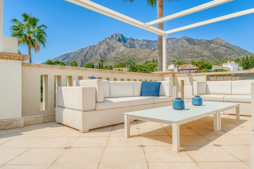 - NEW ON THE MARKET. Sierra Blanca Del Mar - Sierra Blanca (Golden Mile) Discover unparalleled elegance in this exclusive luxury semi-detached villa, nestled within the prestigious area of Sierra Blanca — one of Marbella’s premier residential enclaves. This home delivers the grandeur of a spacious villa, featuring state-of-the-art installations, premium materials, and impeccable finishes, all complemented by breathtaking views. The gated urbanisation boasts lush communal spaces adorned with serene water features, enhancing the sense of refined tranquility. Spanning four levels— from basement to solarium— the villa offers thoughtful design and versatility. On the ground floor, an inviting entrance hall leads to a fully equipped Gaggenau kitchen with a cozy breakfast nook, flowing into a generous living and dining area that opens to a covered terrace and private garden. A guest bathroom completes this level. The first floor hosts the master suite with an en-suite bathroom connected to a large private sunny terrace with electric awnings, plus two additional guest bedrooms, each with en-suite bathrooms and terrace access. Ascend to the solarium for ultimate relaxation: a heated plunge pool with an electric cover, expansive terrace, lounge area, and panoramic coastal, sea and mountain views. The basement provides further indulgence with two bedrooms and bathrooms, a versatile office or multi-purpose room, laundry and storage areas, a soothing sauna, and a private underground garage for two cars with direct interior access. Standout amenities elevate everyday living: marble flooring, a private elevator connecting all levels, private rooftop pool (heated), underfloor heating throughout, central air conditioning and heating, a central vacuuming system, and a fully equipped Gaggenau kitchen. Offered fully furnished, this exceptional residence in a secure gated community stands as a rare jewel in Marbella’s most coveted locale. The property also benefits of having a valid Touristic License. Notable Features: Luxury Residence - Timeless & Elegant Design Private Pool – Rooftop Plunge Pool (Heated w/ Cover) Sea Views – Stunning Panoramic Sea & Coastal Views from the solarium AAA Location – Exclusive Secure Gated Community with CCTV cameras Other Features – Elevator to all floors, Underfloor Heating Throughout, Sauna, Underground Garage w/ Direct Interior Access