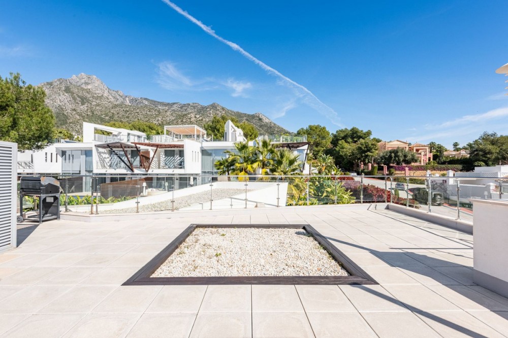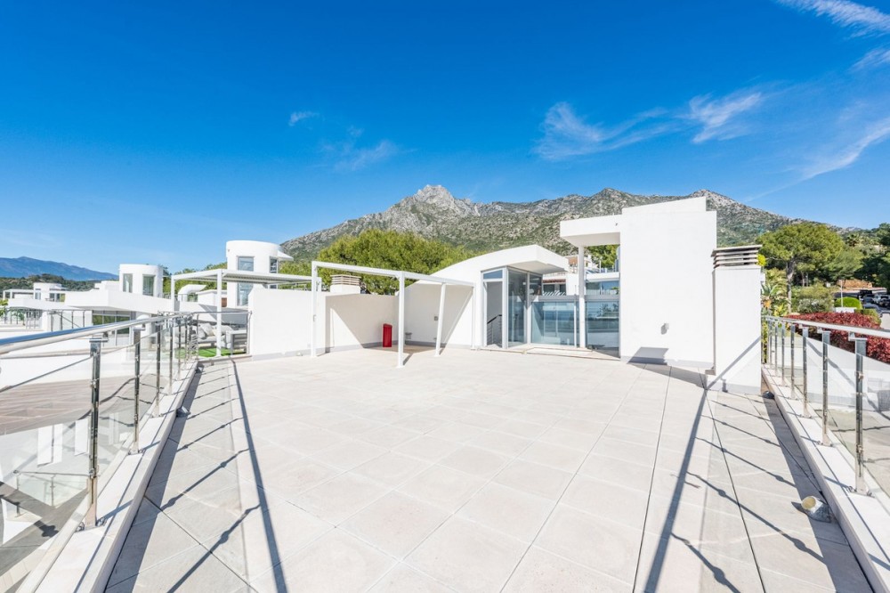 - An Exceptional Luxury Residence on Marbella’s Golden Mile Set within the prestigious Meisho Hills enclave on Marbella’s sought-after Golden Mile, this outstanding semi-detached luxury residence offers an unrivalled blend of elegance, privacy and prime location. Designed to meet the highest standards, the property features five generously sized bedrooms and five bathrooms, four of them en suite, delivering refined comfort and sophistication throughout. The home sits on a total plot of 845 m², with 385 m² of beautifully designed interior space, complemented by an impressive 89 m² of terraces and a 42 m² private plot. A private swimming pool and breathtaking sea and mountain views create a serene Mediterranean atmosphere, enjoyed from both the private garden and the meticulously maintained communal areas. Fully furnished and finished to the highest specifications, the interior showcases elegant parquet and stoneware flooring, underfloor heating in the bathrooms, and a cutting-edge home automation system. Year-round comfort is ensured with air conditioning, high-speed fibre optic internet, and Wi-Fi connectivity throughout the property. This exceptional home offers an extensive range of luxury amenities, including a fully fitted designer kitchen, utility room, private gym, and a lavish indoor heated swimming pool with Jacuzzi, providing a true wellness retreat within your own home. Additional features include a spacious basement, storage room, guest bedroom, and a custom-made walk-in wardrobe, all designed to enhance both comfort and practicality. The open-plan living and dining areas flow seamlessly onto covered and uncovered terraces, ideal for entertaining or relaxing in Marbella’s privileged climate, while a guest toilet adds further convenience. Located within a secure gated community, the property benefits from 24-hour security, surveillance cameras, armoured entrance door, concierge service, and lift access. Perfectly positioned close to top international schools, fine dining, luxury boutiques and the beach, this residence is more than just a home—it is a statement of lifestyle and exclusivity in one of Marbella’s most prestigious locations.
