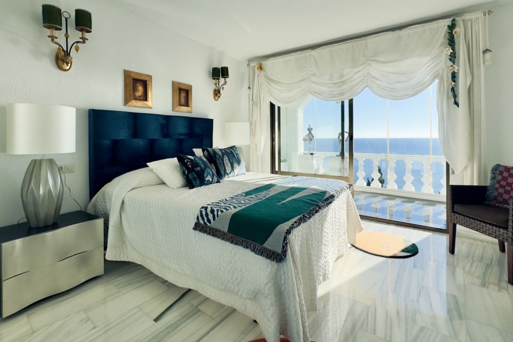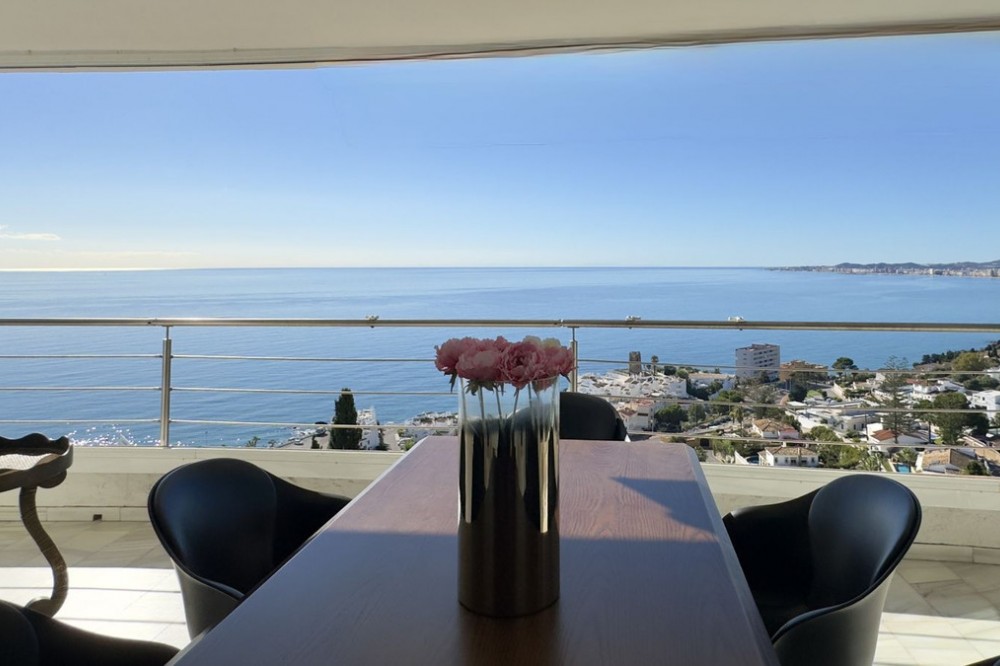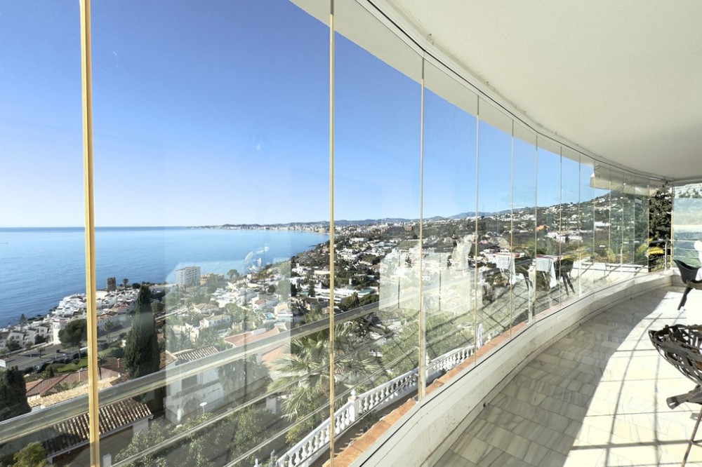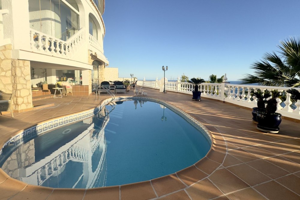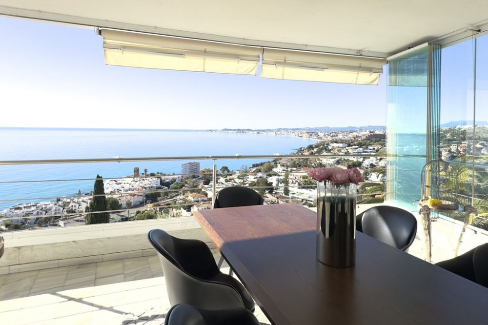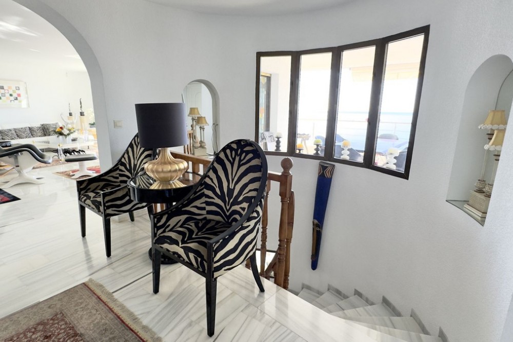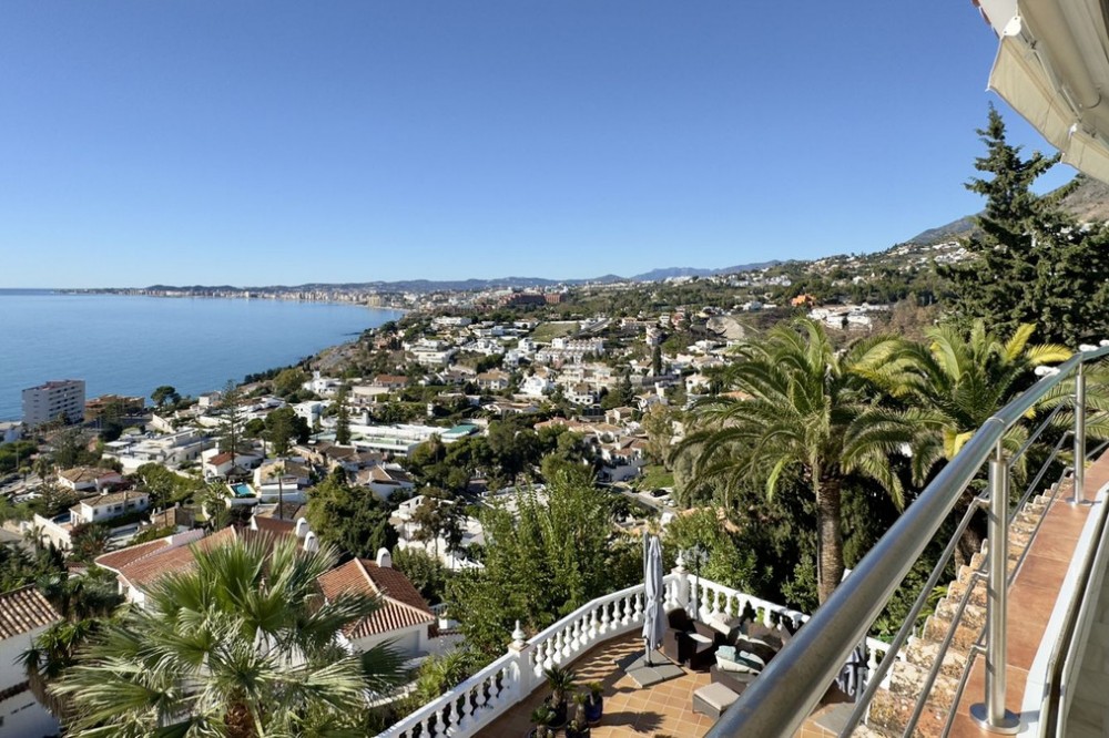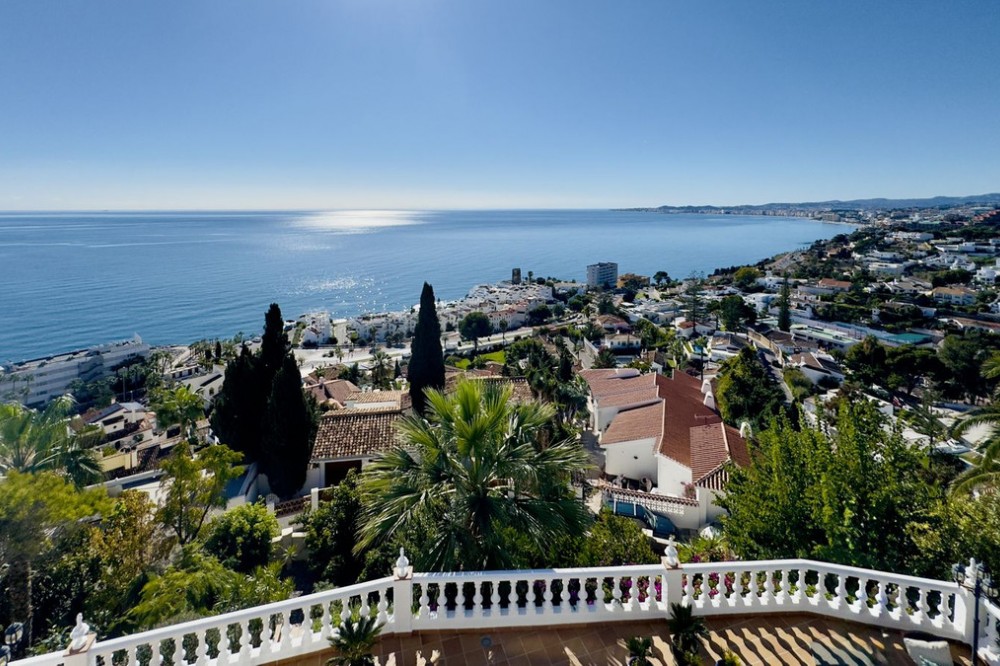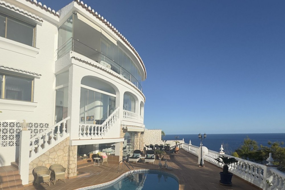 - Commanding a privileged position in an elevated coastal setting within one of Benalmádena’s most prestigious enclaves, this exceptional villa stands as a distinguished landmark. From its gently raised vantage point, it reveals sweeping, majestic views over the shimmering Mediterranean Sea—an ever-changing panorama that embodies true coastal luxury. Offering approximately 590 m² of refined living space, the property blends impressive architectural design, timeless elegance and outstanding privacy, creating a perfect sanctuary for those seeking uncompromising quality and exclusivity. Perfectly placed to enhance everyday living, the villa is just a short walk from the Torremuelle train station, the beach, inviting restaurants, local boutique shops, and a highly regarded international school. Excellent transport connections and a private garage complete this thoughtful and privileged setting. Main Living Level The principal floor welcomes you into a bright and spacious living area that opens onto a full-length glazed terrace. This impressive terrace frames the coastline in all its splendour, presenting the sea as a living work of art. The elegant dining area sits beside a separate, fully equipped kitchen, forming a sophisticated and functional layout that beautifully showcases the breathtaking views. Bedroom Level The dedicated bedroom floor hosts four remarkably large bedrooms, each offering wide, unobstructed sea views. This level also includes a cosy lounge, three beautifully finished bathrooms, a utility room and a second glazed terrace—a serene viewpoint overlooking the coastline. Pool & Entertainment Level Designed for relaxation and elegant gatherings, this level features a generous terrace surrounding the private pool, all embraced by spectacular, picture-perfect sea views. A dedicated lounge and dining area, together with a fully equipped kitchen, ensures effortless entertaining in a luxurious coastal atmosphere. Wellbeing Level The lowest floor is dedicated to tranquillity and wellness. Here you will find a soothing sauna, a comfortable living room and a private bedroom. Direct access leads to a landscaped garden where a welcoming jacuzzi awaits—an intimate outdoor haven set against cinematic Mediterranean vistas. This villa is more than a home—it is an expression of luxury, privacy and coastal beauty, representing a rare opportunity in one of the most sought-after locations on the entire Costa del Sol.