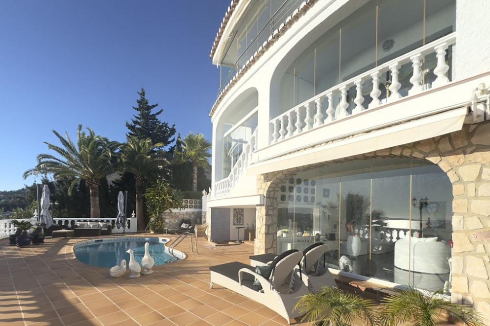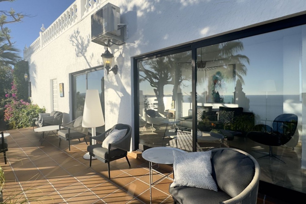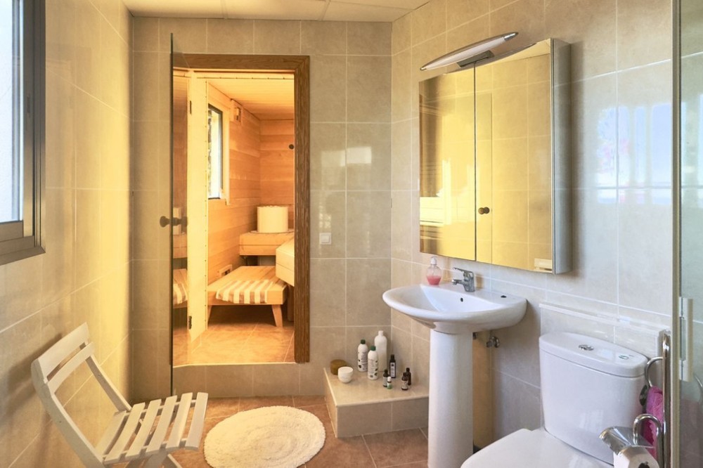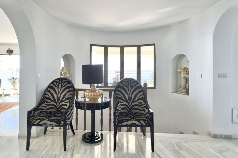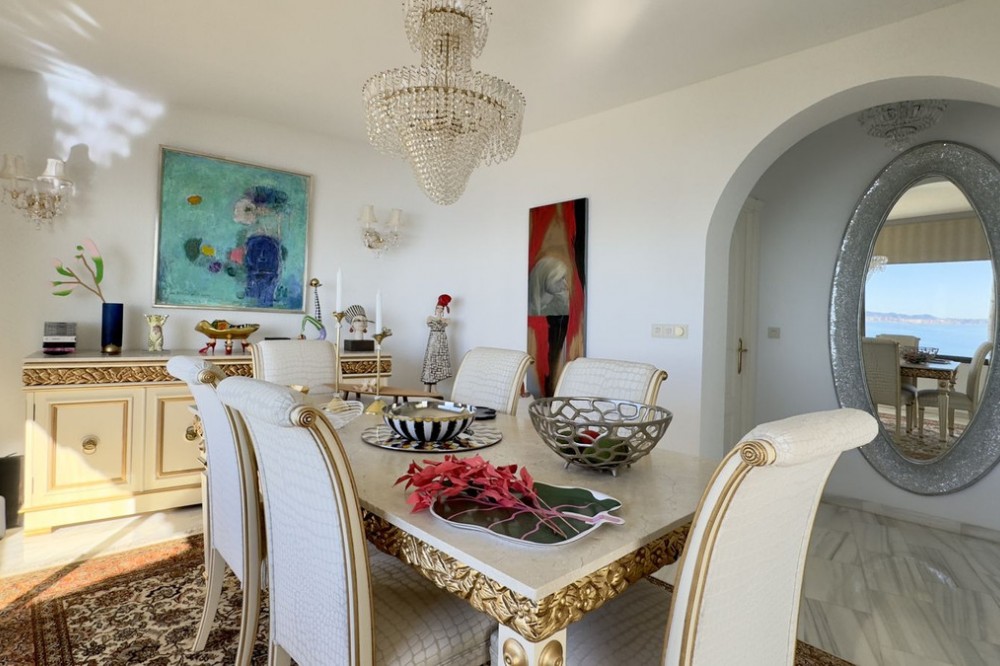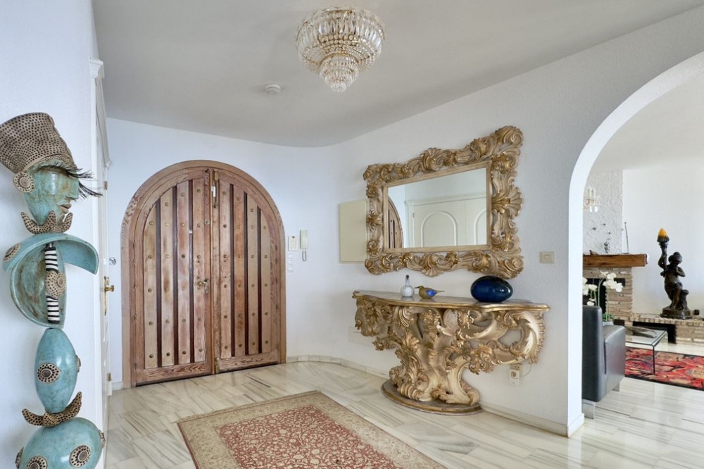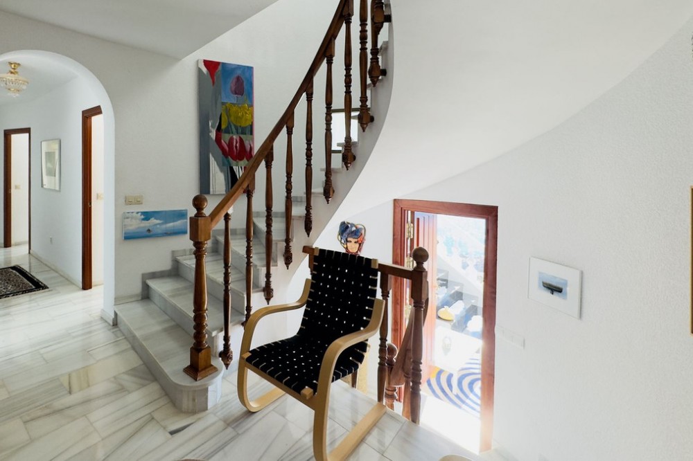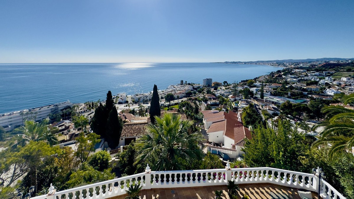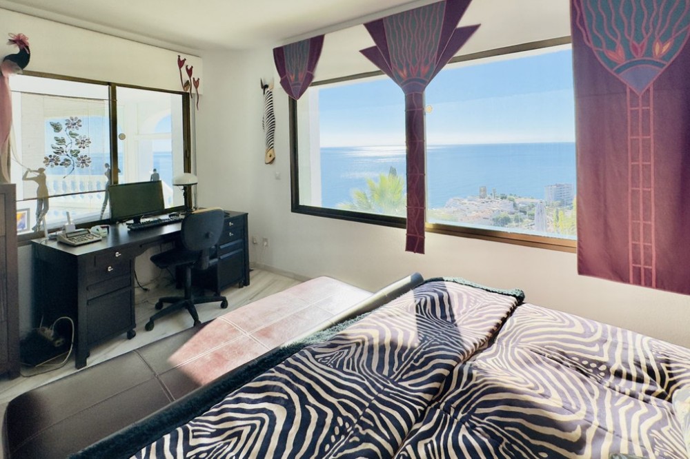 - Commanding a privileged position in an elevated coastal setting within one of Benalmádena’s most prestigious enclaves, this exceptional villa stands as a distinguished landmark. From its gently raised vantage point, it reveals sweeping, majestic views over the shimmering Mediterranean Sea—an ever-changing panorama that embodies true coastal luxury. Offering approximately 590 m² of refined living space, the property blends impressive architectural design, timeless elegance and outstanding privacy, creating a perfect sanctuary for those seeking uncompromising quality and exclusivity. Perfectly placed to enhance everyday living, the villa is just a short walk from the Torremuelle train station, the beach, inviting restaurants, local boutique shops, and a highly regarded international school. Excellent transport connections and a private garage complete this thoughtful and privileged setting. Main Living Level The principal floor welcomes you into a bright and spacious living area that opens onto a full-length glazed terrace. This impressive terrace frames the coastline in all its splendour, presenting the sea as a living work of art. The elegant dining area sits beside a separate, fully equipped kitchen, forming a sophisticated and functional layout that beautifully showcases the breathtaking views. Bedroom Level The dedicated bedroom floor hosts four remarkably large bedrooms, each offering wide, unobstructed sea views. This level also includes a cosy lounge, three beautifully finished bathrooms, a utility room and a second glazed terrace—a serene viewpoint overlooking the coastline. Pool & Entertainment Level Designed for relaxation and elegant gatherings, this level features a generous terrace surrounding the private pool, all embraced by spectacular, picture-perfect sea views. A dedicated lounge and dining area, together with a fully equipped kitchen, ensures effortless entertaining in a luxurious coastal atmosphere. Wellbeing Level The lowest floor is dedicated to tranquillity and wellness. Here you will find a soothing sauna, a comfortable living room and a private bedroom. Direct access leads to a landscaped garden where a welcoming jacuzzi awaits—an intimate outdoor haven set against cinematic Mediterranean vistas. This villa is more than a home—it is an expression of luxury, privacy and coastal beauty, representing a rare opportunity in one of the most sought-after locations on the entire Costa del Sol.
