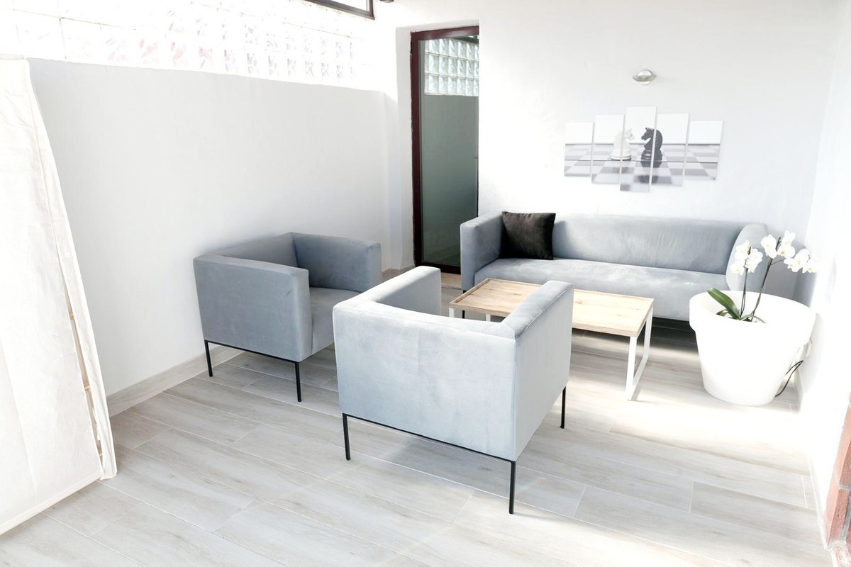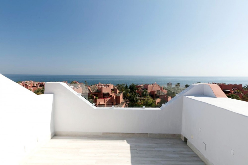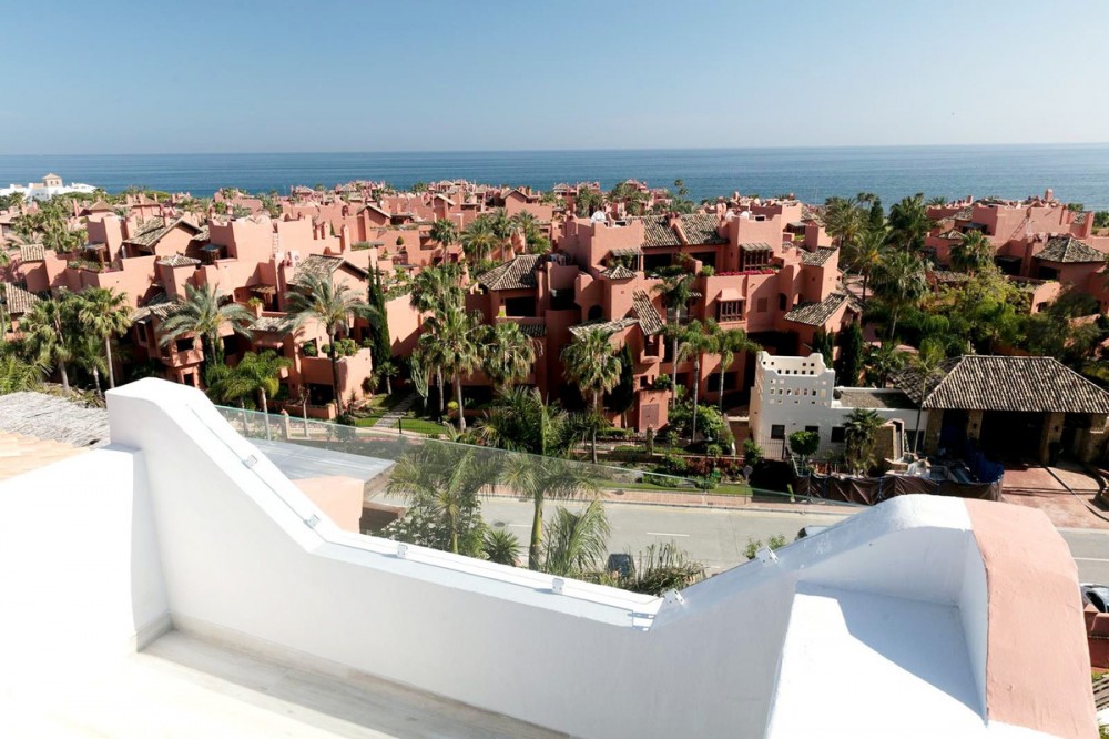 - For sale a stylish, fully renovated 3-bedroom penthouse in the prestigious gated community Las Nayades on the New Golden Mile, just a two-minute walk from the beach. The complex offers top-class amenities: 24/7 security, beautifully maintained tropical gardens, an outdoor pool, heated indoor pool, gym and sauna. The promenade with shops, cafés and restaurants is right nearby. The duplex penthouse features: — A spacious living-dining area with panoramic sea views and access to a sunny south-facing terrace — A modern fully equipped kitchen — Two bedrooms on the main floor (one with an en-suite bathroom) plus an additional bathroom — A third bedroom on the upper level with access to an impressive private solarium overlooking the sea and Gibraltar Extras include: smart home system, hot/cold air conditioning, alarm system, fitted wardrobes, electric shutters, and a private underground parking space. An ideal property for those seeking comfort, quality and a prime seaside location with stunning sea views.