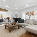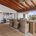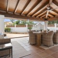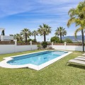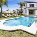 - Nestled in the serene Las Chapas Playa, 300 meters from the sandy shores, awaits a stunning 5-bedroom, 6 bathroom villa. This idyllic property is conveniently situated just a 5-minute drive from Marbella Centre and a 40-minute journey from Malaga Airport, ensuring both accessibility and tranquility. Upon entry, to the right you find the garden, showcasing a large swimming pool. To the left, an outdoor bathroom with a shower and toilet ready for post-beach refreshment. Stepping through the wooden doors, you are welcomed into an exquisite foyer adorned with a staircase and lofty ceilings. To the left, the first bedroom awaits, boasting a double bed and an ensuite bathroom. The second bedroom, adorned with two single beds, also offers its own ensuite bathroom. On this floor there is also a guest toilet. On the opposite side, the kitchen and dining area beckon with expansive glass windows, seamlessly merging indoor and outdoor living. Accessible from here is the capacious covered terrace, complete with a dining table and inviting lounge area perfect for gatherings on those hot and sunny days. Continuing the journey, a spacious living room and a chic bar awaits,, offering a great space for relaxation and entertainment. Ascending the staircase, two additional bedrooms reveal themselves, each exuding comfort and elegance. The master suite boasts an ensuite bathroom featuring a luxurious bathtub and shower, accompanied by a generous private terrace boasting great sea views. The fourth bedroom provides a cozy retreat with a double bed and a cute lounge area with a sofa. Behind the villa you find a secluded guest apartment complete with a living room, compact kitchen, a double bedroom, and a bathroom—providing an ideal sanctuary for additional privacy or visiting guests. Convenience is assured with a garage offering space for a car, although ample street parking is readily available right in front of the villa. Walking along the nearby beach you'll find lots of charming restaurants and bars. Among the favorites are Nosso Beach, Oyana Beach.