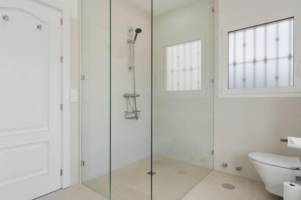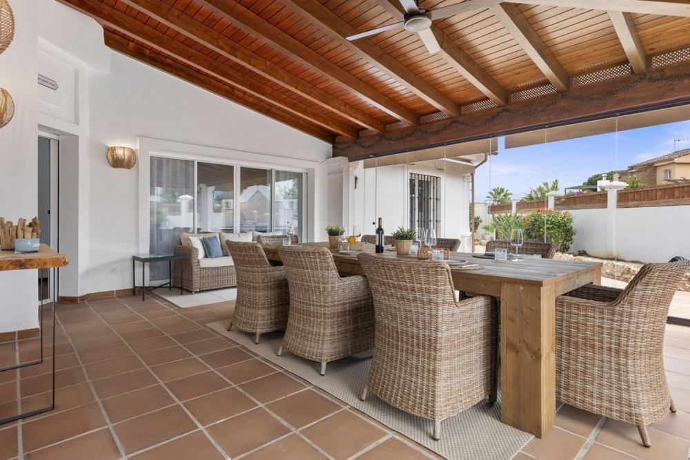 - Nestled in the serene Las Chapas Playa, 300 meters from the sandy shores, awaits a stunning 5-bedroom, 6 bathroom villa. This idyllic property is conveniently situated just a 5-minute drive from Marbella Centre and a 40-minute journey from Malaga Airport, ensuring both accessibility and tranquility. Upon entry, to the right you find the garden, showcasing a large swimming pool. To the left, an outdoor bathroom with a shower and toilet ready for post-beach refreshment. Stepping through the wooden doors, you are welcomed into an exquisite foyer adorned with a staircase and lofty ceilings. To the left, the first bedroom awaits, boasting a double bed and an ensuite bathroom. The second bedroom, adorned with two single beds, also offers its own ensuite bathroom. On this floor there is also a guest toilet. On the opposite side, the kitchen and dining area beckon with expansive glass windows, seamlessly merging indoor and outdoor living. Accessible from here is the capacious covered terrace, complete with a dining table and inviting lounge area perfect for gatherings on those hot and sunny days. Continuing the journey, a spacious living room and a chic bar awaits,, offering a great space for relaxation and entertainment. Ascending the staircase, two additional bedrooms reveal themselves, each exuding comfort and elegance. The master suite boasts an ensuite bathroom featuring a luxurious bathtub and shower, accompanied by a generous private terrace boasting great sea views. The fourth bedroom provides a cozy retreat with a double bed and a cute lounge area with a sofa. Behind the villa you find a secluded guest apartment complete with a living room, compact kitchen, a double bedroom, and a bathroom—providing an ideal sanctuary for additional privacy or visiting guests. Convenience is assured with a garage offering space for a car, although ample street parking is readily available right in front of the villa. Walking along the nearby beach you'll find lots of charming restaurants and bars. Among the favorites are Nosso Beach, Oyana Beach.