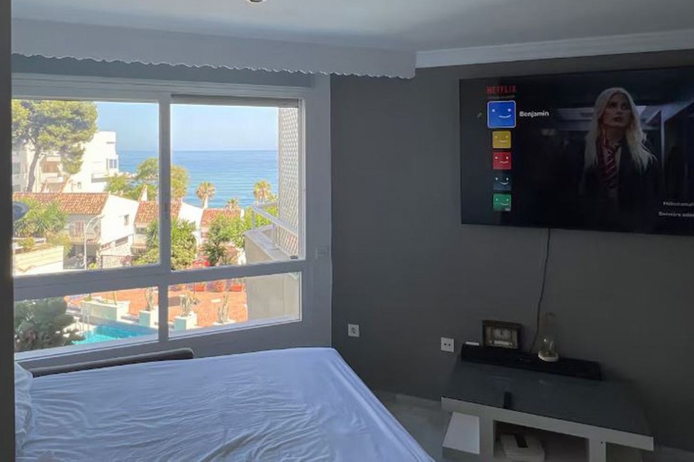 - Beautiful, fully furnished and equipped studio apartment located in an iconic Marbella building, just steps from the beach in the town center and its promenade. South-facing, it has a total built area of 52 m². The layout includes an entrance hall, separate bedroom, bathroom, fully furnished and equipped kitchen, and living/dining room. Enjoy stunning views of the sea, garden, and communal pool. Ideal as an investment, holiday home, or for those who prefer to be close to all amenities and the charm of Marbella. High-quality construction, air conditioning, concierge service, well-maintained common areas, and a beautiful garden with a communal pool. A select community of residents where tourist rental licenses are not granted.