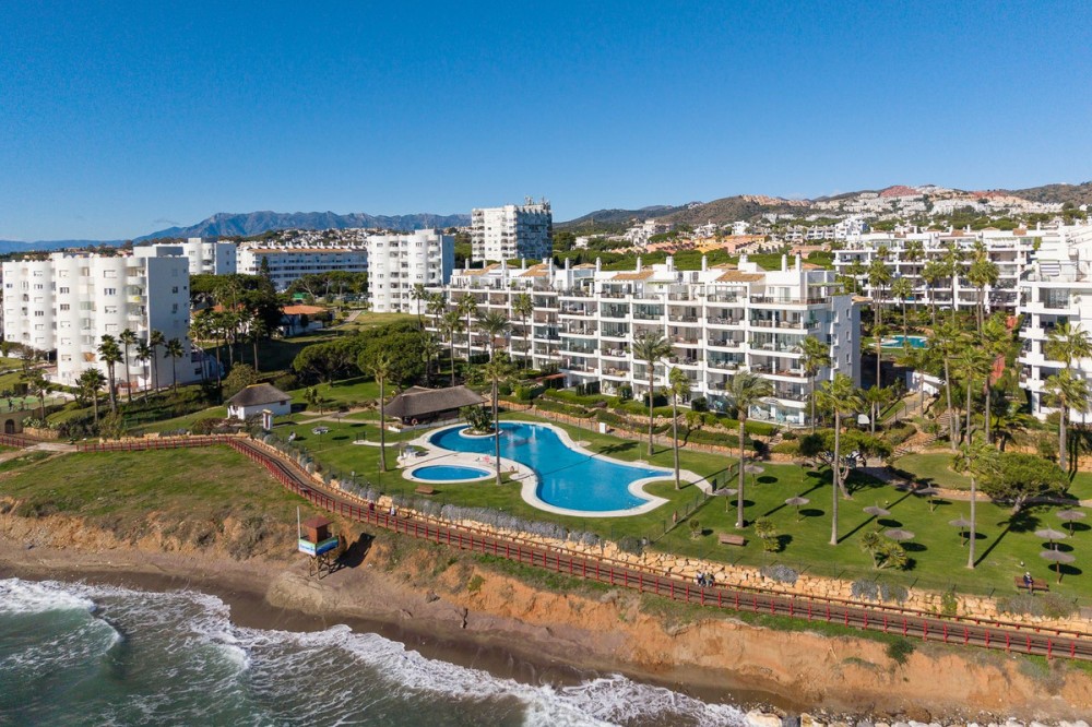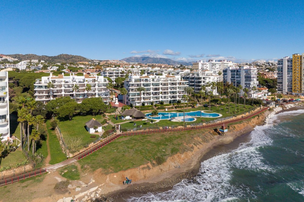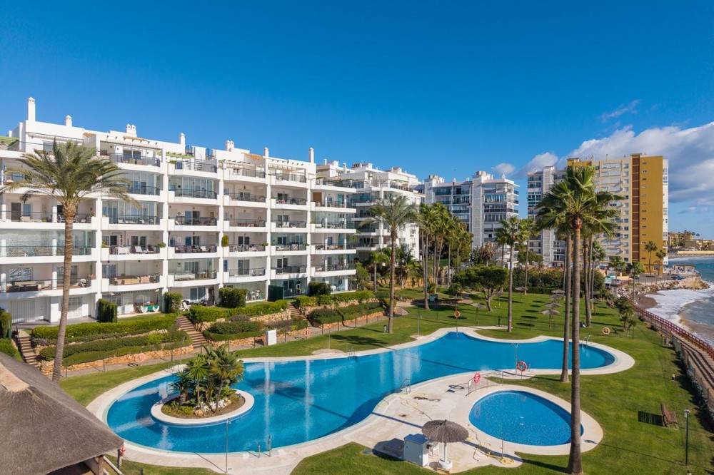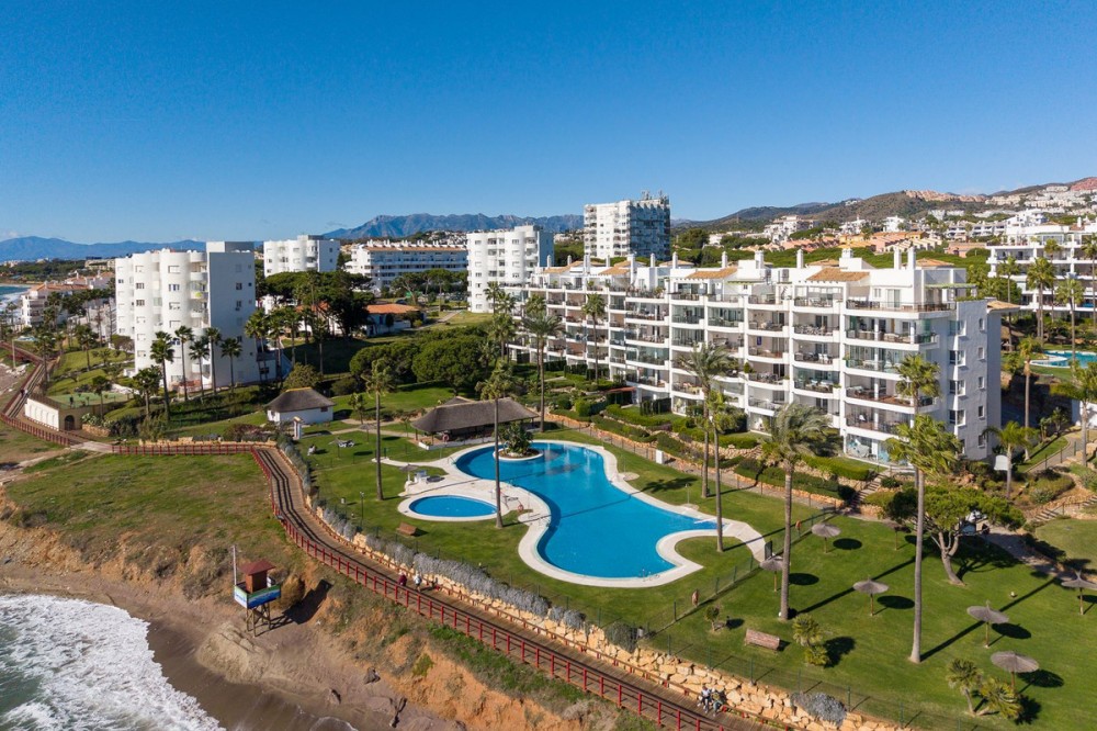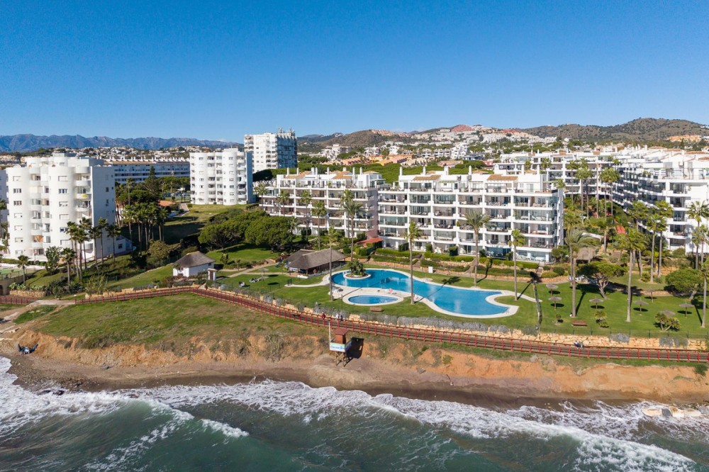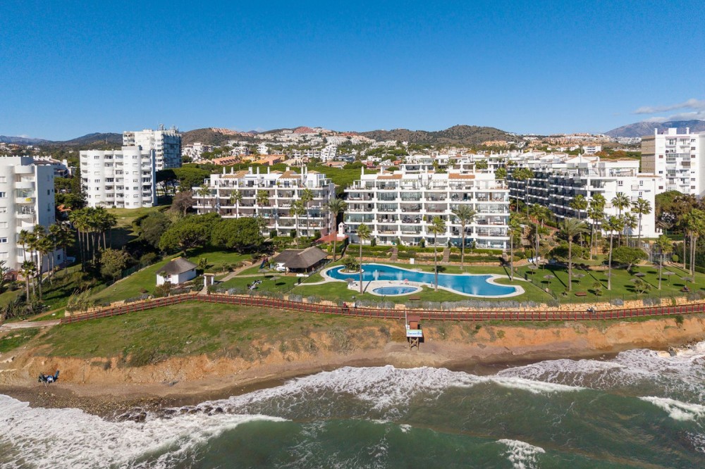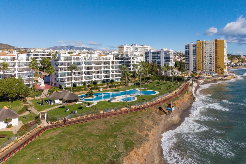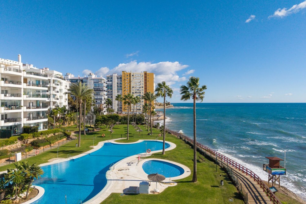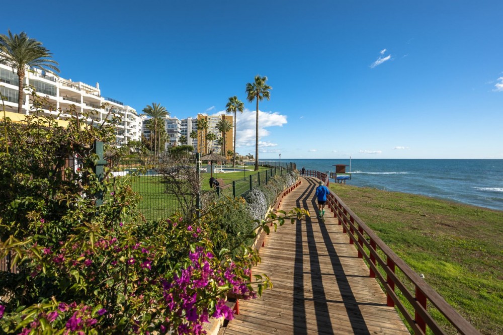 - Frontline Beach 2-Bedroom Apartment in Mi Capricho, Calahonda We are delighted to present this beautiful 2-bedroom, 2-bathroom beachfront apartment, ideally located in the prestigious and well-established Mi Capricho urbanisation in Sitio de Calahonda, Mijas Costa. Set within an exclusive gated community with direct access to the promenade and beach, this property offers an exceptional blend of lifestyle, comfort, and investment potential on the Costa del Sol. Positioned on the second floor and accessible by both lift and stairs, the apartment is ready to move into and is sold fully furnished, featuring tasteful finishes and exclusive details throughout. The bright and spacious living area opens seamlessly onto a large private terrace with both dining and lounge areas, where you can enjoy stunning views of the Mediterranean Sea, the communal swimming pools, and the beautifully landscaped gardens accompanied by refreshing sea breezes and the gentle sound of the waves. The apartment offers two generous bedrooms, both with built-in wardrobes. The master bedroom features an en-suite bathroom and direct access to the terrace, while the second bedroom is fitted with two single beds that can be arranged together or separately. Both bathrooms have been stylishly renovated and include underfloor heating, adding an extra level of comfort and luxury. A separate fully equipped kitchen and utility room complete the interior layout. The Mi Capricho community is renowned for its excellent maintenance and welcoming atmosphere. Residents enjoy 24-hour security, daytime concierge service, and nighttime caretaking, along with two large swimming pool areas for adults, separate children’s pools, lush manicured gardens with flowers, lawns, palm trees, playgrounds, a fenced children’s ball court, guest parking, and a poolside bar serving food and drinks. The upper pool is open year-round, while the lower pool operates from April to October with lifeguard supervision. Conveniently, there are also two communal toilets within the complex. The entire development faces the sea and offers expansive outdoor areas with benches and ample space for sun loungers, whether in shaded areas or full sun. Residents may use their own loungers or rent them directly from the pool bar. The complex features two direct exits to the beachfront promenade, one of which is equipped with a wheelchair- and stroller-friendly ramp. From here, you can enjoy scenic walks stretching from Fuengirola and La Cala de Mijas to Cabopino and Marbella. Additional features include an underground garage parking space, also accessible by lift. For those who prefer not to drive, bus stops and taxi ranks are within easy walking distance, offering direct connections to Fuengirola and Marbella. The Seamen’s Church is nearby and hosts regular events and activities for both adults and children, with numerous restaurants, bars, shops, and services located along the way. Ideally situated within walking distance of La Cala de Mijas, with its charming village atmosphere, beaches, restaurants, and amenities, and just 39 km from Málaga Airport, this apartment is perfectly positioned for year-round living or rental demand. Whether you are seeking a luxury holiday home, a stylish permanent residence, or a strong rental investment, this exceptional frontline beach apartment truly ticks every box.