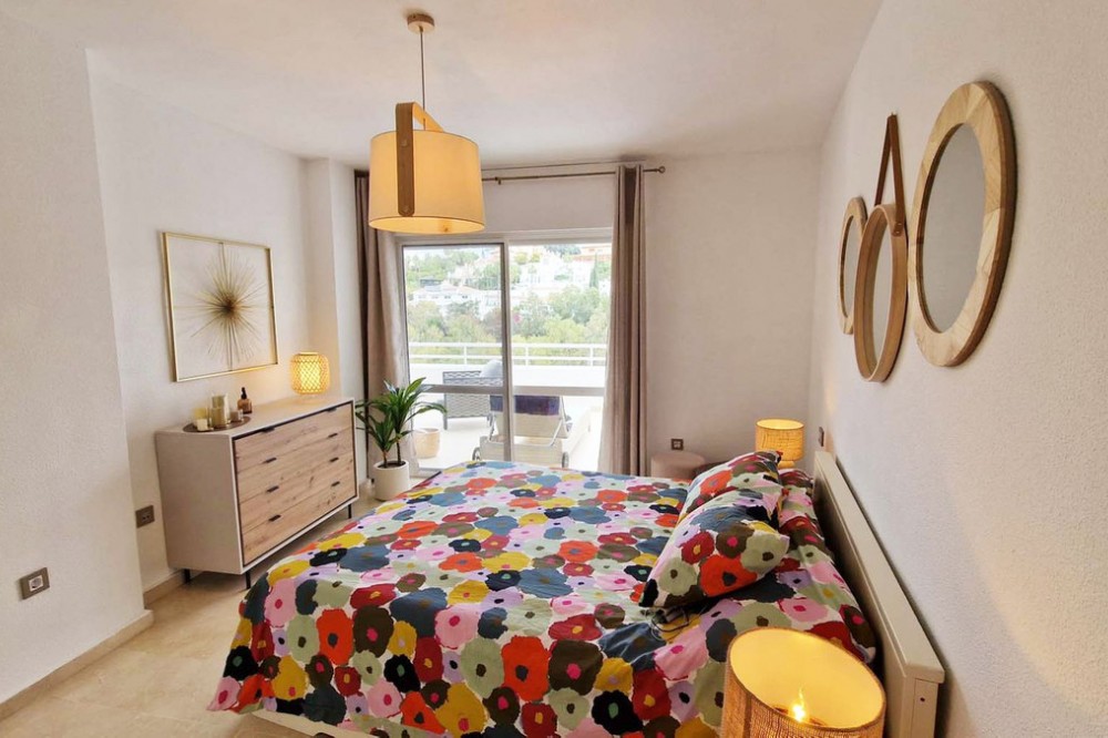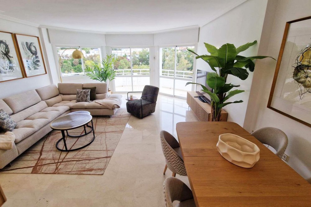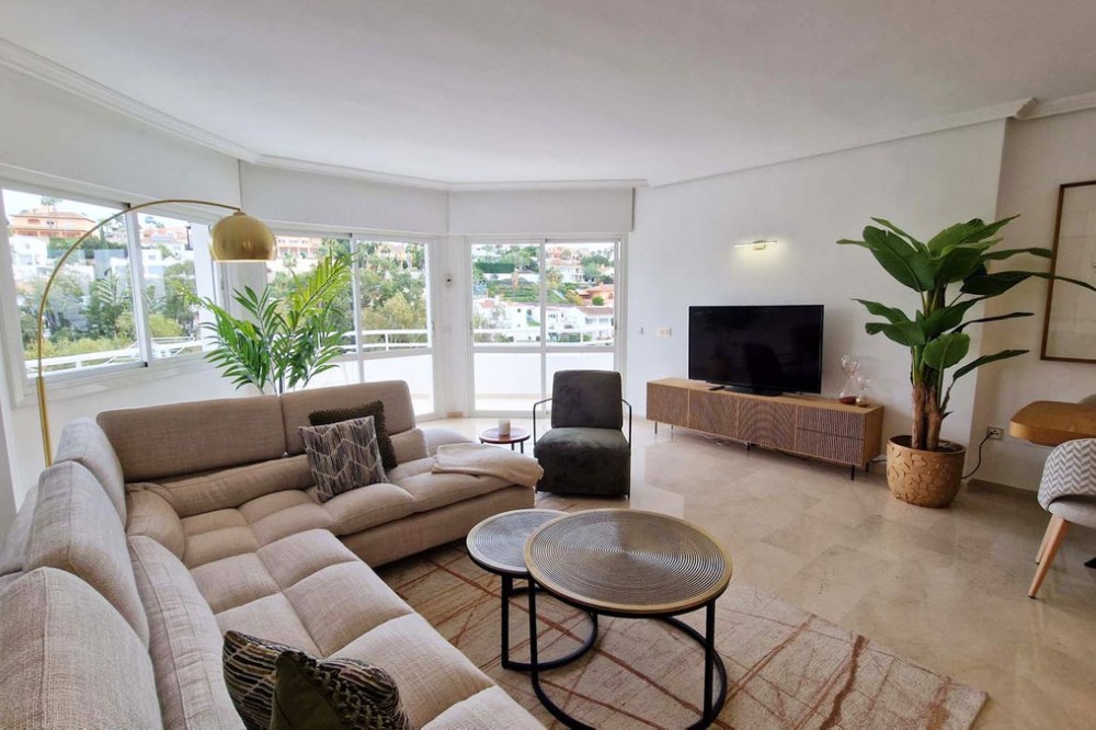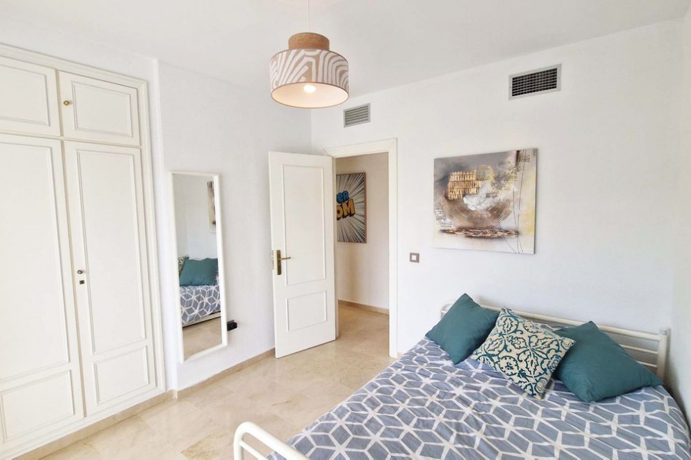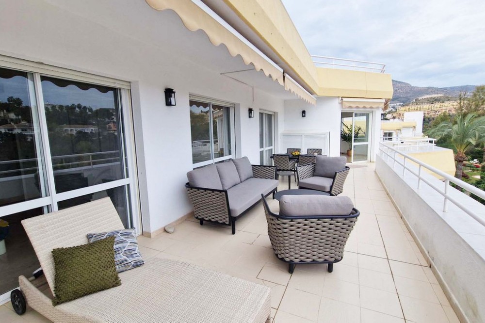 - Very nice renovated 3 bed 2 bath (one in suite) penthouse for sale just 300 meters from the seafront and the beach in Benalmaadena Costa. This property has been renovated by the current owners. Electricity, plumbing, new kitchen, bathrooms completely changed also. Air conditioning system is also distributed in all the rooms. Electric shutters in all rooms. If you are looking for a property in perfect condition, this should be the one for you! Just in front of the golf course of Torrequebrada, so nothing can be constructed in front of this apartment. It enjoys very good sunshine and enjoys a very pleasant view of the golf course of Torrequebrada and the sea from the very large terrace and the roof-top. It is sold with a parking space included in the sale price. The urbanisation (secured) has two swimming pools for adults and a small swimming pool for children. Very quiet and relaxing place, secure, with two large supermarkets within 2 minutes by car, various restaurants, pharmacies, hairdresser, bazar etc... Three international colleges are present in a very close perimeter as well as hotels. Very rare quality apartment in a nice location. Sold fully furnished. Malaga airport at just 20 minutes driving distance.