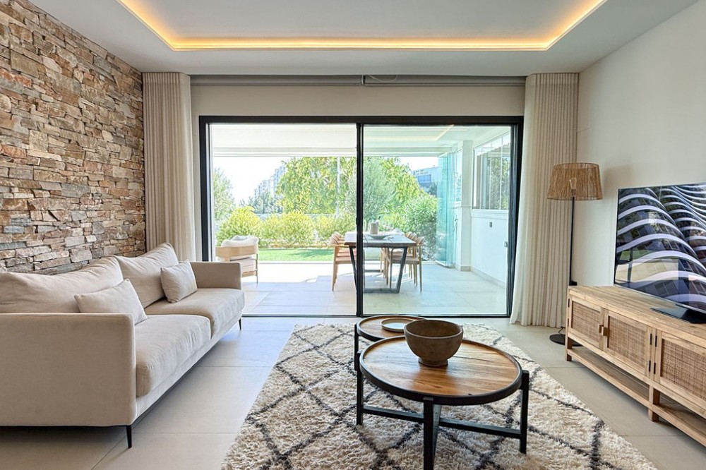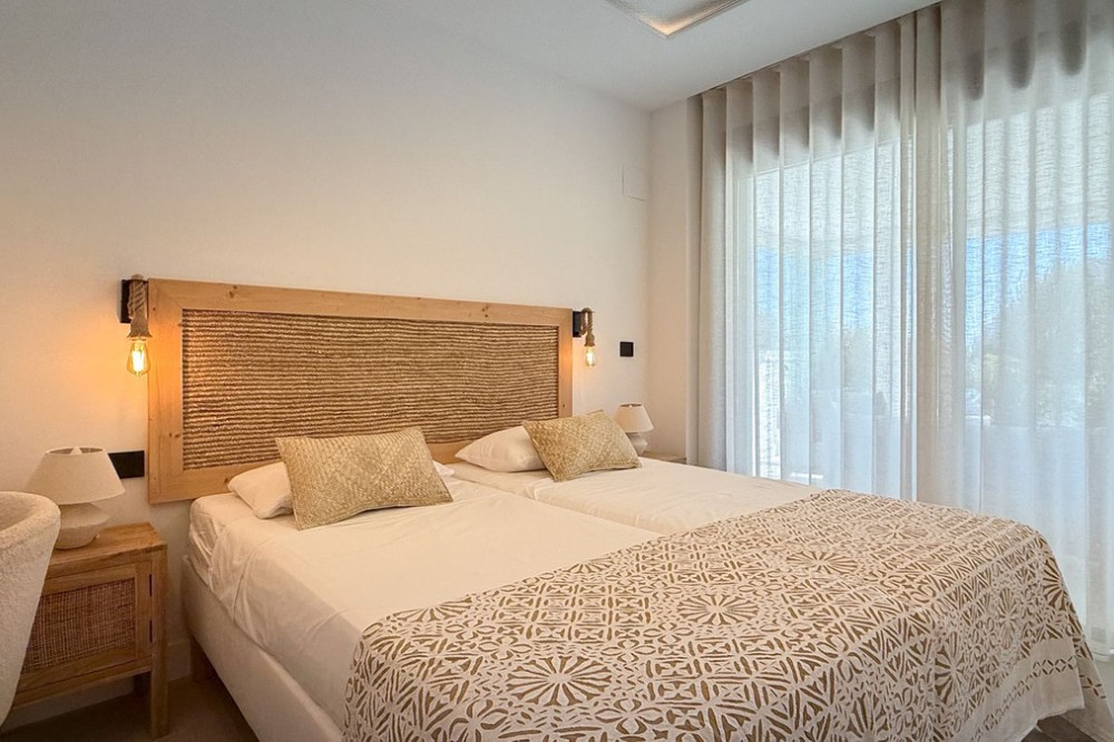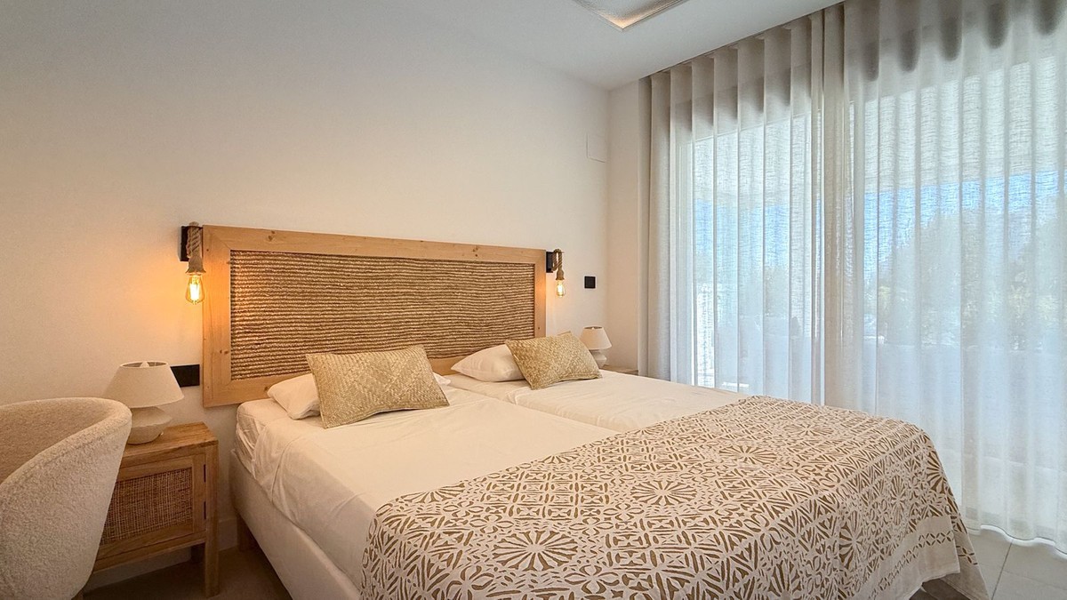 - Fantastic luxury apartment located in the centre of Estepona, the garden of the Costa del Sol. This newly build apartment is conveniently situated within walking distance of the marina of Estepona , close to the romantic and vibrant old town and only 15 minutes walk from the beach of La Rada. Offering 2 bedrooms and 2 bathrooms. The main bedroom has an open plan bathroom with walk-in shower, anti-fog mirrors, electric towel racks and extra wardrobes. A fully equipped and open plan kitchen with all Bosch appliances and spacious living dining area. Carefully decorated in a perfect blend of Scandinavian minimalism, boho accents and ethnic touches. But more than that, it is the ideal place for outdoor living as there is also an oversized covered terrace that has been recently upgraded with glass curtains for maximum use of the terrace all year round and a very nice mediterranean garden with very low maintenance. The terrace has water and electricity pre-installation for an outdoor kitchen. The garden has sprinkler installation for automatic watering of the plants as wel as pre-installation for a jacuzzi. The domotic system for home automation is also installed to control the lights and electric blinds. Air conditioning and floor heating are provided though aerothermal energy. Also good to know is that the extra spacious utility room with washing machine and tumble dryer is just across the front door. A private underground parking space is also included in the price. The exclusive gated community offers a large outdoor pool and state of the art gym facilities, community area, game room and secure entrance. Alexia Life stands out for its architecture and design but also for the great community and is a must see if you are looking for the perfect holiday house or for all year round living.