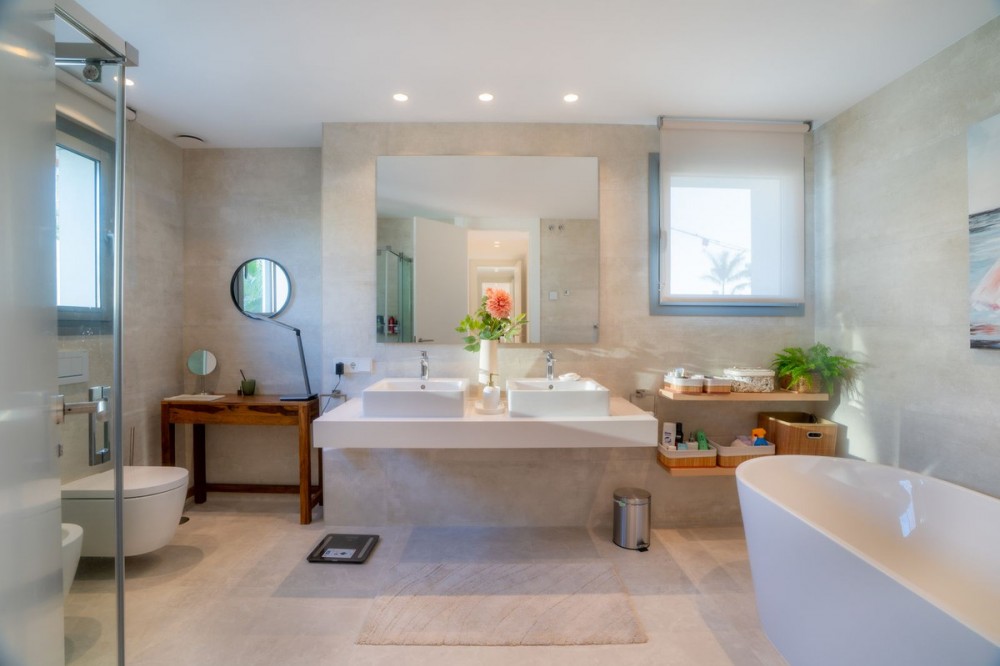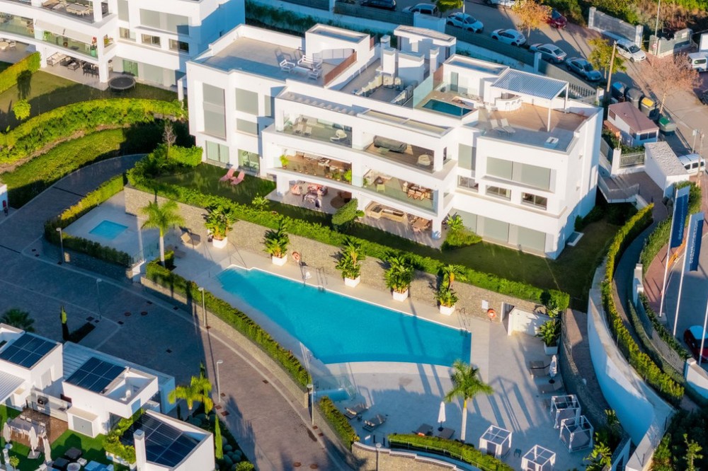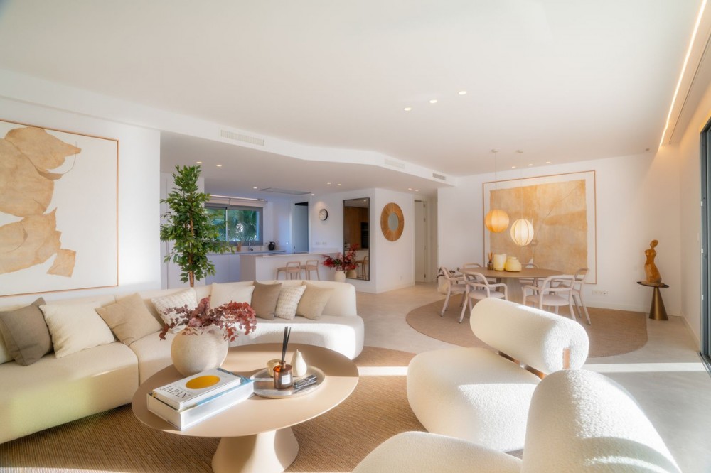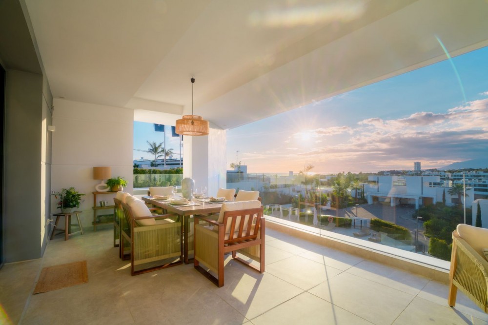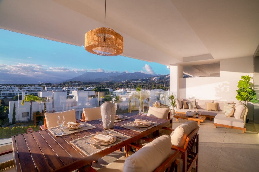 - Elegant Middle-Floor Apartment with Panoramic Sea Views in Santa Clara, Marbella This exceptional middle-floor apartment is located in one of Santa Clara’s most prestigious and secure luxury communities, offering a refined lifestyle just minutes from Marbella. The apartment features three spacious bedrooms, including a master bedroom with en-suite bathroom, complemented by a stylish guest bathroom and an additional guest toilet. A generous open-plan kitchen and living area creates a bright and elegant living space, perfectly designed for both everyday comfort and entertaining. Thanks to its south-west orientation, the property enjoys breathtaking sea and mountain views from every room, with uninterrupted vistas extending all the way to Gibraltar. Comfort is ensured year-round with underfloor heating throughout the apartment. Completed in 2023, the property is presented in immaculate condition and is sold fully furnished with exclusive Gunni & Trentino furniture and interior styling, combining contemporary design with timeless sophistication. The large private terrace offers ample space for two distinct lounge or seating areas, ideal for enjoying Marbella’s climate, spectacular sunsets, and open views. The apartment is completely private, with the swimming pool conveniently located just below. Residents benefit from a luxury gated community with 24/7 security, along with access to a high-end SPA and a fully equipped, professional gym. Additional features include: Underfloor heating throughout 2 private parking spaces 1 storage room Exceptional privacy and tranquility High-quality finishes throughout A rare opportunity to acquire a modern, turnkey luxury apartment with outstanding views, premium interiors, and first-class amenities in one of Marbella’s most sought-after residential areas.