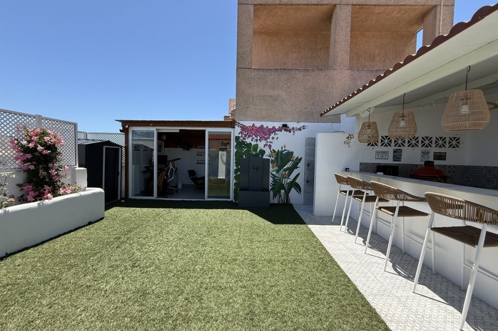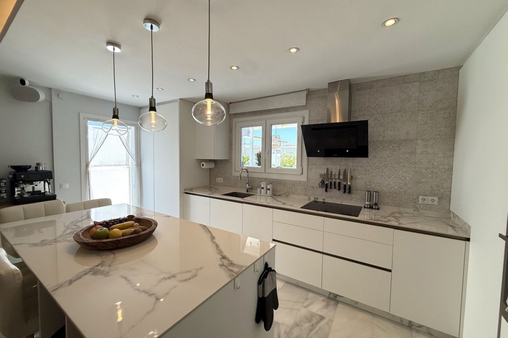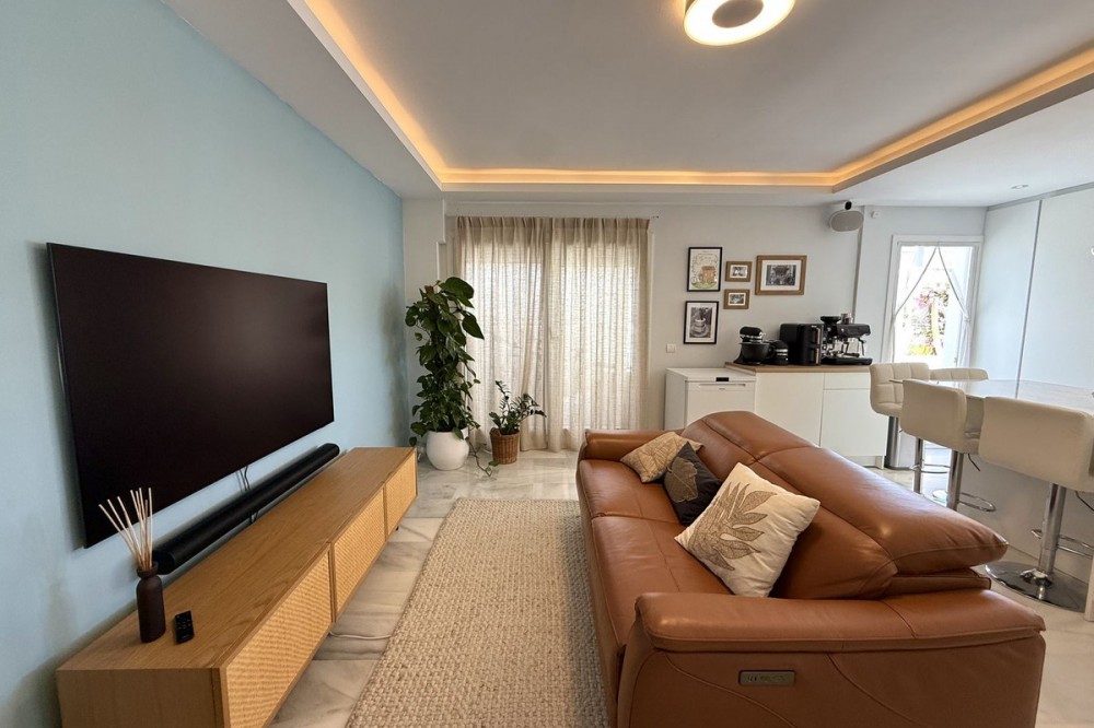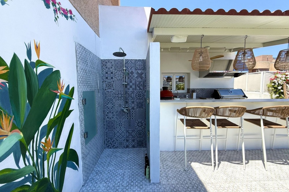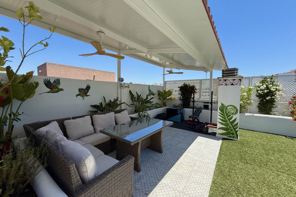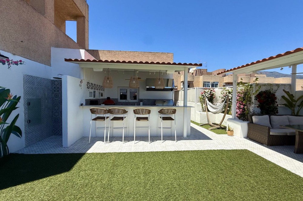 - Penthouse in Central Estepona with 98 m² Terrace, Fully Equipped Outdoor Kitchen, Gym Area & Rental License! Welcome to this stylish and fully renovated penthouse with three bedrooms and two bathrooms, ideally located in the heart of Estepona – just a short walk from the charming Old Town, the beach, restaurants, and shops. The apartment features a bright and open layout between the kitchen and living area, with tasteful materials and modern finishes throughout. All bedrooms include built-in wardrobes and air conditioning. An elevator provides direct access from the garage to the top floor, where the property comes with a double parking space for two cars. The 98 m² terrace, located on the same level as the apartment, extends the living space outdoors. It includes a fully equipped outdoor kitchen with barbecue, sink, and fridge, a dining area for six, a bar section, outdoor shower, and even a private gym. Part of the terrace is enclosed in glass and currently used as a home office with AC – which can also serve perfectly as an extra guest room. The property holds a valid tourist rental license, making it an excellent choice as a permanent residence, holiday home, or investment with high rental potential. Contact us to schedule a viewing and experience the best of Estepona from above!
