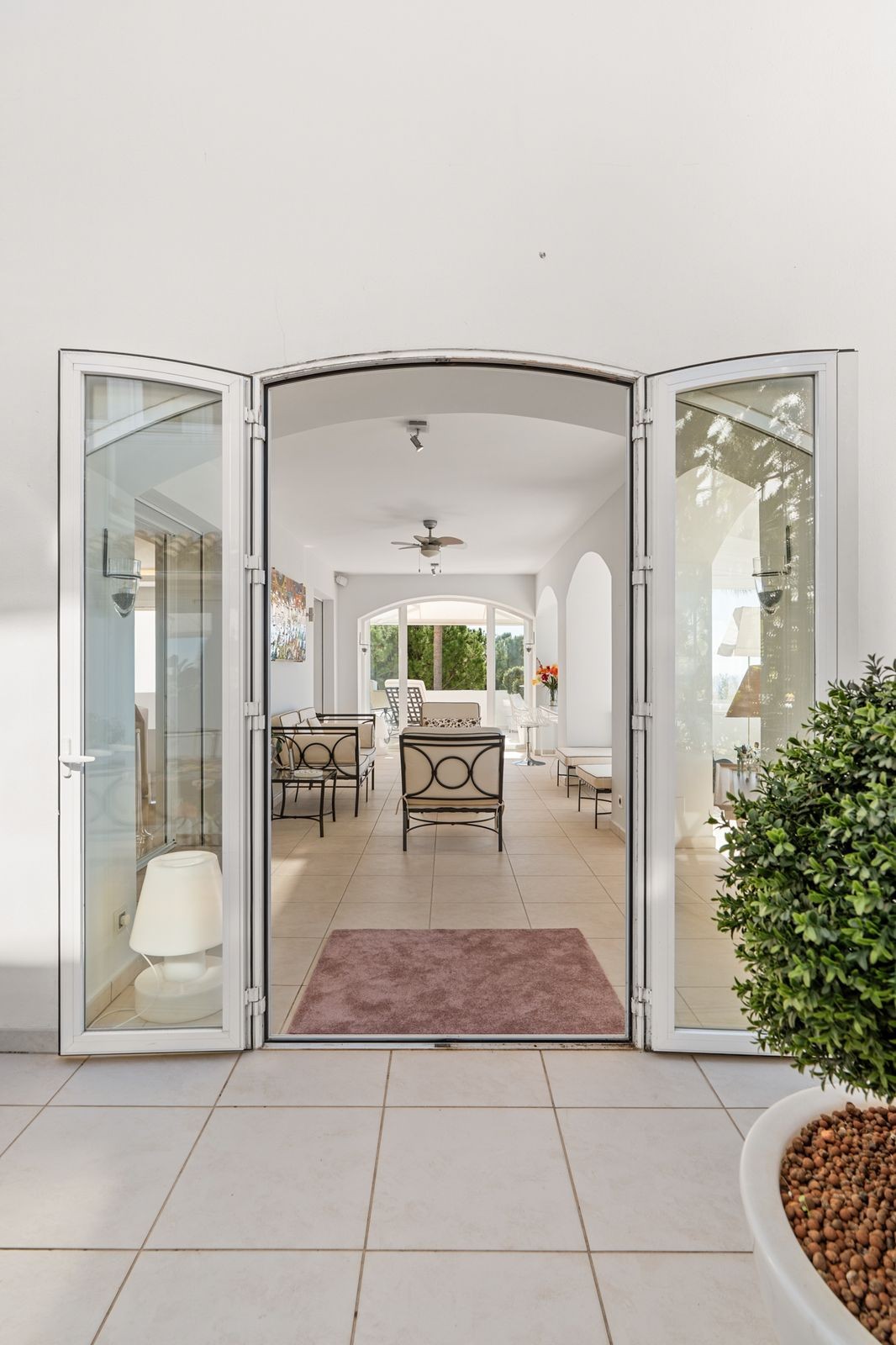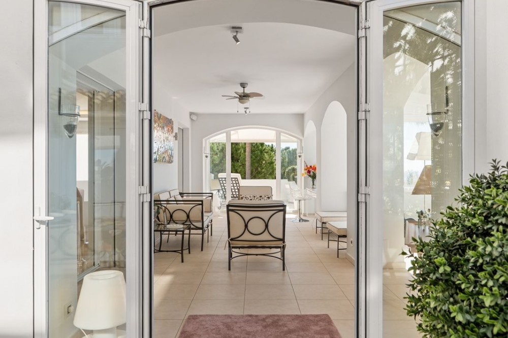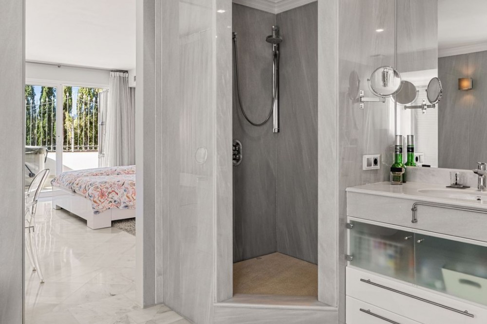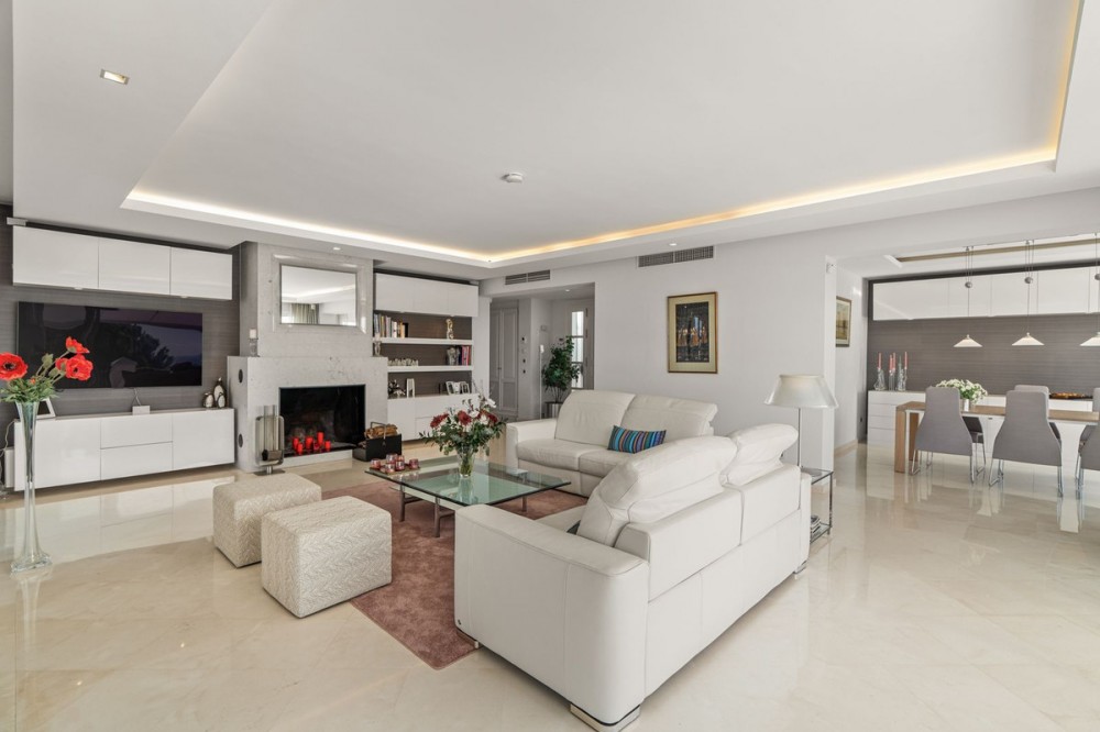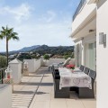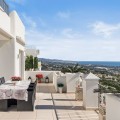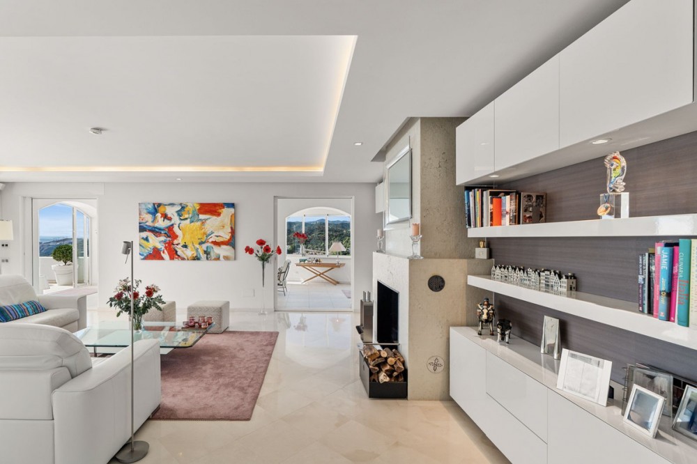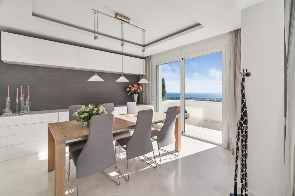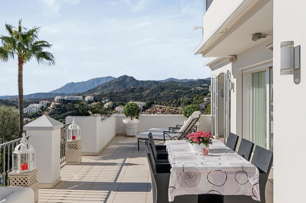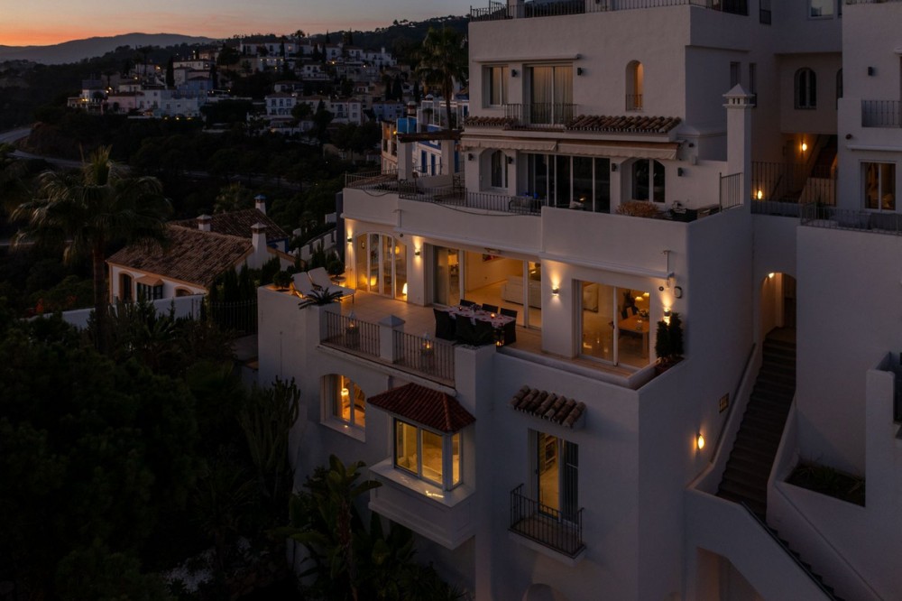 - Welcome to this exceptional 3-bedroom duplex apartment in Las Colinas de La Heredia - a rare opportunity to own one of the most privileged homes within this sought-after enclave of Benahavís. This residence offers uninterrupted views across the sea, mountains, and golf valleys. On a clear day you can even look as far as the African Coast and Gibraltar! This panorama feels different every hour of the day. Spread across two beautifully appointed levels, the property is designed for comfort, style, and effortless everyday living. The home comes fully luxury furnished, allowing you to move in immediately and enjoy its serene atmosphere from day one. On the entrance level you’ll find a beautifully designed layout that feels spacious and practical at the same time. The living room, dining area and the cosy sun room all flow naturally into each other, creating an inviting atmosphere (together more than 100 m2). The sun room is ideal for the cooler evenings, while the open terrace offers breathtaking panoramic views. It's the perfect spot to enjoy a sunset drink. The fully fitted kitchen sits just around the corner, separate from the living area, and has direct access to one of the terraces, making it the ideal place to enjoy a slow breakfast outdoors. The kitchen also features an additional storage room with its own AC unit, perfect for keeping groceries in a good condition. The living room includes a charming fireplace, which brings warmth and character to the space. On each floor, you’ll find a separate guest toilet, adding an extra layer of convenience. The master suite (52m2) is situated in the front of the house (south side) and has the same fantastic views. From this suite you have direct access to one of the terraces where a jacuzzi and outside shower are waiting for you and where you can enjoy complete privacy. Just off the hallway, you’ll find a separate laundry/storage room, offering plenty of space to keep household items neatly tucked away. One of the most unique elements of this home is the abundance of outdoor space. Multiple terraces, together 98 m2, offer a choice between sun and shade throughout the day. Here, you can take in the sunsets, host intimate dinners, or simply unwind with the soft mountain breeze. A private garage on a short drive inside La Heredia and an additional carport space at the complex ensure secure and practical parking. The building is equipped with a lift, providing easy access to the apartment. The home is fitted with premium features to elevate the lifestyle experience: - Built: 253 m2 - terraces: 110 m2 - total 363 m2 - Full water softening system for the entire property - Integrated BOSE sound system throughout the home - Automatic sun awnings with wind and sun sensors - Alarm system - Double glazing throughout - Jacuzzi - Underfloor heating - Living room with separate dining area and sun room, together about 105 m2 - Master suite with dressing and bathroom, together more than 52 m2 - Luxury furnished Residents of Las Colinas de La Heredia enjoy access to a beautiful communal swimming pool surrounded by peaceful gardens, as well as the charm and security of La Heredia, one of the most picturesque villages on the Costa del Sol. This is not just a home; it is a retreat of comfort, privacy, and panoramic beauty.