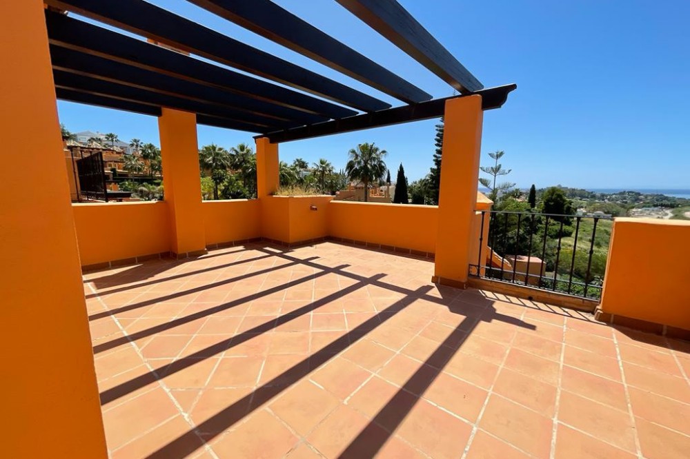 - New south facing three bedroom townhouse in Paraiso Bellevue, in El Paraiso on the New Golden Mile, just a short drive from the beach and all leisure amenities. The complex boasts fantastically maintained gardens and a large communal lagoon style swimming pool. On the main level there is a living room with a fireplace and patio doors leading to the terrace and private garden; Open plan kitchen along with breakfast bar and guest toilet. On the upper level is the master suite with access to the private terrace and two guest bedrooms that share a bathroom. There is also a large solarium with partial sea and mountain views. Other features include marble floors, fitted wardrobes and hot and cold air conditioning.