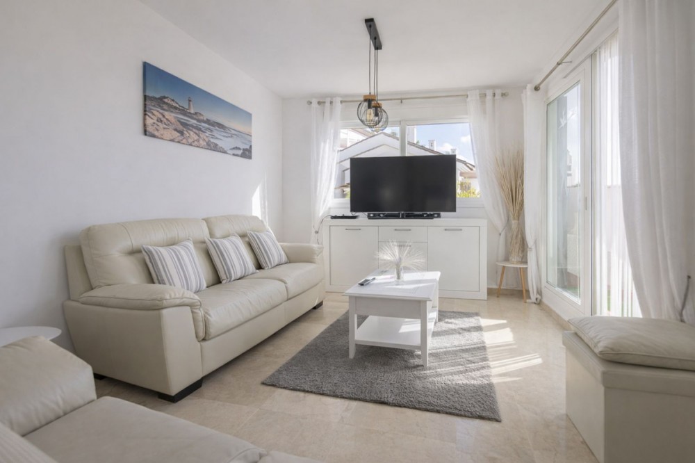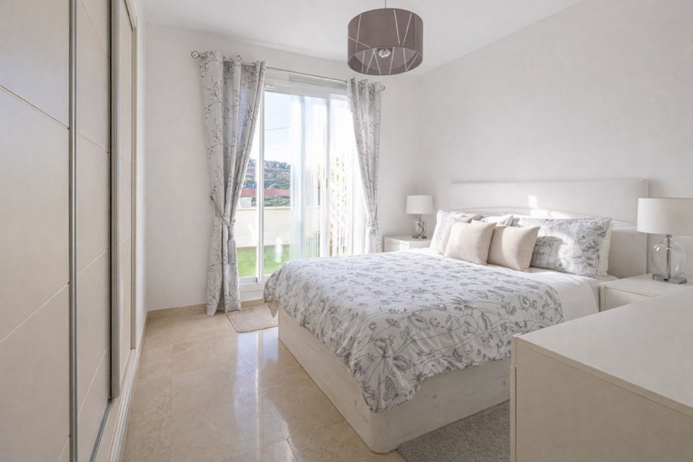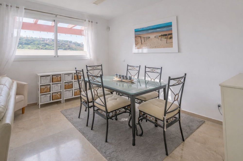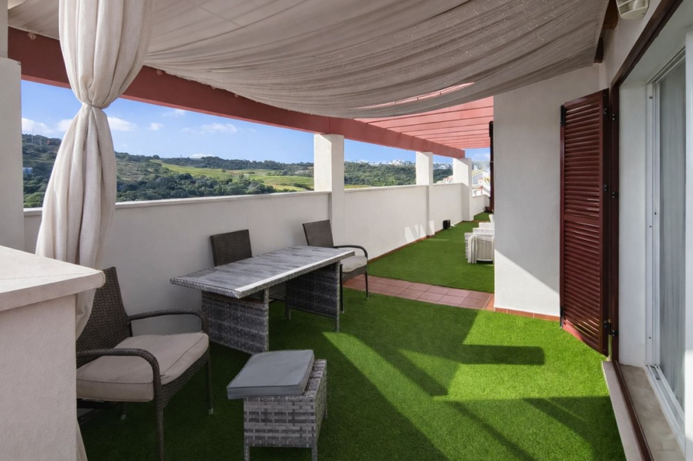 - Bright Two-Bedroom Penthouse with Sea and Golf Course Views in Alcaidesa Located in an exclusive Alcaidesa development, this magnificent south-facing penthouse offers stunning views of the sea, the golf course, and the stream. The community features beautifully landscaped gardens, three communal swimming pools, and is situated next to the Alcaidesa La Hacienda Links Golf Club, just 3 minutes by car from the blue-flag beaches. The well-maintained property comprises two bedrooms, including a master bedroom with en-suite bathroom, a second bedroom, and an additional full bathroom. The kitchen is fully fitted and equipped with high-quality appliances: ceramic hob, oven, combi fridge, dishwasher, and a new extractor hood, along with a laundry room with patio access. Hot water is provided by a new electric water heater. The bright living room opens onto a spacious terrace, allowing you to enjoy the views and natural light throughout the day. The property features marble flooring and double-glazed windows, providing comfort and elegance. The apartment includes two spacious parking spaces and a 7 m² storage room, offering extra space and convenience. A unique opportunity to live in a privileged setting, combining tranquility, spectacular views, and proximity to the beach and golf. Offer subject to errors, price changes, or any other modifications without prior notice. The price does not include taxes or transfer fees. Agency fees are included.