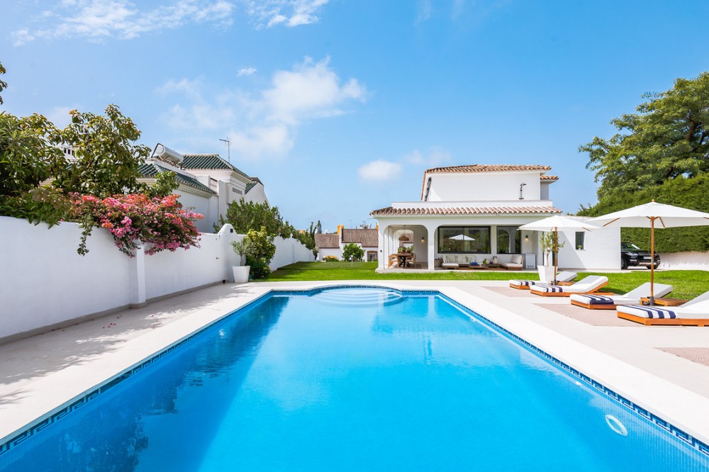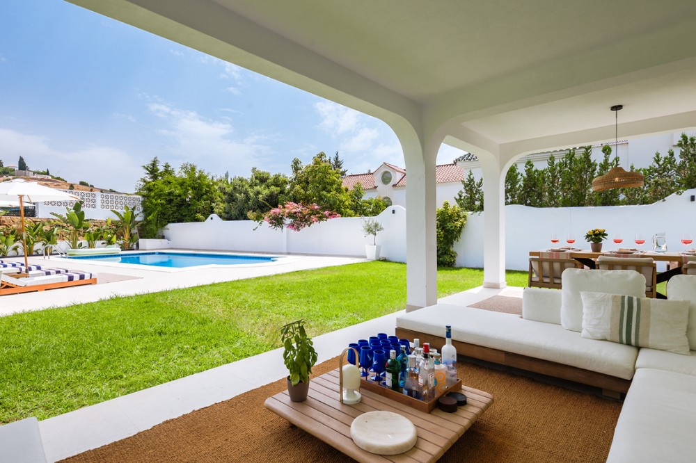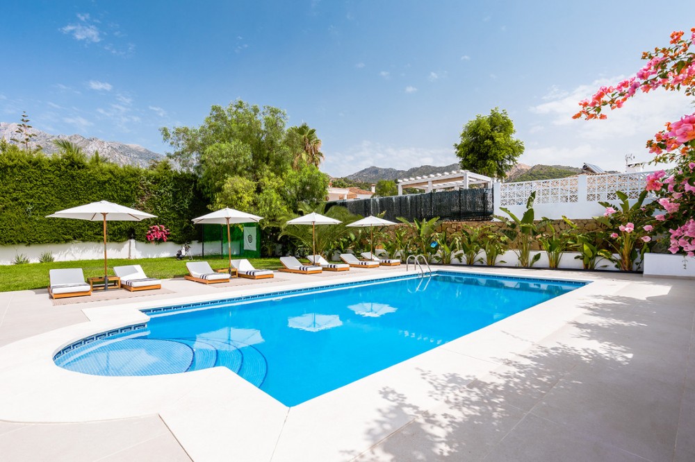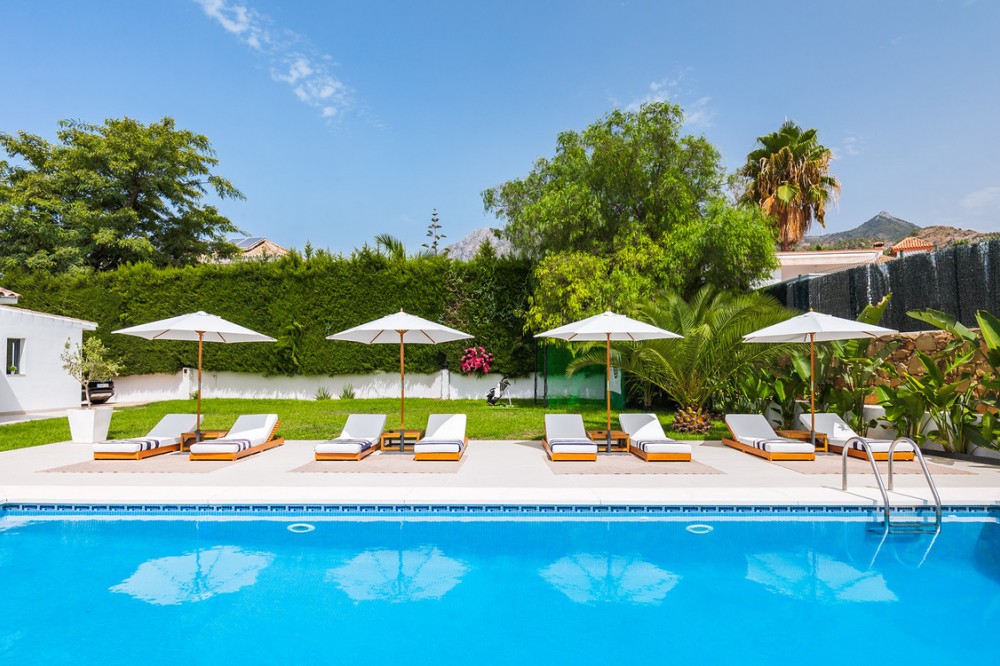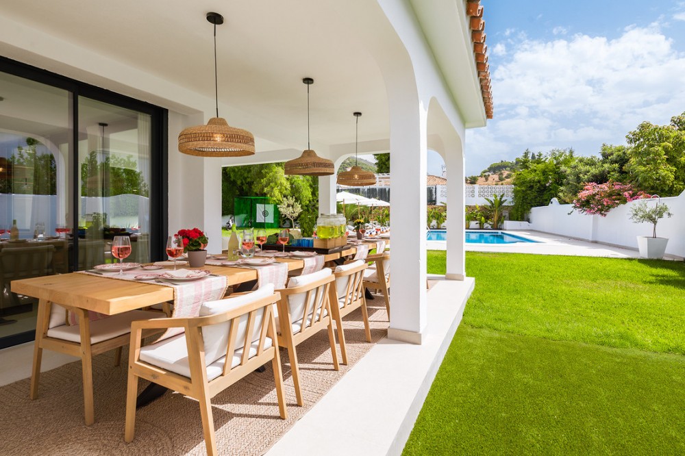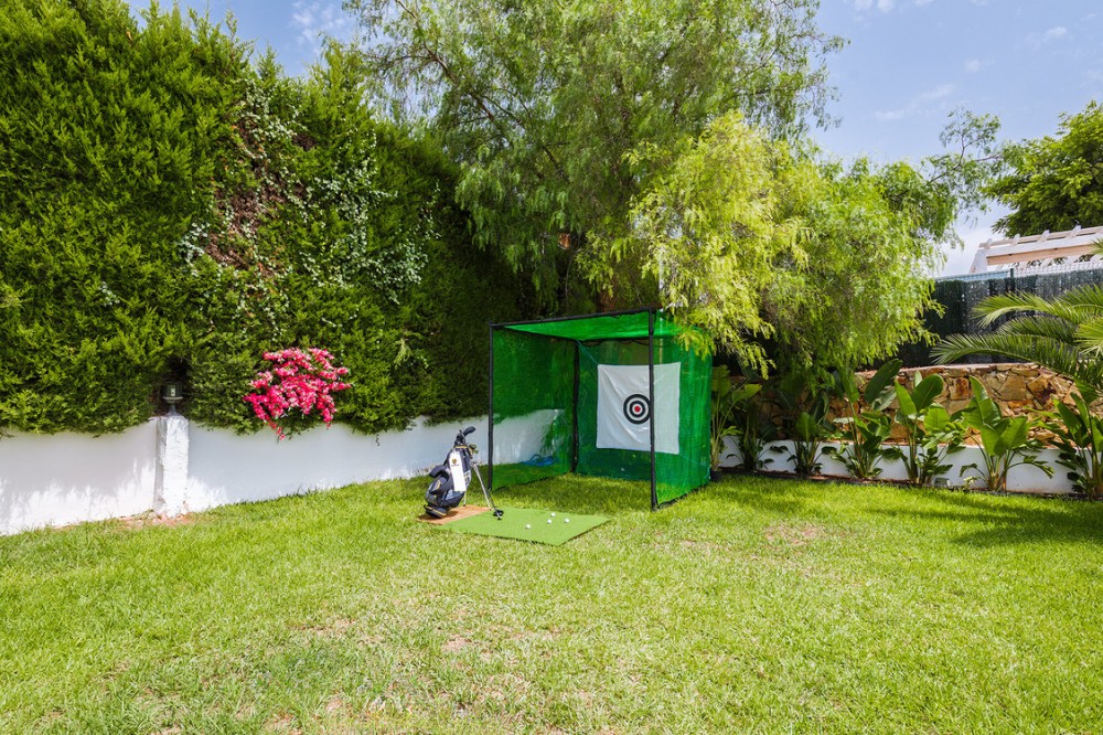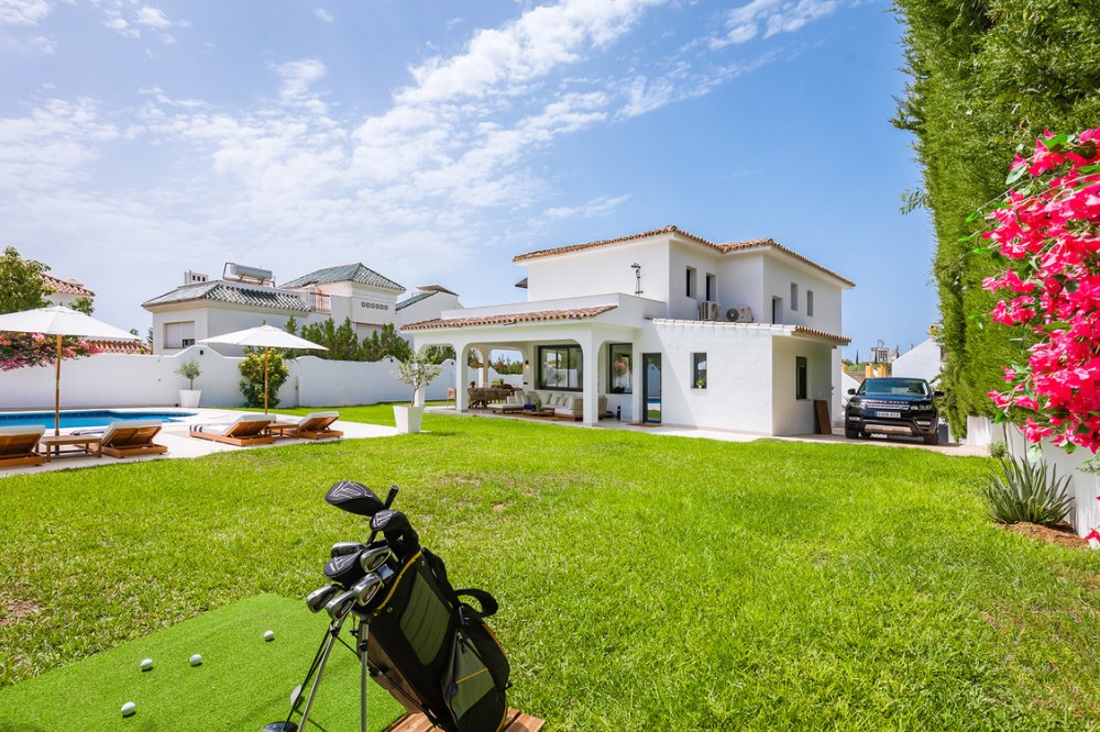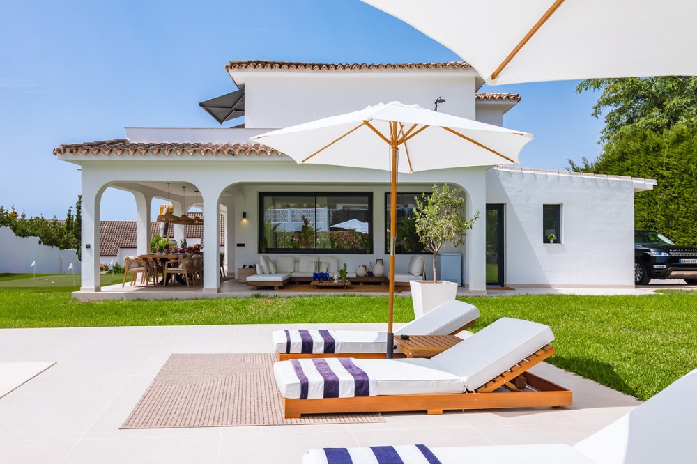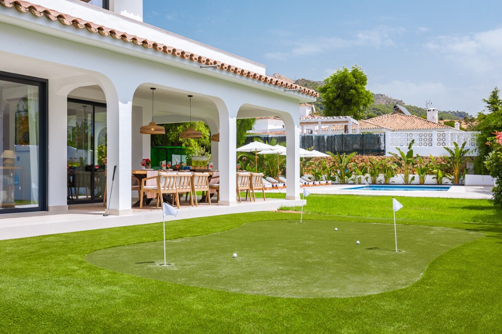 - Exclusive villa with modern design and subtle Andalusian touches, set on a spacious and private flat plot in Huerta del Prado, just 5 minutes by car from the beach, La Cañada shopping centre, and Marbella’s Golden Mile. Distributed over two floors, the property features an elegant entrance hall leading to a bright open-plan living room with a state-of-the-art fully equipped kitchen, and a covered porch with dining area for 10-12 people. Outside, a well-maintained garden boasts a large swimming pool with sun loungers and a fully equipped mini-golf putting green with radar-based practice area, ideal for leisure and relaxation. The villa offers six double bedrooms, five bathrooms, four of them en-suite, and 2 guest toilets; three of the bedrooms enjoy direct access to a terrace with mountain and natural surroundings views. There is parking space for 2 cars and EV charging station. A unique property in a prime location. Please contact us for availability and seasonal rates.