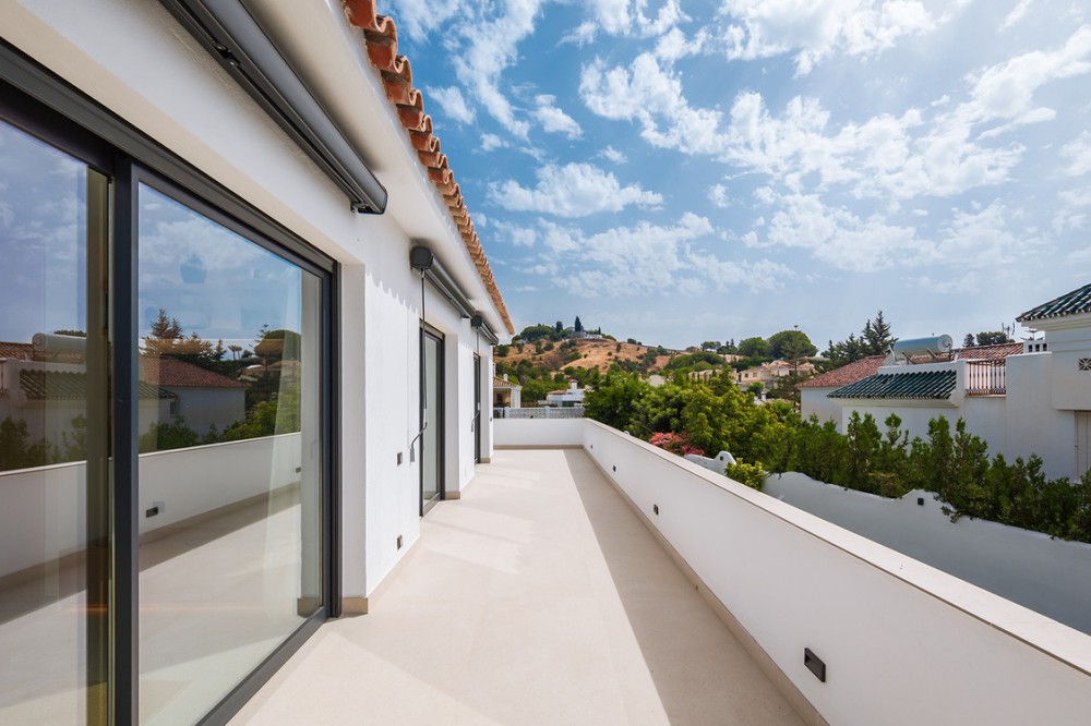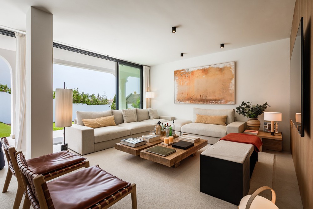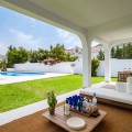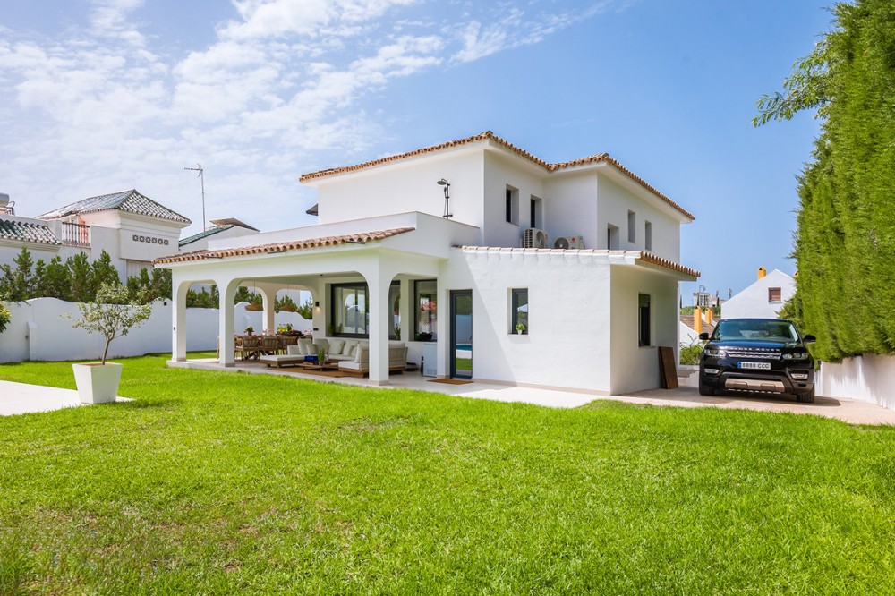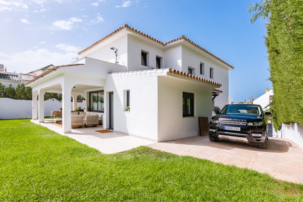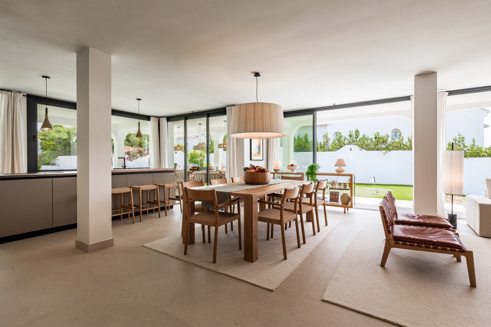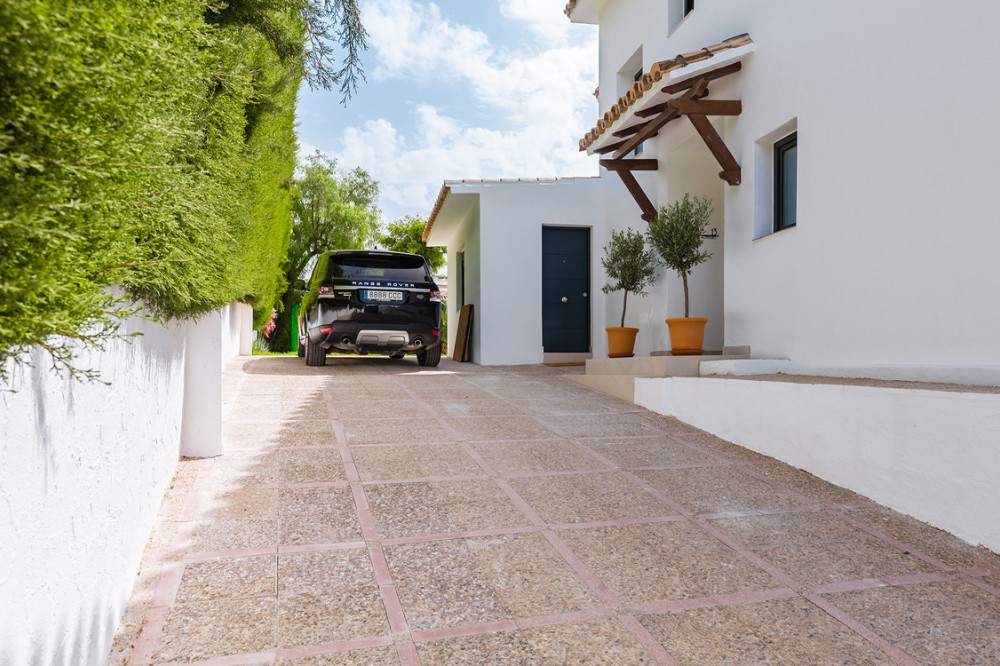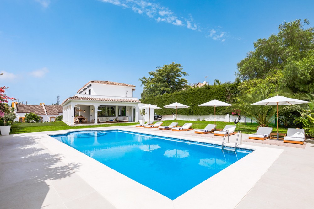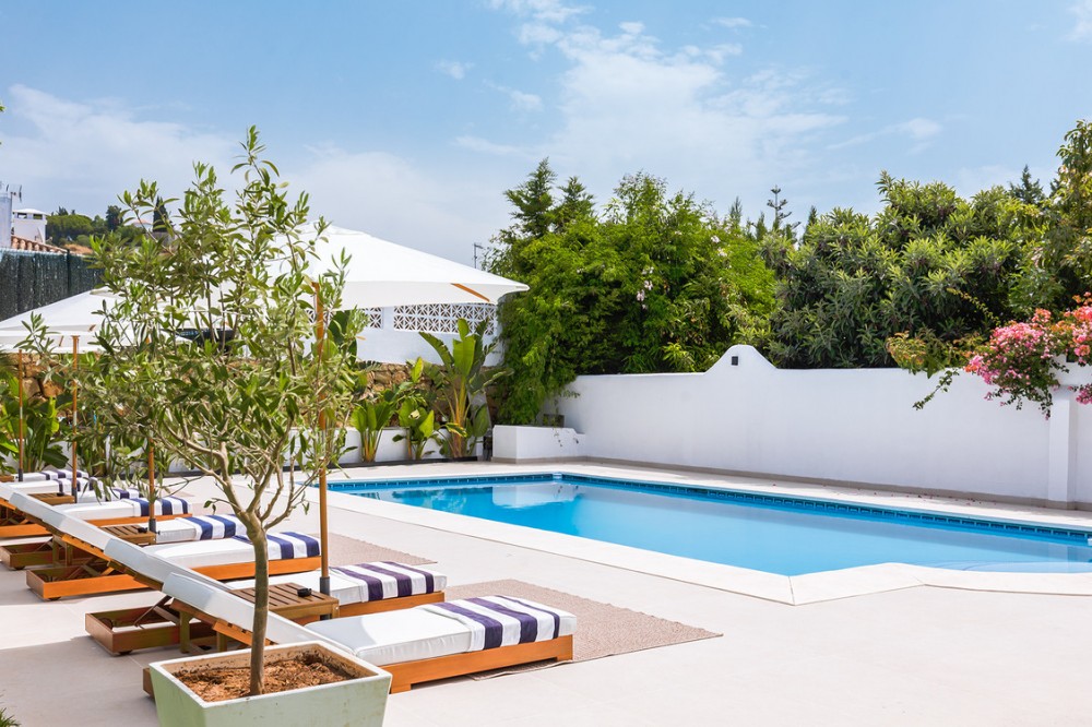 - Exclusive villa with modern design and subtle Andalusian touches, set on a spacious and private flat plot in Huerta del Prado, just 5 minutes by car from the beach, La Cañada shopping centre, and Marbella’s Golden Mile. Distributed over two floors, the property features an elegant entrance hall leading to a bright open-plan living room with a state-of-the-art fully equipped kitchen, and a covered porch with dining area for 10-12 people. Outside, a well-maintained garden boasts a large swimming pool with sun loungers and a fully equipped mini-golf putting green with radar-based practice area, ideal for leisure and relaxation. The villa offers six double bedrooms, five bathrooms, four of them en-suite, and 2 guest toilets; three of the bedrooms enjoy direct access to a terrace with mountain and natural surroundings views. There is parking space for 2 cars and EV charging station. A unique property in a prime location. Please contact us for availability and seasonal rates.
