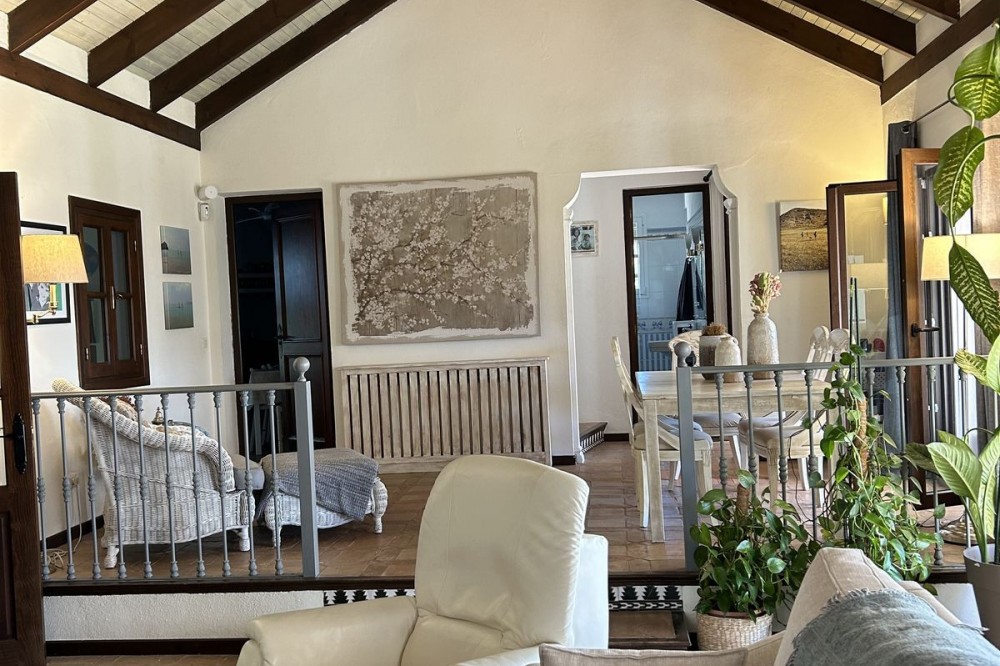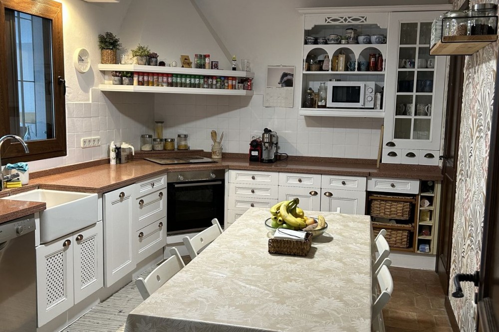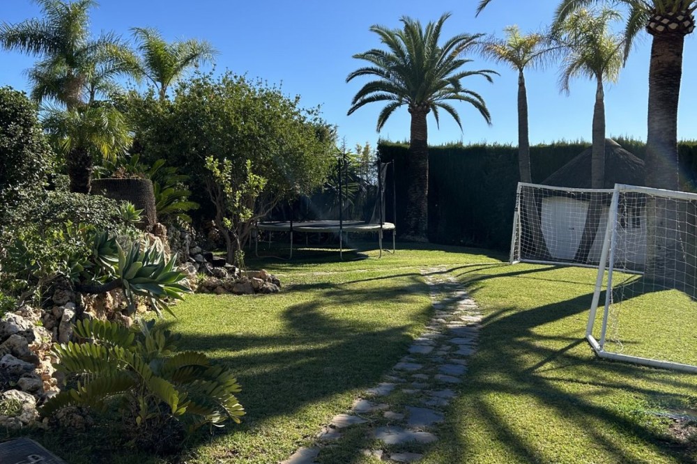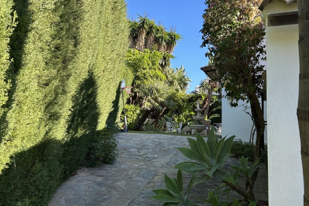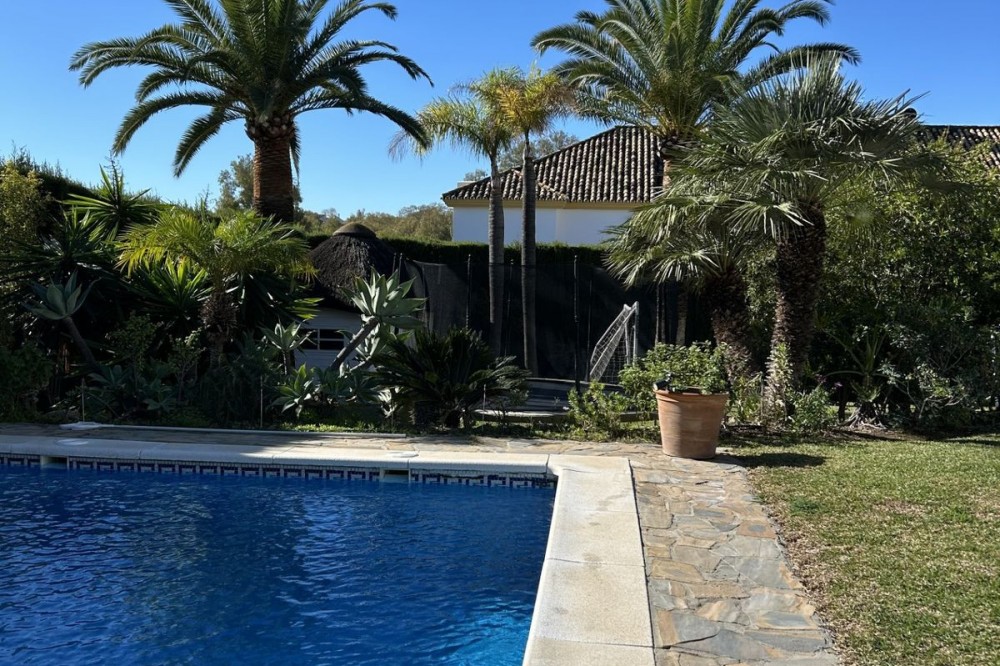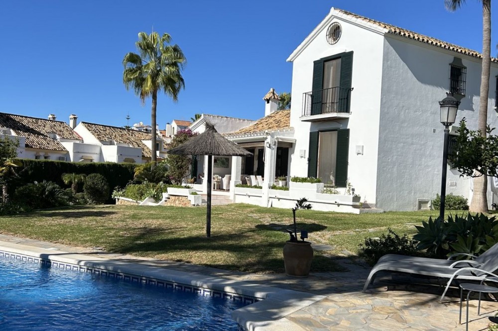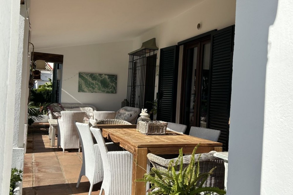 - Wonderful villa for sale in a residential area of Atalaya, in the Monte Biarritz neighborhood, ideal for families and those seeking privacy while living in a well-established area. The property is situated on a plot of 1,246 m², with a building potential of 0.36 which has not yet been fully used, so the house can still be expanded. The plot features a spacious garden area, a small shed, and a 32 m² swimming pool, facing south, making it very bright almost all day long. The house is distributed over two floors. On the ground floor, there is an entrance patio, a living room with a dining area in two distinct spaces, a fully equipped and furnished kitchen, a laundry area, two bedrooms, two bathrooms, and a front porch. On the first floor, there are two more bedrooms and a bathroom. One of the features that gives this villa great charm is its high ceilings with well-maintained wooden beams, being very sunny and bright all day, as well as its location very close to San Pedro de Alcántara, just minutes by car, with schools, shops, and easy access to the N-340 nearby. The villa is rustic in style mixed with modernity, in perfect maintenance condition.