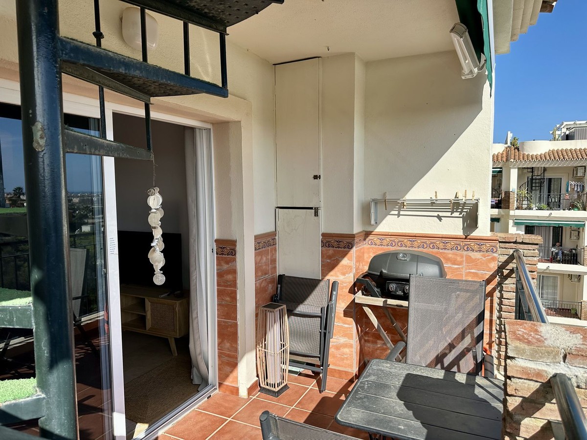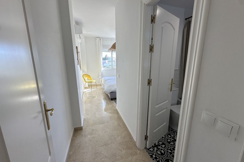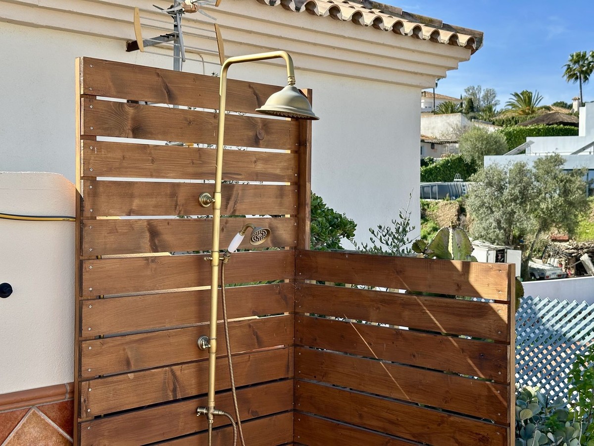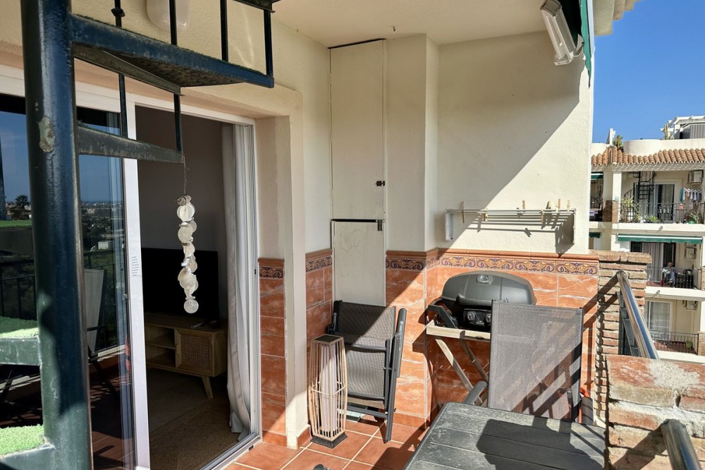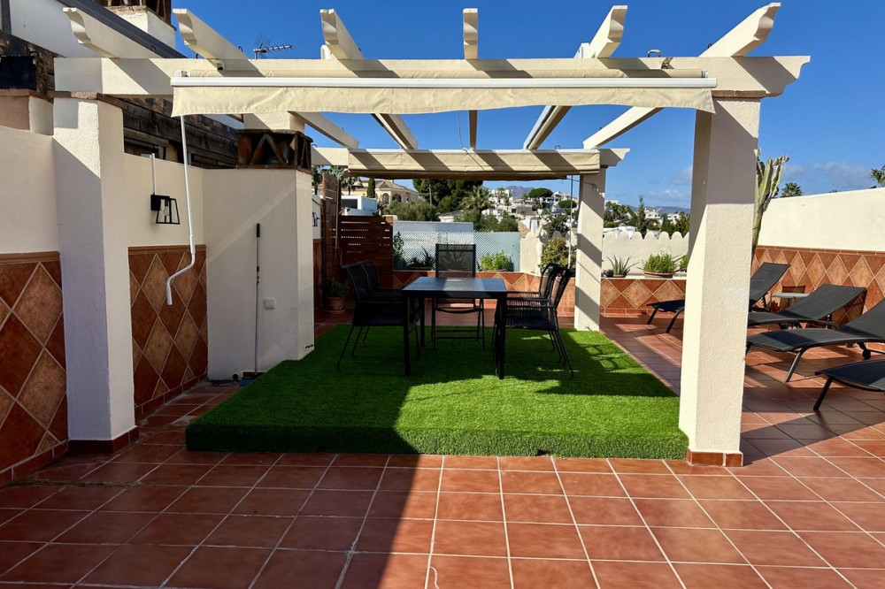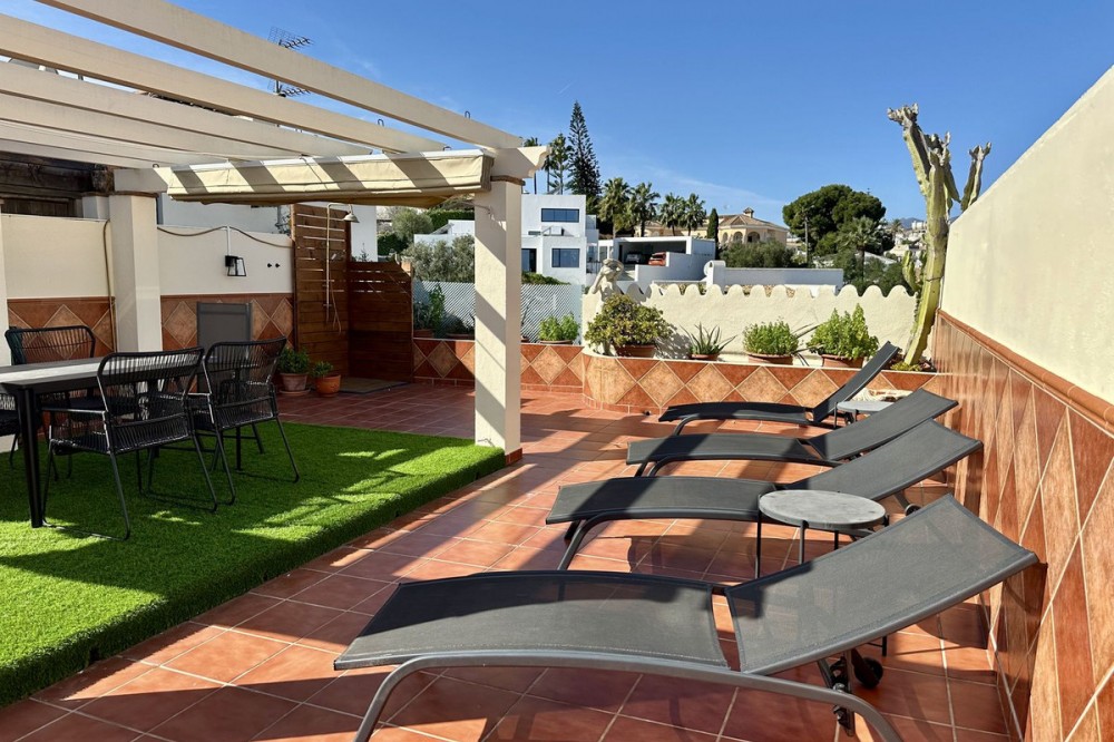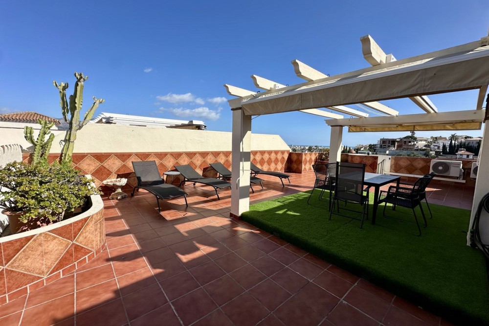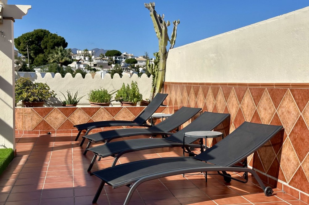 - Top floor with a very large solarium/rooftop terrace! Beautiful & bright apartment in walking distance to restaurants and the local supermarket. This amazing apartment went through a large renovation only 1 1/2 years ago, with a brand new open plan kitchen & underfloor heating in both bathrooms. From the living room you enter a south facing good size terrace. However, if you walk up the external spiral staircase, you find yet an other extremely large solarium, where you can enjoy the most incredible views of both the sea, the enchanting mountains & all the green areas around Cerros del Aguila. When the current owner renovated, they also installed an outdoor shower on the top terrace, so you are able to be cooled down when tanning in the hot summer months. If you enjoys sports, the nearest padel club is located in walking distance. The same accounts for the infamos Cerrado Golf Club! On top, this unique investment is located only a few steps (meaning walking distance) from the new grand park area that the municipality of Mijas is in the process of building. It will become the largest park ever built on the Costa del Sol! Furthermore, this great home comes with 1 private parking space which is located within the gated community. And this amazing homw is sold fully furnished. It even comes with a sofa-bed, so all-in-all it is possible to sleep 6 persons in total. So all you need is to pack your suitcase, enter your perfect holiday home & enjoy the easy life on the Costa del Sol! It is worth mentioning that the current owners have obtained the tourist license for short terms rentals, and the community has not voted against short term rentals. However, as with all other communities, new owners still have to ask the administration if wishing to continue using the touristic license. Tourist license: This amazing apartment already has tourist license, and administration accepts the continuation for the new owners! The communial pool is open throughout the whole year.