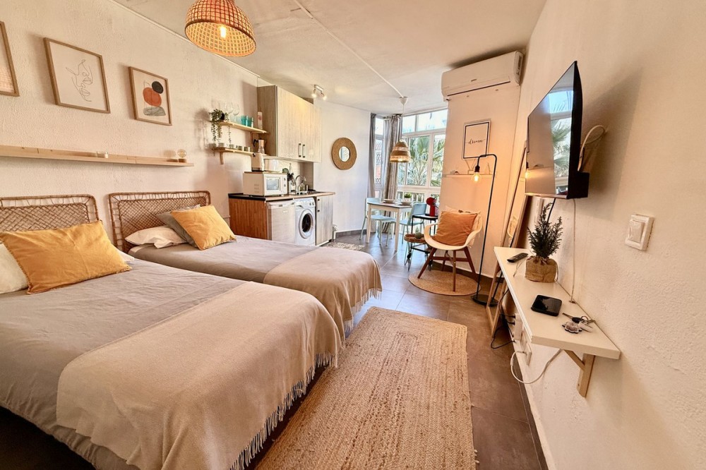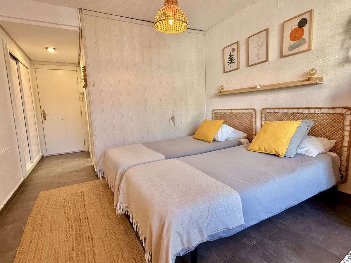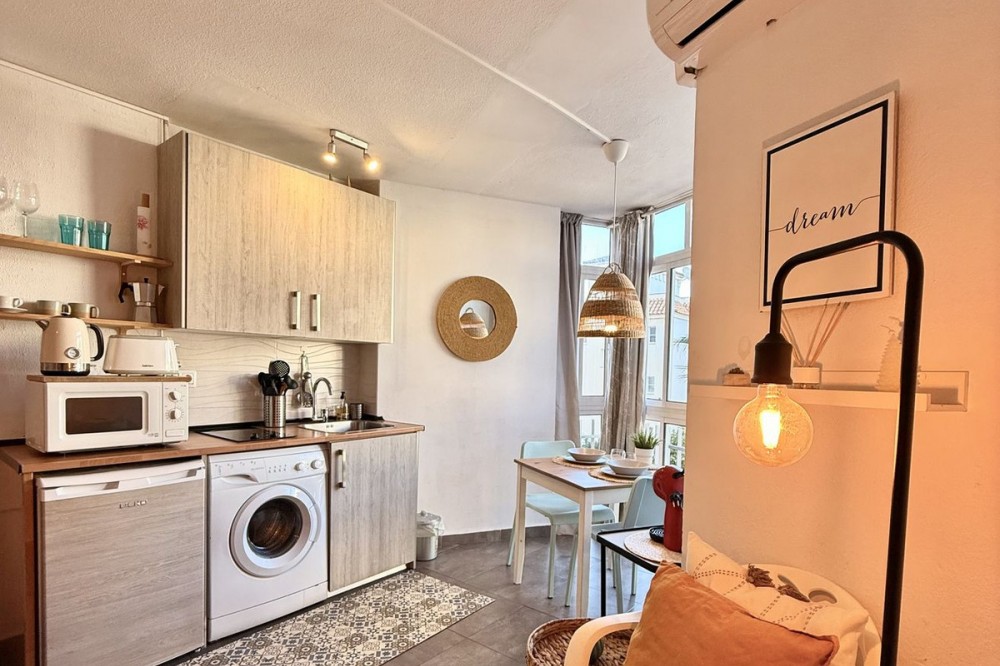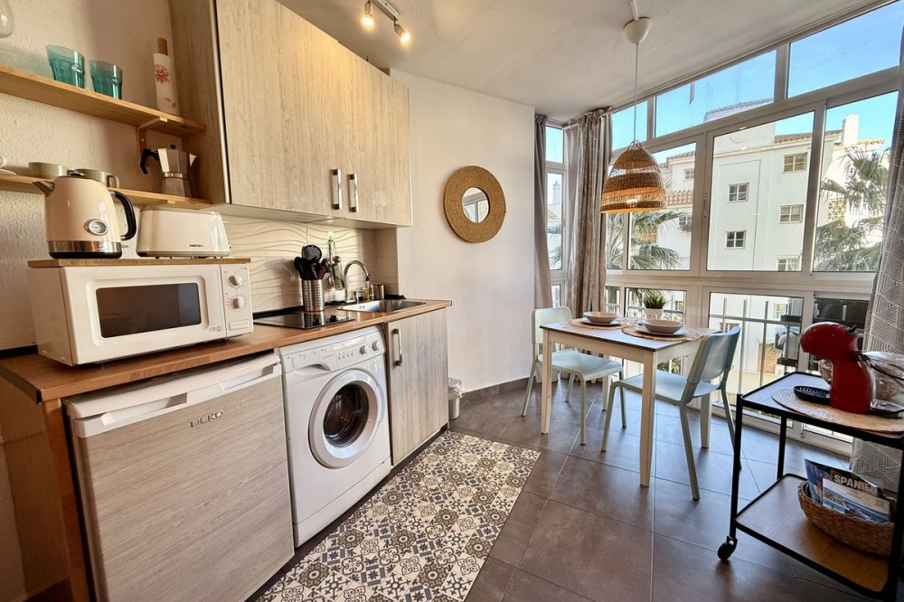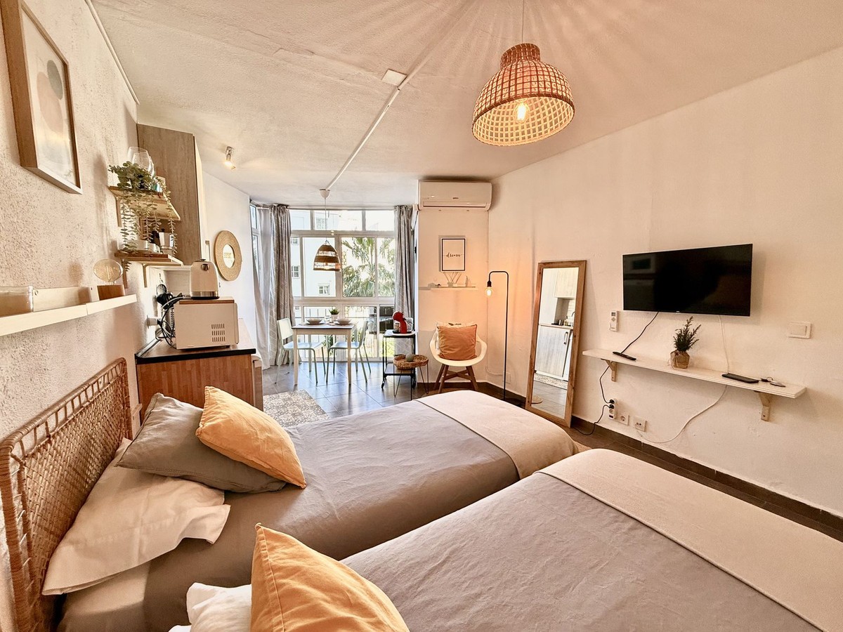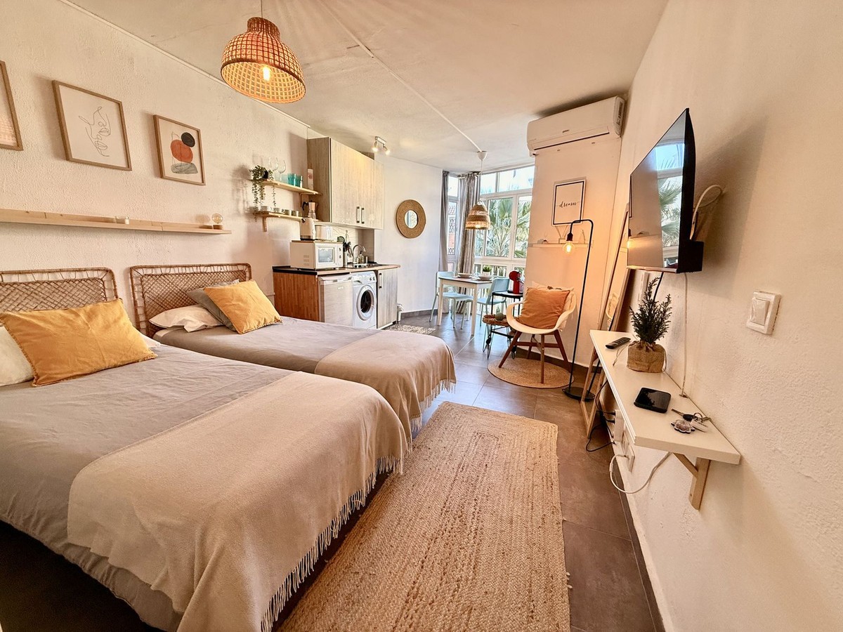 - This completely renovated studio apartment for sale in Benalmádena Costa — just 50 meters from the beach! This cozy studio is located on the second floor of a building with an elevator and comprises a bright living-dining room with an integrated kitchen, as well as a full bathroom with a shower. The property is sold fully furnished and equipped, with two 90 cm beds, ready to move into or start renting out from day one. The residential complex has pleasant communal areas with swimming pools and gardens, as well as communal parking (no assigned space), which adds convenience and value to the property. Its location is undoubtedly one of its great attractions: just a few steps from the beach and the promenade, surrounded by all kinds of amenities such as supermarkets, shops, a pharmacy, restaurants, and bars. It is also very close to Puerto Marina, one of the most emblematic marinas on the Costa del Sol, ideal for enjoying walks by the sea, leisure and gastronomy. It is also close to the Parque de la Paloma, perfect for relaxing and enjoying green areas. Transport links are excellent, with bus stops and taxis just a few meters away, and the local train station approximately 1.3 km away, providing easy access to Malaga city and other points along the coast. Malaga-Costa del Sol Airport is about 11-12 km away, just 10-15 minutes by car. An ideal property as a vacation home, primary residence, or investment, located in one of the most sought-after areas of Benalmádena, with everything within reach and a dynamic environment by the sea.