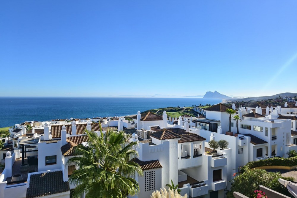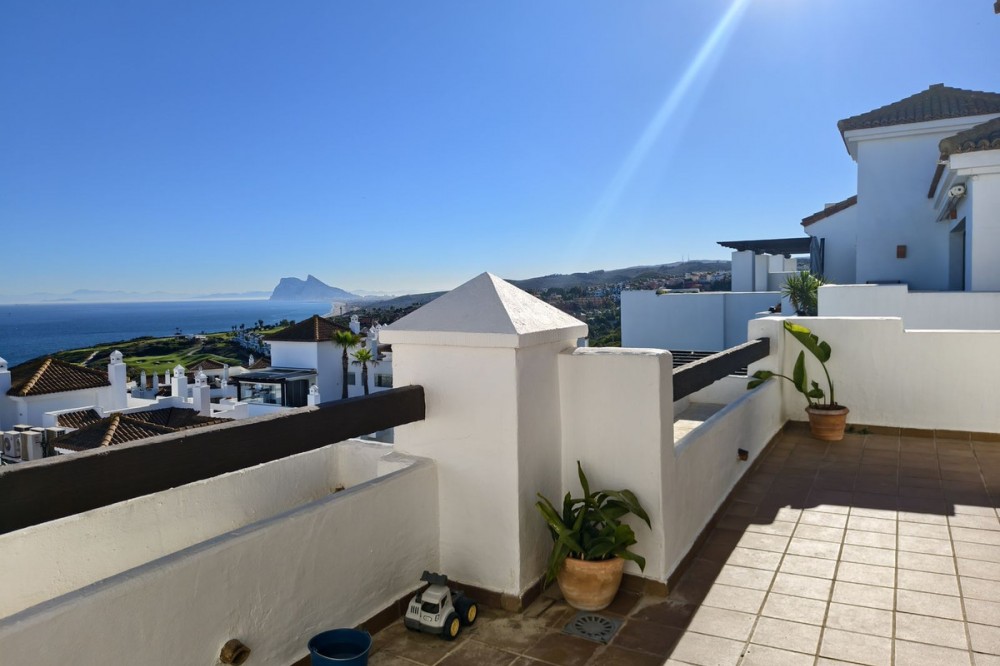 - Exclusive Penthouse with Panoramic Sea & Gibraltar Views – Marina de Alcaidesa Discover this exceptional penthouse offering breathtaking panoramic views of the Mediterranean Sea, the Rock of Gibraltar and Punta Carbonera lighthouse. A truly privileged setting where natural light, open views and a sense of space create a unique living experience. The landscape feels like a living painting, changing throughout the day. The property is ready to move in and features large floor-to-ceiling windows, allowing sunlight to flood the interiors while seamlessly connecting indoor and outdoor living spaces. Located within the prestigious Marina de Alcaidesa residential complex, just a 10-minute walk from the beach, the community offers four swimming pools, well-maintained gardens and a peaceful, secure environment—ideal for permanent living, a holiday home or investment. One of the highlights of this penthouse is its spacious private terrace, with South, East and West orientation, ensuring sun exposure throughout the day. The terrace allows for multiple outdoor living areas, perfect for dining, relaxing, entertaining guests or enjoying summer barbecues with uninterrupted views. The apartment offers three double bedrooms and two bathrooms, including a master bedroom with en-suite bathroom, providing comfort and privacy. The kitchen is bright and functional and can easily be opened to the living area, creating a modern open-plan layout. The living room benefits from double-height ceilings, enhancing the feeling of space, light and exclusivity. Additional features include lift access directly to the underground garage, with two private parking spaces and a storage room, adding convenience and value. Ideally located in Alcaidesa, just a short walk from the new Fairmont La Hacienda resort, this property represents an excellent long-term investment in one of the most promising and up-and-coming areas of the Costa del Sol.