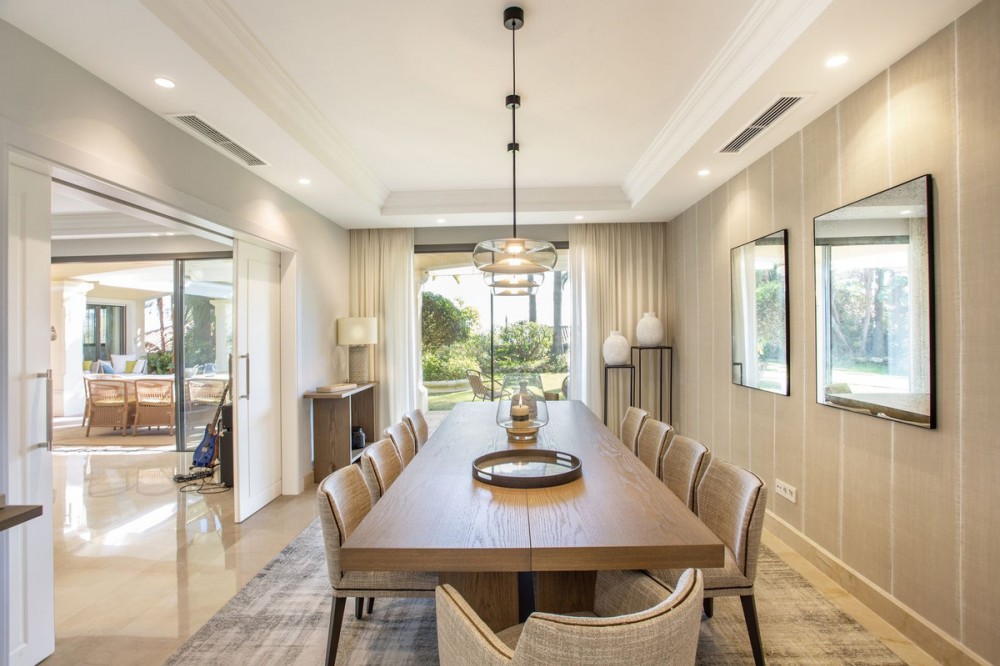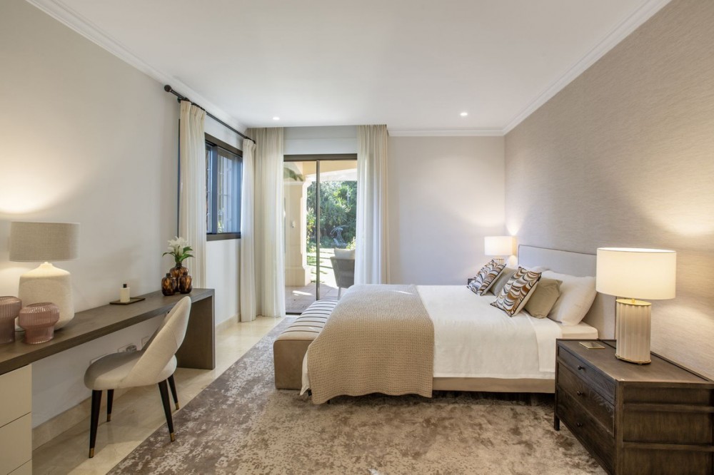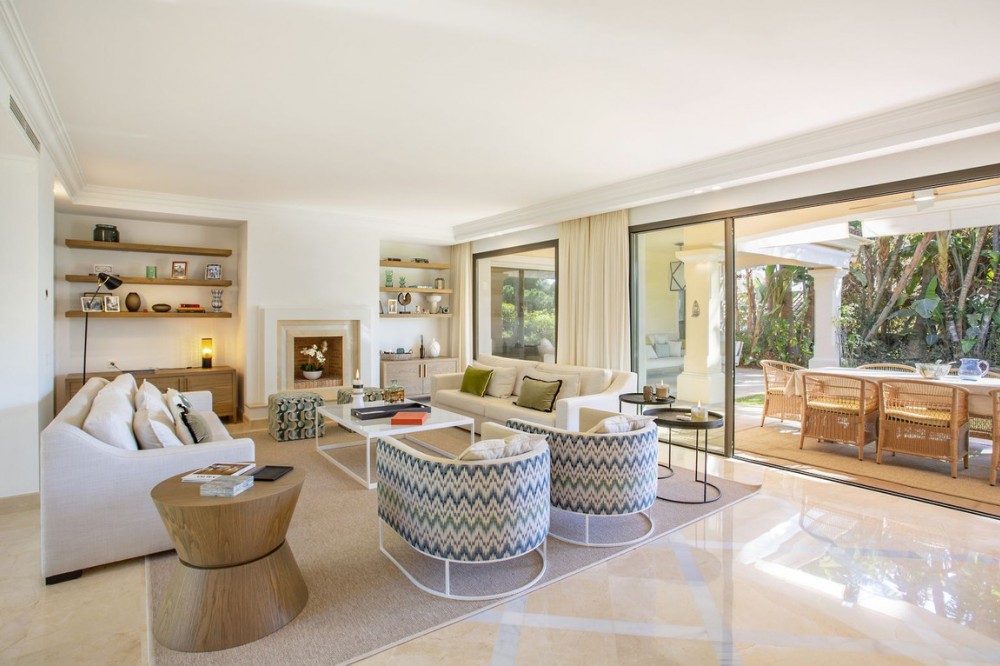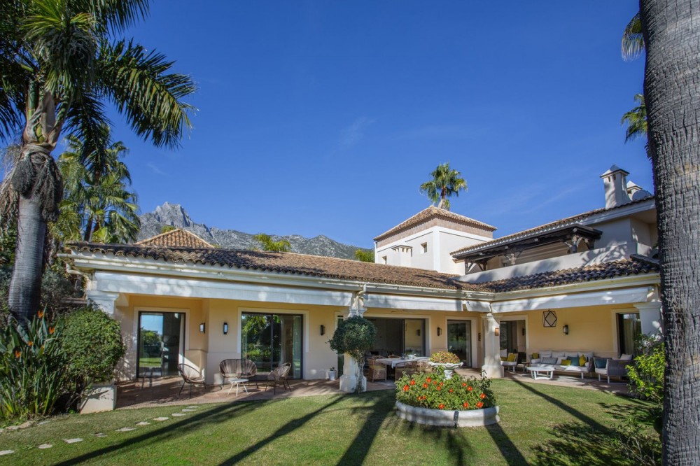 - Located in the prestigious neighbourhood of Sierra Blanca just minutes from the Marbella Golden Mile, this renovated detached villa enjoys a totally private plot with sea and La Concha mountain views. Upon entering the property there is a feature triple height entrance hall that connects 4 main parts of the house: (1) Walking straight through you have a large living room area connected to the covered patio, gardens and pool. In the living room you will find connections to the dining room and large kitchen with breakfast and snack area. (2) Turning left you have 3 generously sized guest rooms each with en-suite bathrooms. (3) Going upstairs we discover a fantastic master suite, totally private from the rest of the house with his and hers walk-in wardrobes, en-suite bathroom and private office. The master suite also enjoys a gorgeous private terrace with ocean and La Concha views. (4) Walking downstairs we have a totally renovated basement space that has been transformed into a fully equipped gymnasium with rest room, kids playroom / customisable space, home-cinema, storage areas and a laundry room. The exterior of the house: The gardens and pool are accessible from all areas of the ground floor and have been landscaped flat to the property. The pool was also renovated with new tiles and terrace. The property has two drive ways with total space for 5+ cars. If required, the gymnasium can be converted back to an interior garage space for 2 cars. Book a tour to view this exceptional residence today in Sierra Blanca!