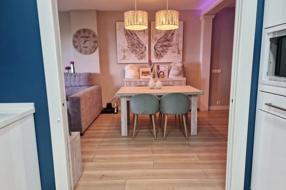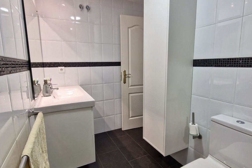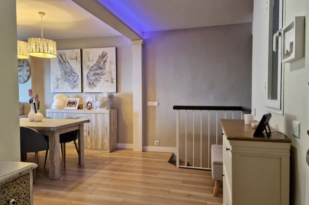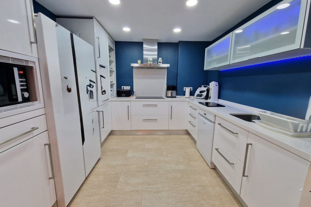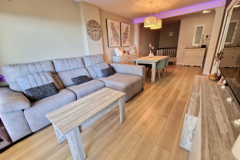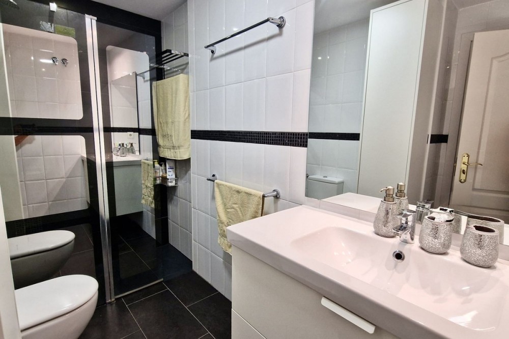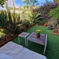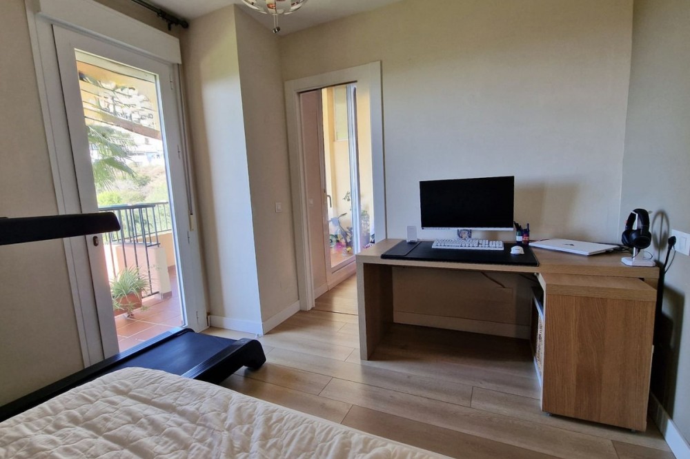 - Immaculate, beautifully reformed, spacious ground floor duplex apartment with 2 terraces, private garden AND sea and pool views!! Located in a quiet corner of this fabulous community, the apartment, at entry level, consists of hallway,, large lounge/dining room, modern fully equipped kitchen, double bedroom (currently used as an office), bathroom and a wonderful terrace from which stunning sea, garden and pool views can be enjoyed. Downstairs, we find another double bedroom, master bedroom with ensuite bathroom and another terrace, again with beautiful views. Then the lovely recently renovated private garden, with grass, plants, fruit trees and a laundry area. There is parquet flooring throughout the property, with the exception of the bathrooms and kitchen. The property also has a storage room of 6m2. The community is immaculately maintained and cleaned, gardens boasting subtropical trees, plants and flowers. vast lawns and, of course, a fabulous swimming pool. The property is more than spacious enough for a family to live permanently or, of course, ideal as a holiday home or for investment, with holiday rentals being allowed on the community. A wonderful, spacious modern property, just perfect for anyone looking to be in a tranquil spot, yet just a short drive to golf courses, tennis clubs, bars, restaurants, shops and the beach. Short term rentals allowed. Built size: 188m2 Storeroom: 6m2 Community fees: 81 euros per month IBI: 579 euros per annum