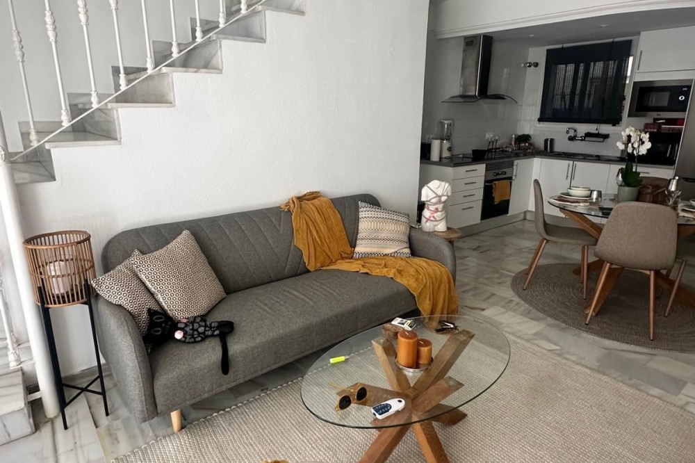 - Located in the sought-after area of La Reserva de Marbella, near Cabopino beach, this two-story semi-detached villa is set within a well-maintained residential complex with communal pools and gardens, within walking distance of amenities, shops, and leisure areas. The property has a parking space at the front and is comfortably laid out over two levels: On the main floor, there is a pleasant terrace, a spacious living room with a fireplace, a dining area, a bedroom, a guest bathroom, and an additional toilet, currently used as a small storage room, which can easily be converted back into a toilet. The upper floor houses a full bathroom with a bathtub and the master bedroom, which has a magnificent 25 m² private terrace with views, ideal for enjoying the Costa del Sol climate. Communal swimming pool As a great added value, in the basement of the house, next to the parking space, there is the possibility of building a large storage room or, for those who wish to carry out a more ambitious renovation, creating a separate apartment of the same size as the floor of the house, significantly increasing the space and value of the property. A property with an excellent location, comfort, and great potential, perfect as a primary residence, vacation home, or investment.