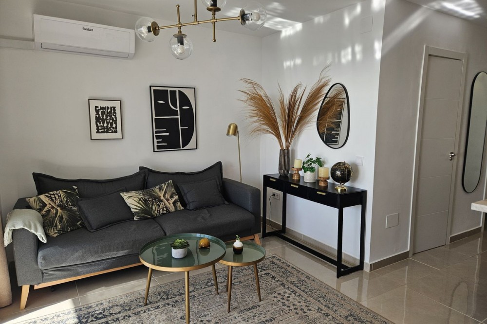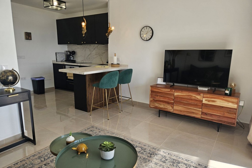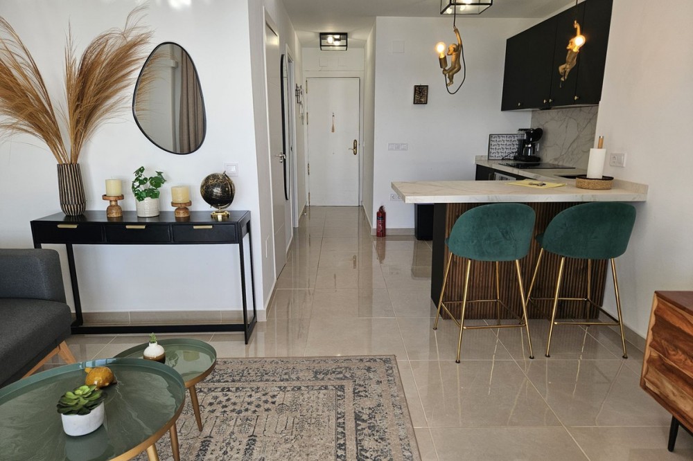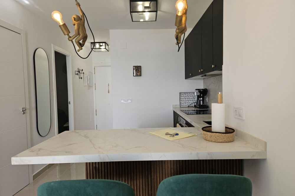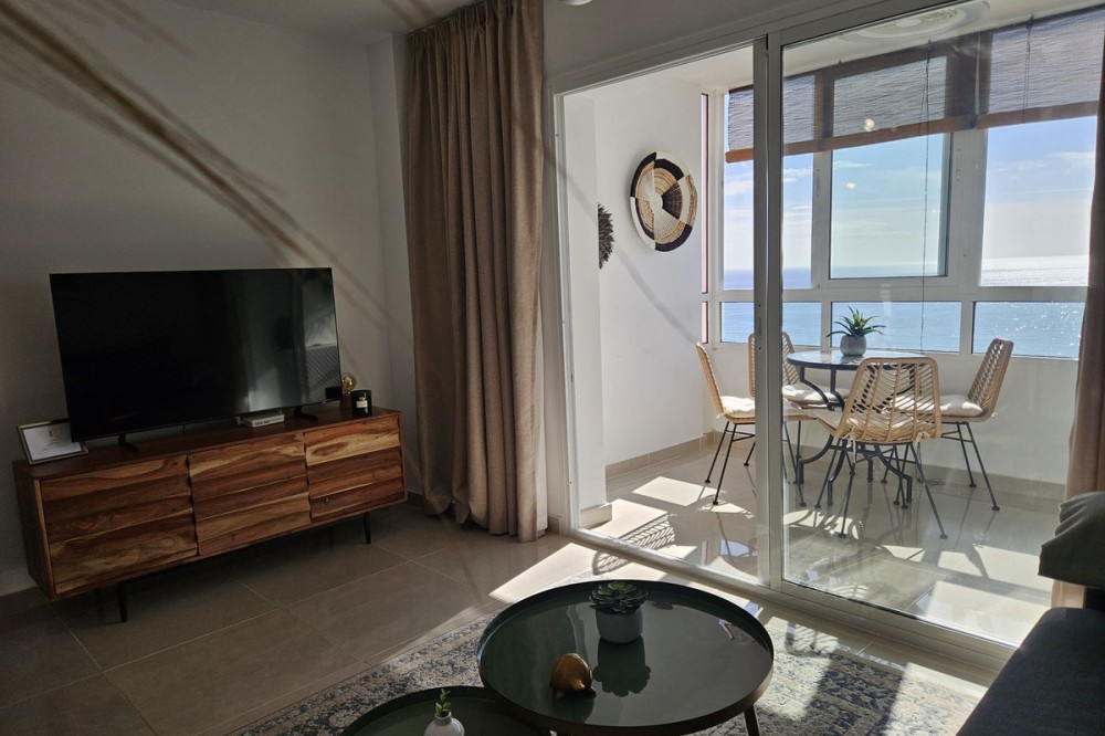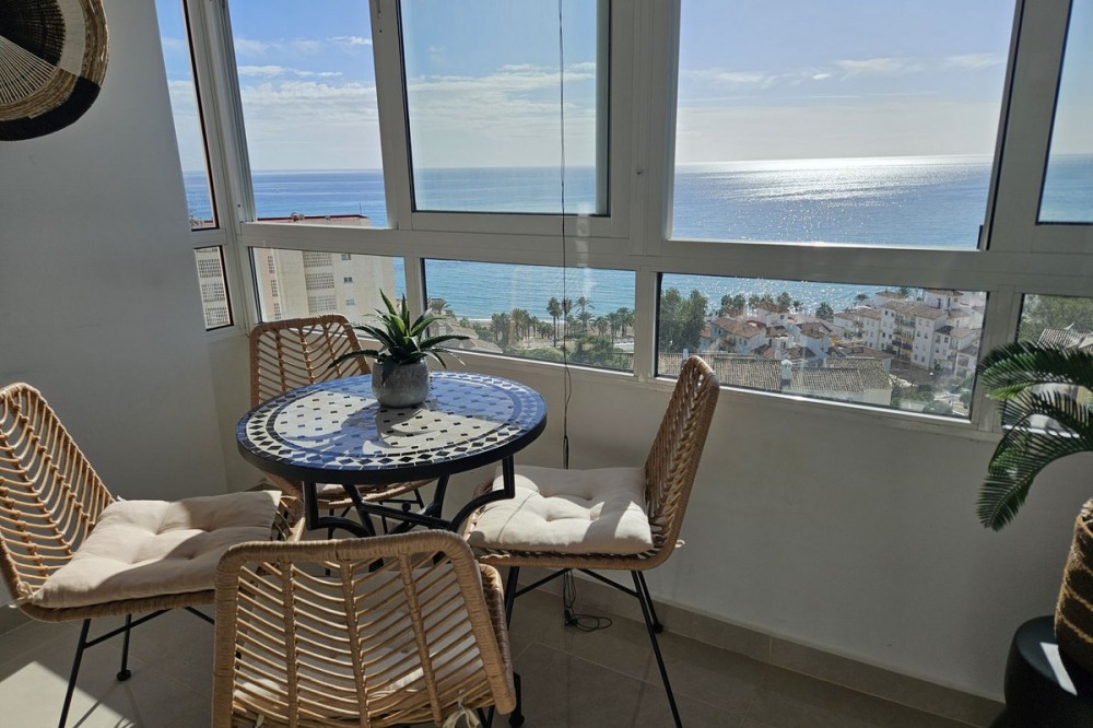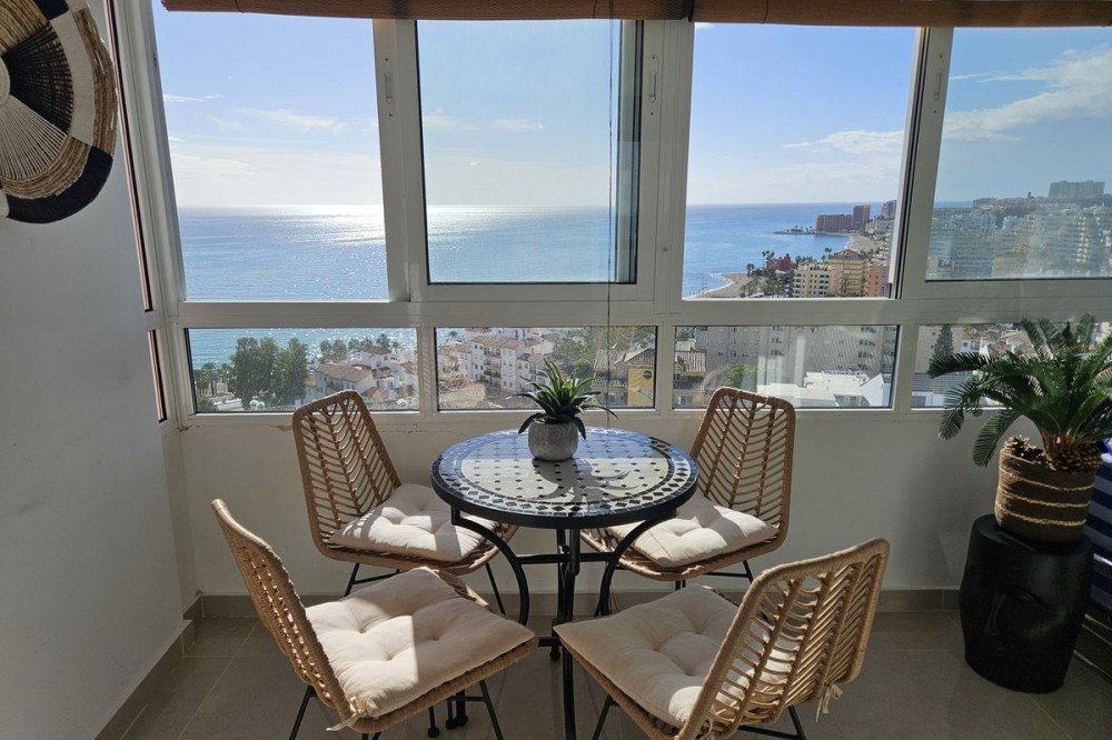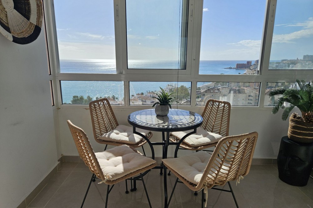 - STUNNING SEA VIEWS NEWLY RENOVATED APARTMENT Luxury 40-square-meter apartment in Benalmádena with breathtaking sea views. The apartment also features a spacious balcony overlooking the sea. It has been renovated using high-quality materials. Enjoy the sunrise from the balcony! The sun shines on the large balcony from morning until evening, and the sliding glass doors provide a pleasant shelter on windy days. The community offers a large garden pool. The apartment is sold fully furnished. Only 350 meters from the beach.