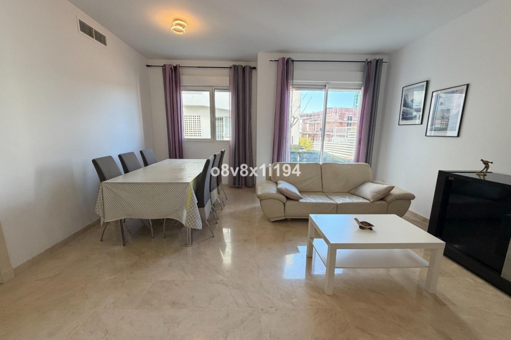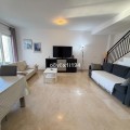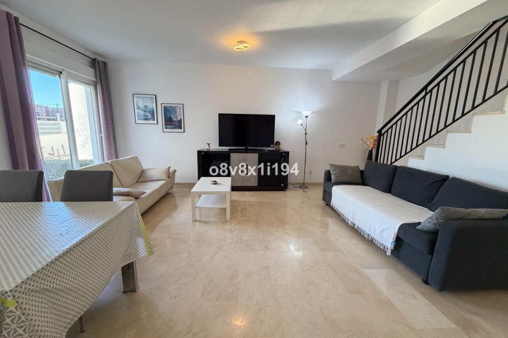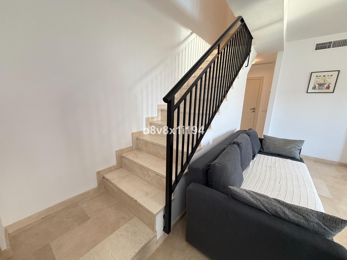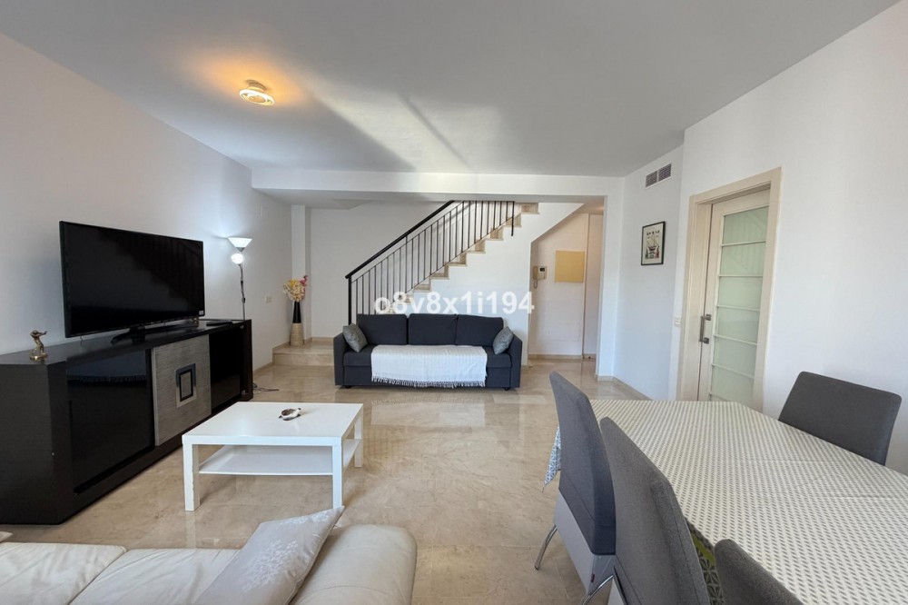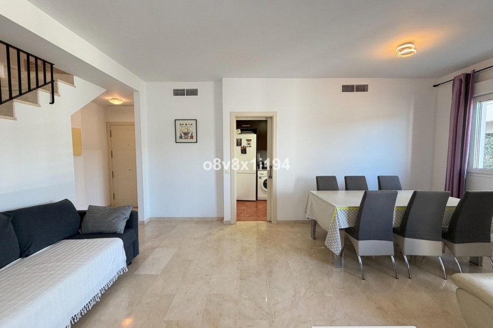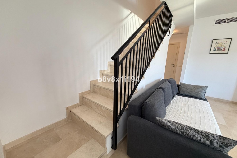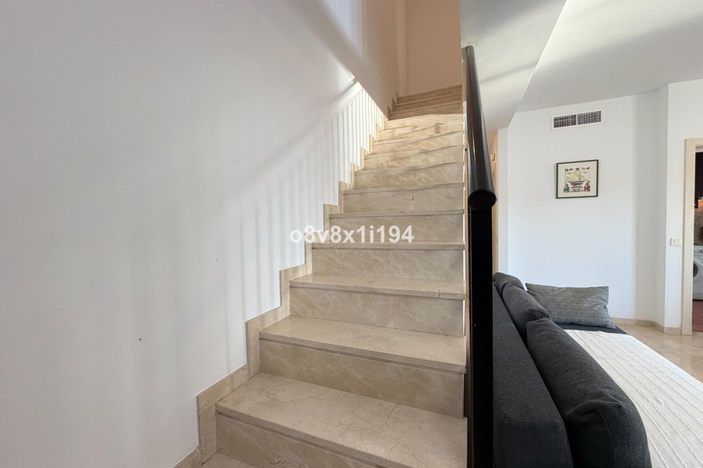 - In the Villa Borghese urbanisation, part of the Valle Romano Golf Resort, this magnificent duplex apartment is offered in perfect condition. The property is located in a quiet, green setting and offers an ideal combination of comfort, space and an excellent location. The apartment features three spacious bedrooms with built-in wardrobes, one of which enjoys sea views. On the upper floor there are two renovated bathrooms; on the ground floor there is an additional guest toilet. The property is finished with elegant polished marble floors and benefits from an abundance of natural light. The very spacious living and dining area connects to a separate, fully equipped kitchen with an additional terrace, where the hot water boiler has been discreetly installed. A practical storage room in the entrance hall completes the functional comfort. Adjacent to the living room there is a south-facing private garden, where you can fully enjoy barbecues, pleasant summer evenings and the wonderful Mediterranean outdoor lifestyle. The complete air-conditioning installation (split system for both the ground floor and the upper floor) was renewed in November 2025; all invoices and documentation are available. In addition, the apartment has recently been completely repainted and both the marble floors and the bathrooms have been renovated. An underground parking space, ideally located next to the entrance hall of the garage, is included in the price. The residence features a communal swimming pool, is surrounded by beautifully landscaped walking paths and offers an underground garage. Thanks to its quiet location outside the centre of Estepona, yet only a five-minute drive from supermarkets, restaurants and shops, this property is a perfect base for both permanent living and a holiday home. A unique opportunity for those seeking space, quality and an exceptional location by the golf course.