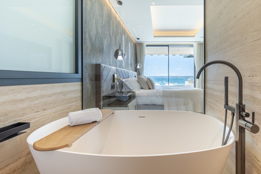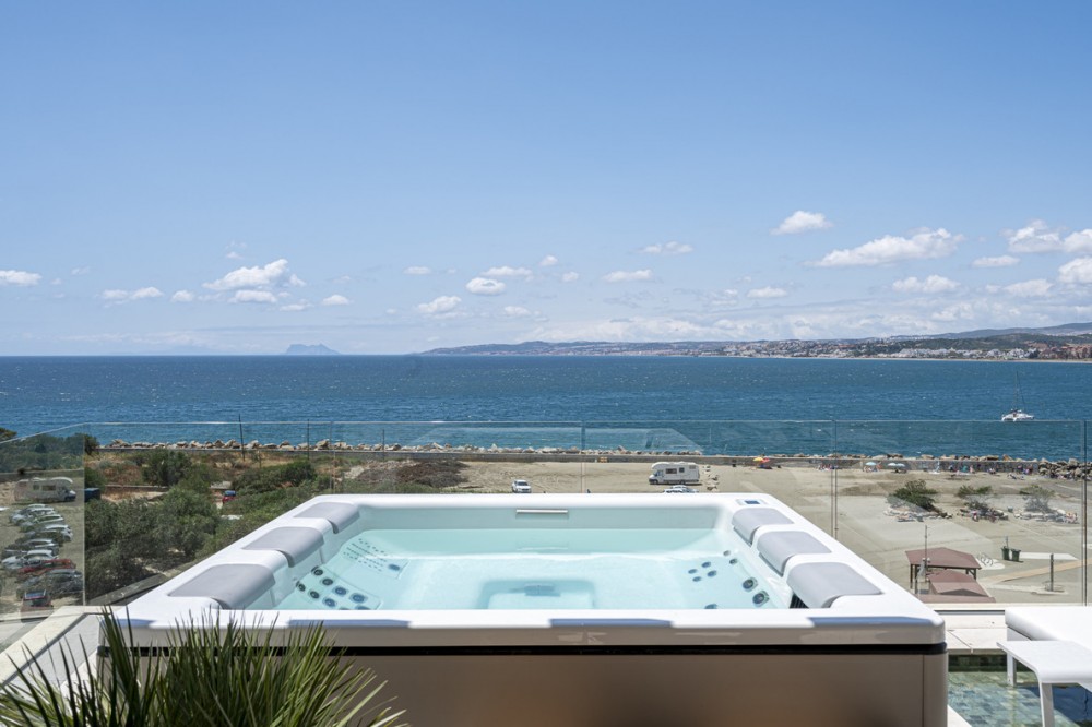 - Located in the highly sought-after Playa del Cristo area of Seghers, Estepona, this luxurious beachfront apartment epitomises modern living with a touch of coastal elegance. Offering uninterrupted panoramic sea views, this newly constructed property, completed in 2024, combines prime location with state-of-the-art amenities, making it an exceptional opportunity for discerning buyers. Spanning an impressive 104m² of interior space, the apartment features two generously proportioned bedrooms and two meticulously designed bathrooms. The fully fitted kitchen, equipped with high-end appliances, flows seamlessly into the open-plan dining and living areas, creating a perfect space for entertaining or relaxation. Premium finishes, including marble flooring, double glazing, and glass doors, enhance the sophisticated aesthetic, while the home automation system, central heating, and air conditioning ensure year-round comfort. Additional highlights include a utility room, storage room, and a private garage. The expansive 102m² terrace is a standout feature, offering both covered and uncovered areas to enjoy the Mediterranean climate. Residents can indulge in a private pool, a jacuzzi, and a sauna, all complemented by access to a communal indoor pool and a fully equipped gym. The gated community provides 24-hour security with surveillance cameras and video entrance systems, ensuring peace of mind. Modern conveniences such as electric blinds, fibre-optic internet, satellite TV, and fitted wardrobes further enhance the living experience. Situated within walking distance of Estepona Old Town and close to renowned restaurants, shops, and schools, the property offers direct access to the beach and proximity to golf courses and children’s playgrounds. The vibrant marina and cultural landmarks of Estepona are just moments away, while excellent transport links make exploring the Costa del Sol effortless. This apartment is ideal for those seeking a luxurious coastal lifestyle or a sound investment in a prime beachfront location. Schedule a private viewing today to fully appreciate all this exceptional property has to offer.