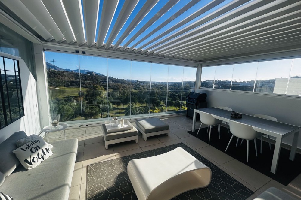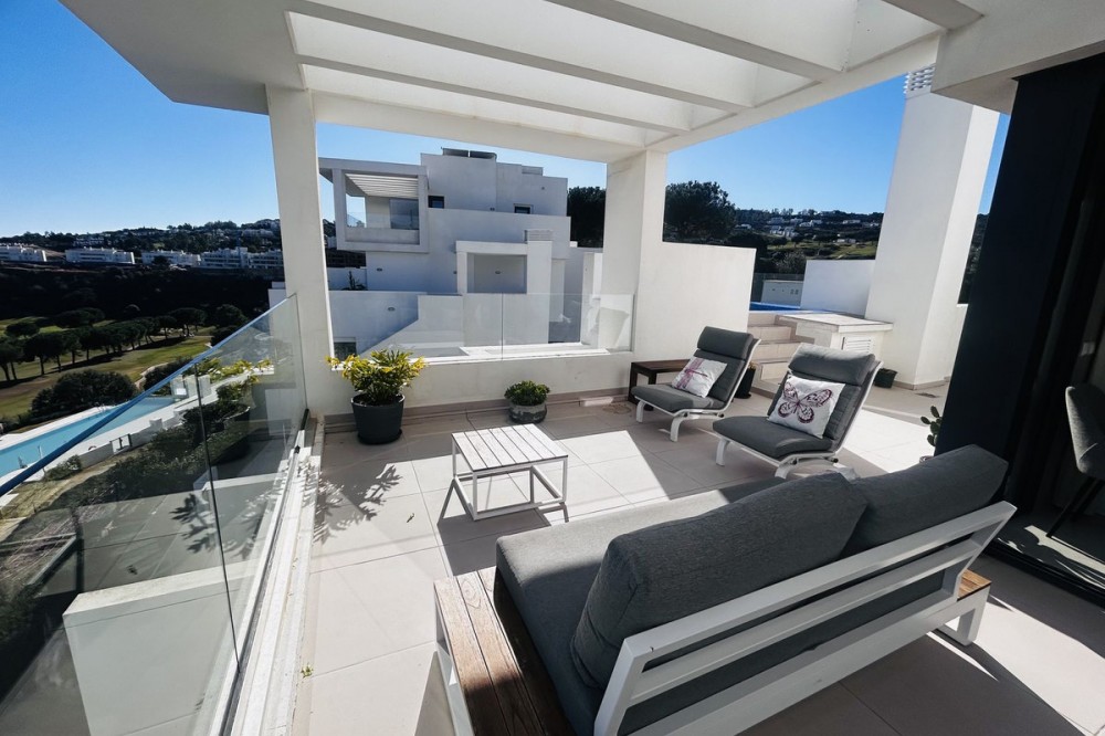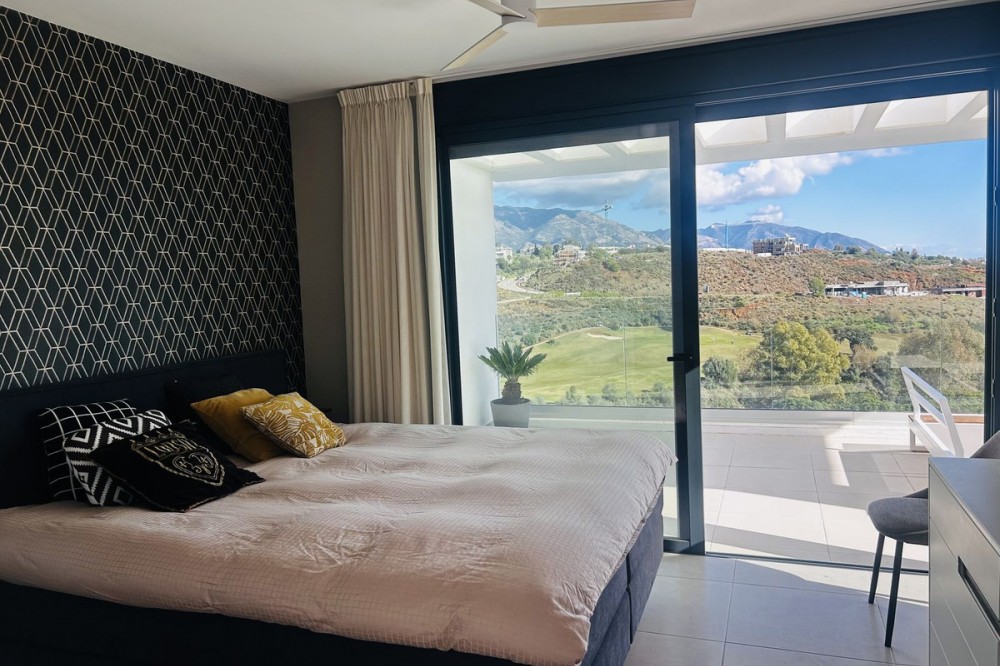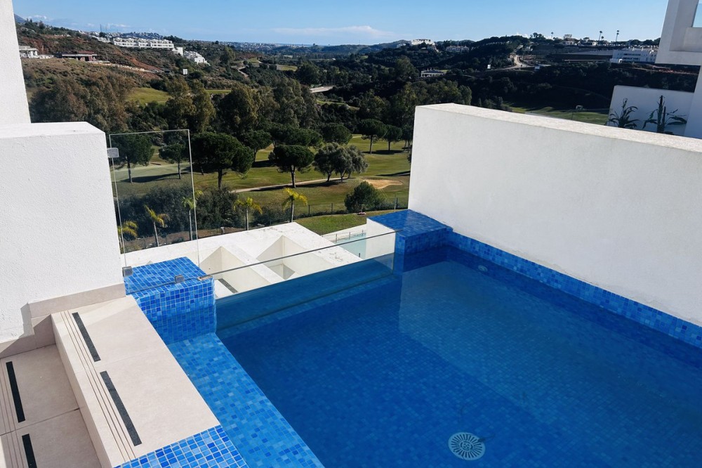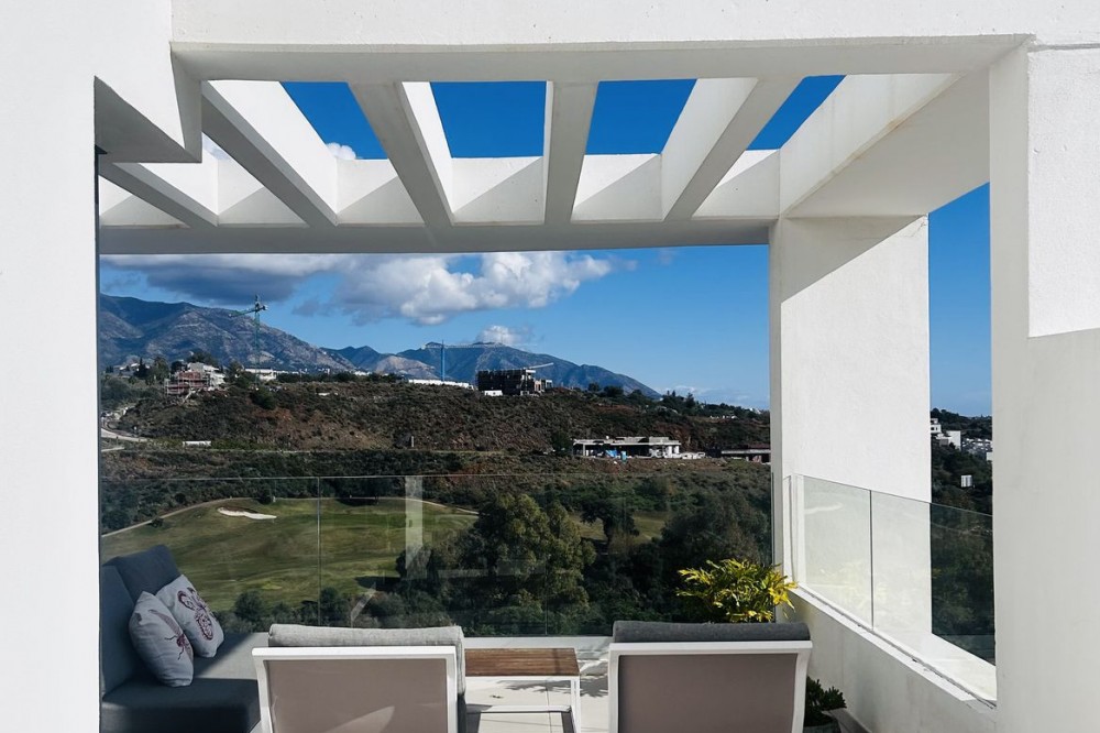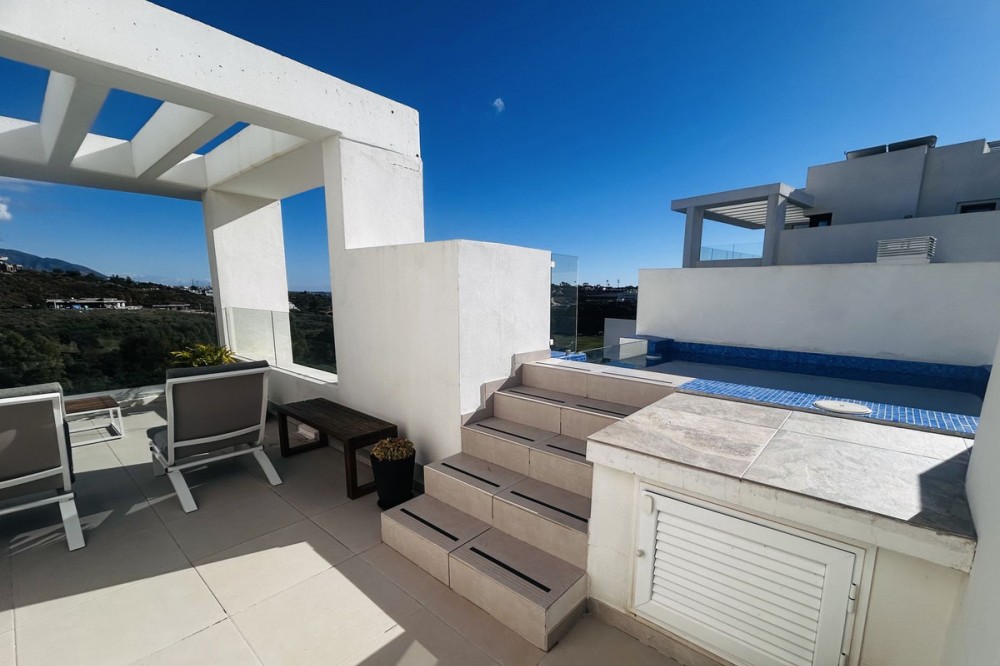 - Fairways La Cala Golf is a development of 54 modern apartments and penthouses. It is ideally situated at less than 35 min from Malaga airport, 25 minutes from Marbella and the picturesque village La Cala de Mijas is less than a 10 minutes drive away. Here you will find a wide variety of restaurants, bars and shops along a 6 km beach promenade. Set in a privileged natural environment, this penthouse combines modern design, bright and specious interior, and breathtaking views. From the moment you step inside, natural sunlight floods every corner, highlighting the high-quality finishes and creating a warm, welcoming atmosphere. The penthouse is situated directly on the front line of the famous “Campo America” golf course and offers breathtaking panoramic views of the mountains, golf courses and the Mediterranean Sea. It is distributed over 2 floors. On the main floor, the elegant living-dining area opens into a spacious terrace where sunrise become a masterpiece. The open-plan, fully equipped kitchen with Bosch electric appliances is designed for family meals and is complemented by practical utility cabinets. Two additional bedrooms offer comfort and privacy with a stunning view on the golf course and share the guest bathroom. On the upper floor there is a master bedroom with its private en-suite bathroom and an additional private outdoor shower. From there step up to the spacious solarium and enjoy the sun all day long. The upper terrace is dedicated to enjoyment: an impressive private solarium with a private plunge pool where you can relax after a day of golf. All rooms are equipped with built-in-wardrobes.The property includes two underground private and spacious parking spaces and a large storage room. The gated community offers landscaped gardens stretching along the golf course, one communal pool, gym, sauna, Jacuzzi, 4 additional exterior parking for guests and 24-hour security with surveillance cameras. A unique opportunity to live in luxury, privacy, and complete harmony with nature. Main features: • 130m2 constructed, 95 m2 usable • 3 bedrooms • 2 bathrooms • Pergola with bio-climatic roof • Upper and lower terraces 68 m2 • 2 underground parking spaces • Fitted wardrobes • Storage room • Elevator • Communal Gym, sauna, Jacuzzi • Communal swimming pool with sunbathing area • Orientation south, east, west • 360-degree view on the golf course and mountains • First-line golf course • Individual heating: electric • Air condition separate for each floor • Electrical shutters • Bosch kitchen electronic appliances • 3rd floor exterior Additional exclusive features: • System “Smart Home” in the entire apartment • Exterior plunge pool - 9 m2 • Private water purification installation to use water directly from the tap • Pergola with glass curtains and bio-climatic roof operated with remote control • Floor heating in the master bathroom • IR heating in the master bathroom • Private outdoor shower