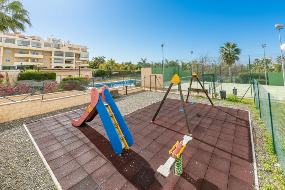 - Beautiful apartment in La Joya (Selwo) with spacious and sunny open views. The property is distributed as follows: Entrance hall, spacious living-dining room with access to a terrace, independent kitchen with access to a utility room/pantry. 2 spacious bedrooms with fitted wardrobes and 2 bathrooms (1 en suite). Garage and storage room included in the price. Built area: 99.03 m² Property tax (IBI): €353.98 per year. Community fees: €134 per month. Year of construction: 2008. Well-maintained community with large gardens, swimming pool, children’s play area and paddle tennis court. Distances: Beach: 1.5 km Supermarket: 3.6 km Hospital: 2.3 km