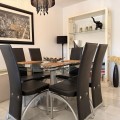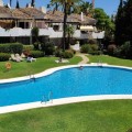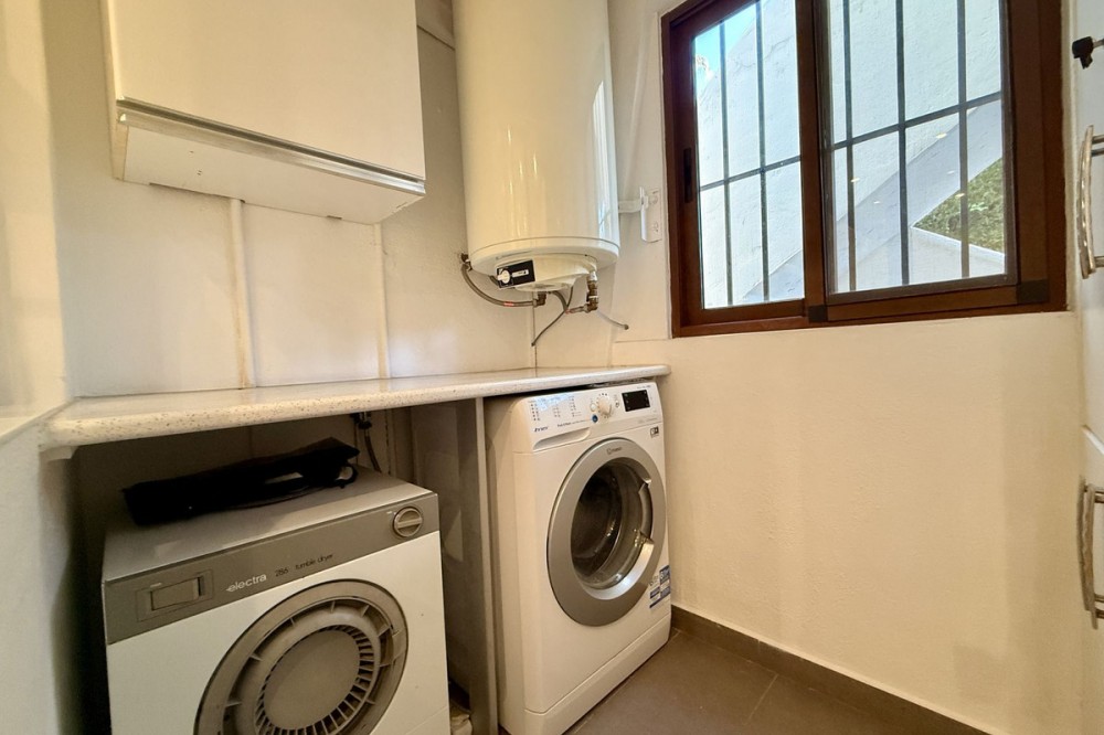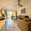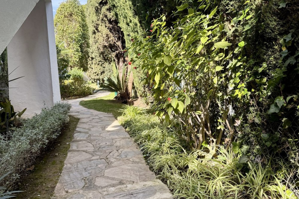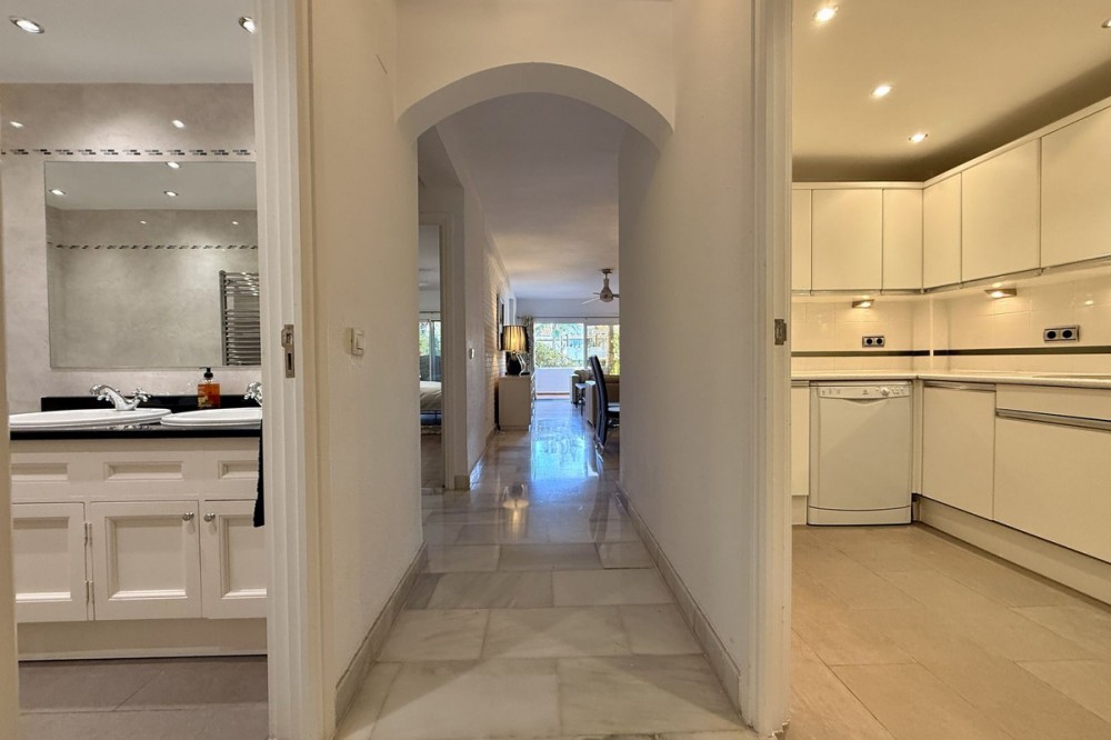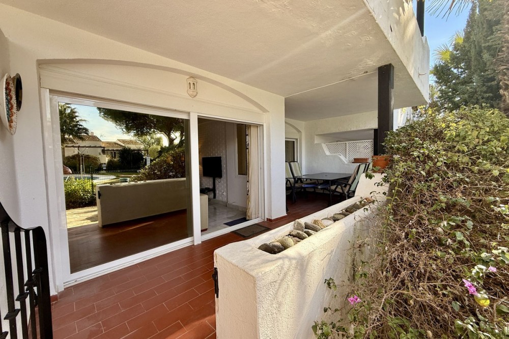 - Discover this superb south-west facing ground-floor apartment, ideally located just minutes from Marbella’s town centre, the beach, and Puerto Banús. Set within an exclusive, gated community in Sierra Blanca, residents enjoy two beautifully maintained swimming pools surrounded by lush tropical gardens. The apartment features a spacious covered terrace that offers excellent privacy and lovely panoramic views over the palm-filled gardens, with the mountains as a picturesque backdrop. The interior comprises a welcoming entrance hall, a well-appointed kitchen fully equipped, and a separate utility room with washer and dryer. The kitchen conveniently adjacent to the open-plan living and dining area, which opens directly onto the main terrace—perfect for outdoor dining, relaxing, and sunbathing. The master bedroom enjoys direct access to the terrace and includes a generous en-suite bathroom with double vanity. The second bedroom is equally well-proportioned and is served by its own separate bathroom. Additional features include marble flooring, full air conditioning and heating, videophone entry system, and electric shutters. The property also benefits from convenient access to covered parking with ample available spaces. Whether as a permanent residence or an easy lock-up-and-leave holiday home, this apartment represents an excellent opportunity. Viewing is highly recommended.