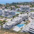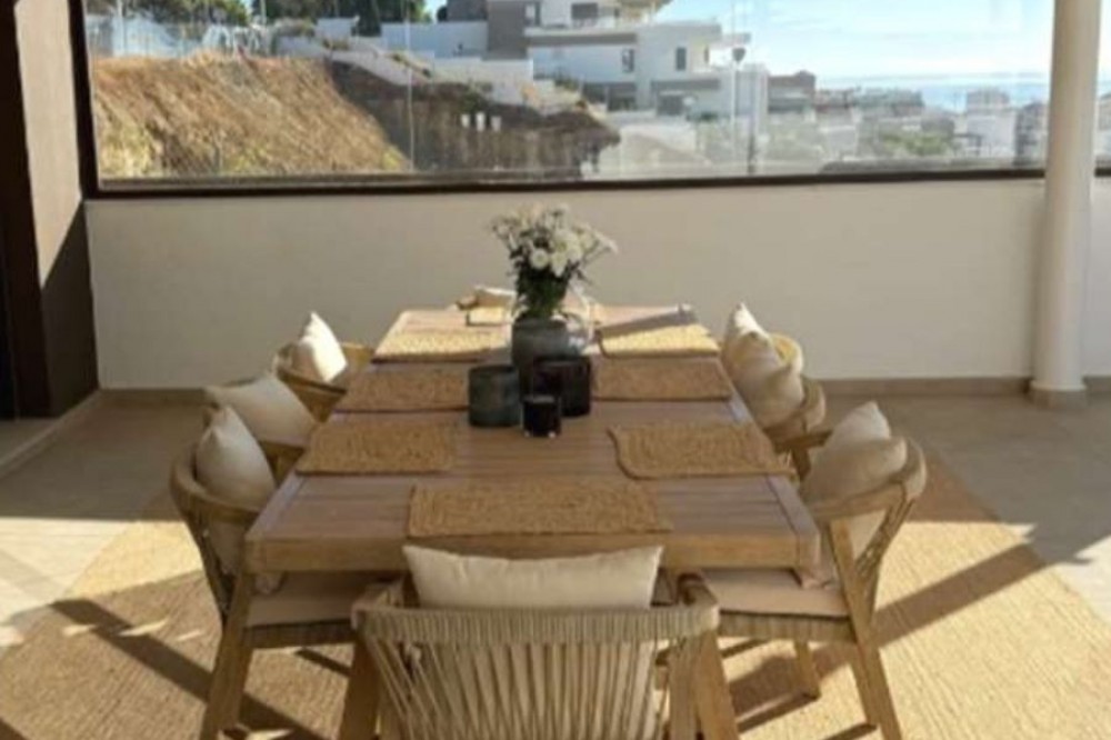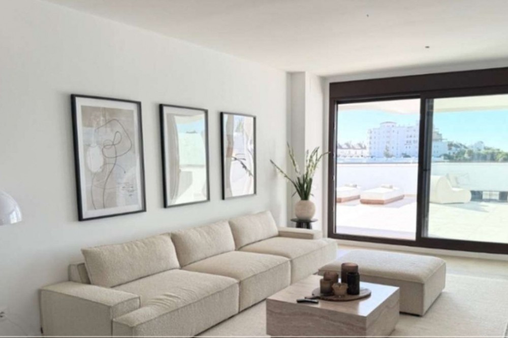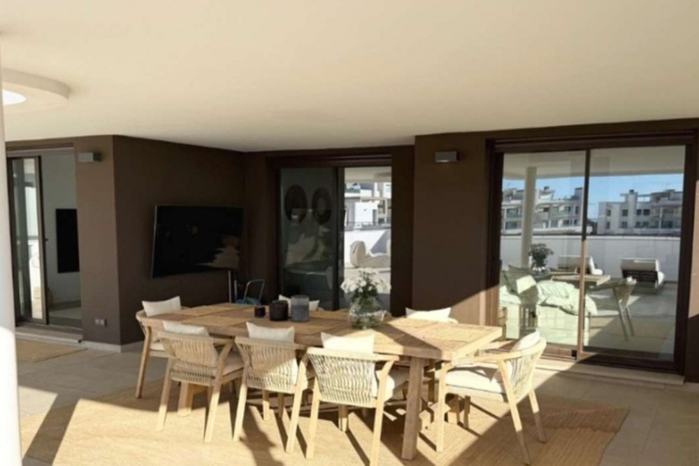 - Welcome to this bright and modern three-bedroom apartment located in the highly sought-after area of Las Mesas, Estepona, renowned for its proximity to the sea, the marina, green areas and all daily amenities. Where contemporary architecture and high-quality design come together to create an elegant and comfortable living environment. The apartment offers 112 m² of built space (94 m² usable) with a well-planned open-plan layout that seamlessly integrates the living room and the modern fully fitted kitchen, creating a spacious and sociable atmosphere filled with natural light thanks to large sliding glass doors. These open directly onto the property’s standout feature: an exceptional terrace of approximately 115 m², designed as a true extension of the living space and ideal for enjoying the Costa del Sol lifestyle all year round. The terrace enjoys sun throughout the day, features generous lounge and dining areas, is partially covered for shade and comfort, and includes partially glazed panels that provide wind protection and additional privacy, while offering pleasant open views towards the communal pool, surrounding greenery and the Mediterranean Sea in the distance. The apartment comprises three tranquil bedrooms with fitted wardrobes, including a master bedroom with en-suite bathroom and direct access to the terrace, while the remaining two bedrooms are ideal for guests, children or a home office, with two of the bedrooms also benefiting from terrace access. Both bathrooms feature a timeless, minimalist design with walk-in glass showers, large mirrors, high-quality finishes and excellent storage solutions, with the en-suite bathroom adding an extra touch of luxury. Additional features include air conditioning with hot and cold settings, a smart NUKI entrance lock controllable via mobile app, a separate laundry area discreetly located on a smaller front balcony, and orientation to the south and west for optimal natural light. The property includes a private underground parking space and a storage room, both easily accessible by lift, and the building is adapted for people with reduced mobility. South Place is a modern, secure and well-managed residential community offering landscaped gardens, a large communal swimming pool, a children’s pool and a fully equipped gym. Ideally located just minutes from Mercadona, the marina, the beach, parks, walking paths, schools, restaurants and sports facilities, this apartment is perfectly suited as a permanent residence, holiday home or investment opportunity in one of Estepona’s most attractive residential areas.
