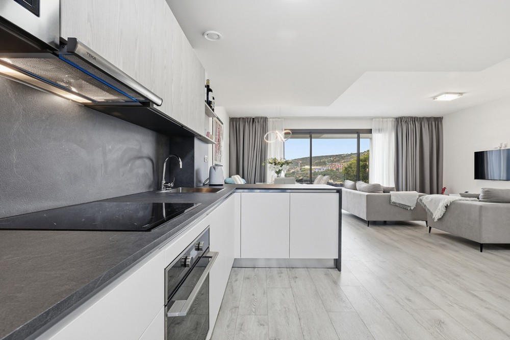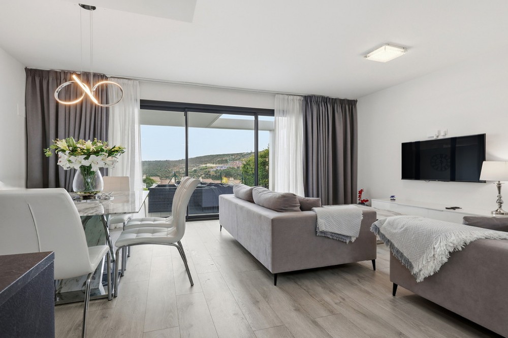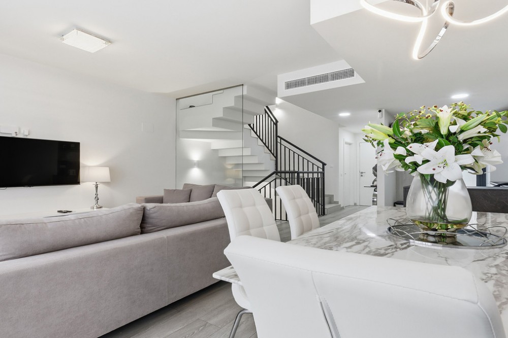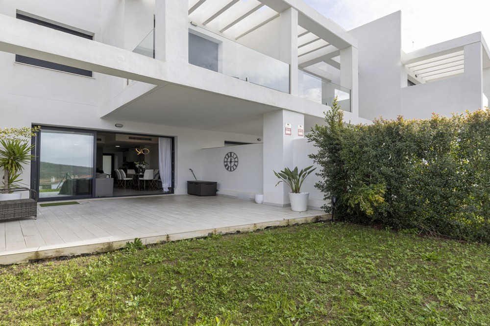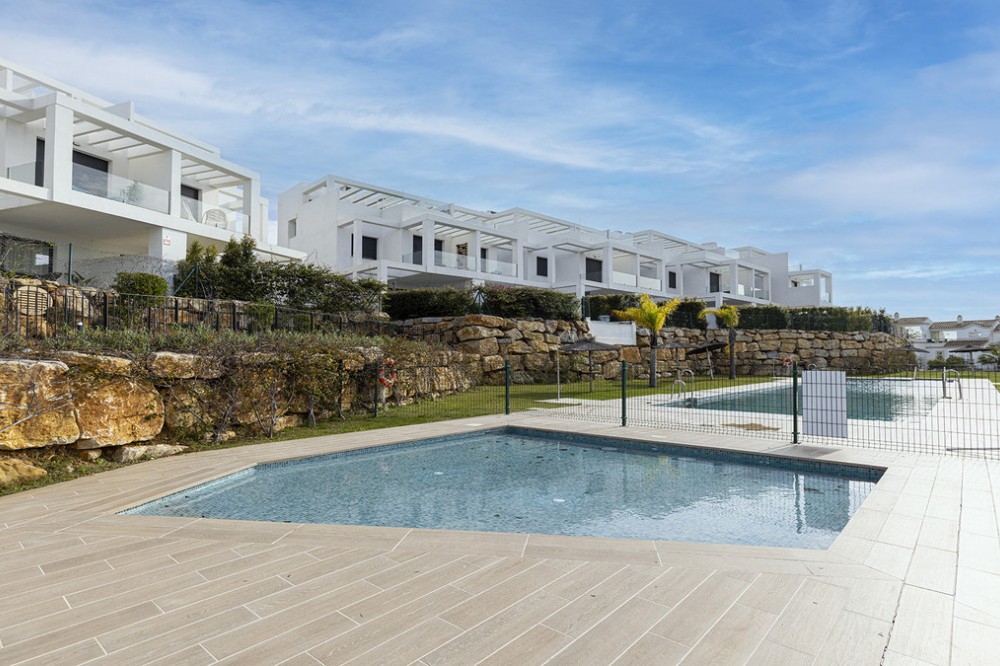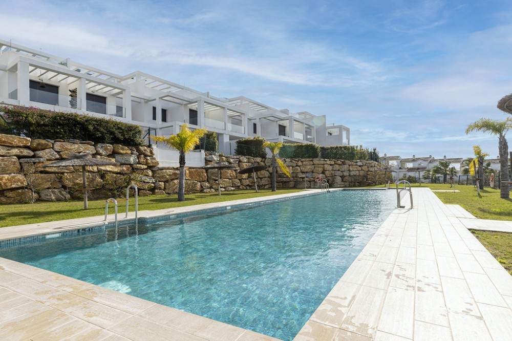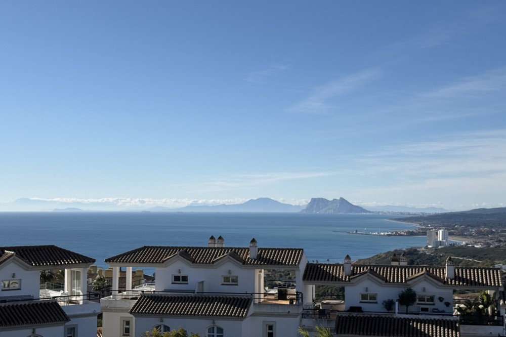 - This stylish three bedroom townhouse is set within the popular Golden View I development, an elevated residential community known for its open sea views that stretch all the way to Gibraltar and the coast of Morocco. Thanks to its southwest facing orientation, the property enjoys plenty of natural light and beautiful sunsets throughout the year. One of the real highlights of the home is the spacious rooftop solarium, designed for relaxed outdoor living. From here you can enjoy wide open sea views while unwinding in the jacuzzi, which comfortably seats up to six people. The solarium also features a fully equipped outdoor kitchen, making it a great space for entertaining friends and family. The owners have also added extra storage on this level, including fridge freezers, so everything is close at hand. The level below the solarium is dedicated to the sleeping accommodation and offers three bedrooms. The master bedroom is generous in size and benefits from an ensuite bathroom with shower, along with a private balcony where you can sit back and enjoy the sea views. Two further double bedrooms are fitted with built in wardrobes and blinds, with a modern family bathroom featuring a walk in shower positioned between them. On the main living level, the property offers a bright open plan living, dining and kitchen area that feels both welcoming and practical. A guest toilet is conveniently located to the right of the entrance. The lounge opens onto a terrace that leads directly into the private back garden, ideal for enjoying the outdoor lifestyle. The townhouse also benefits from two underground parking spaces, with direct access from the basement of the property, providing excellent convenience and security. Golden View I is a well maintained gated community with fantastic communal facilities, including a swimming pool, children’s play area, paddle tennis court and outdoor toilets. There is also direct access from the garage to the communal areas. Ideally located close to beaches, amenities and the marinas of La Duquesa and Sotogrande, this is a great option as a permanent home or a relaxed holiday retreat on the Costa del Sol. Come View with Me!