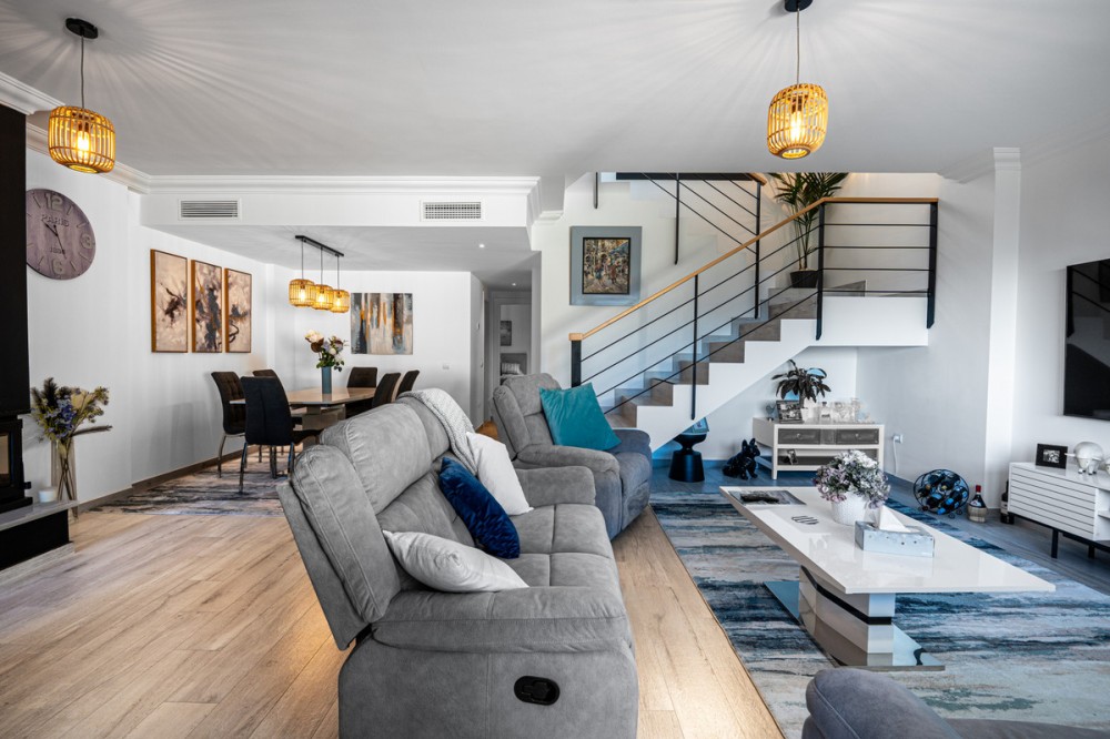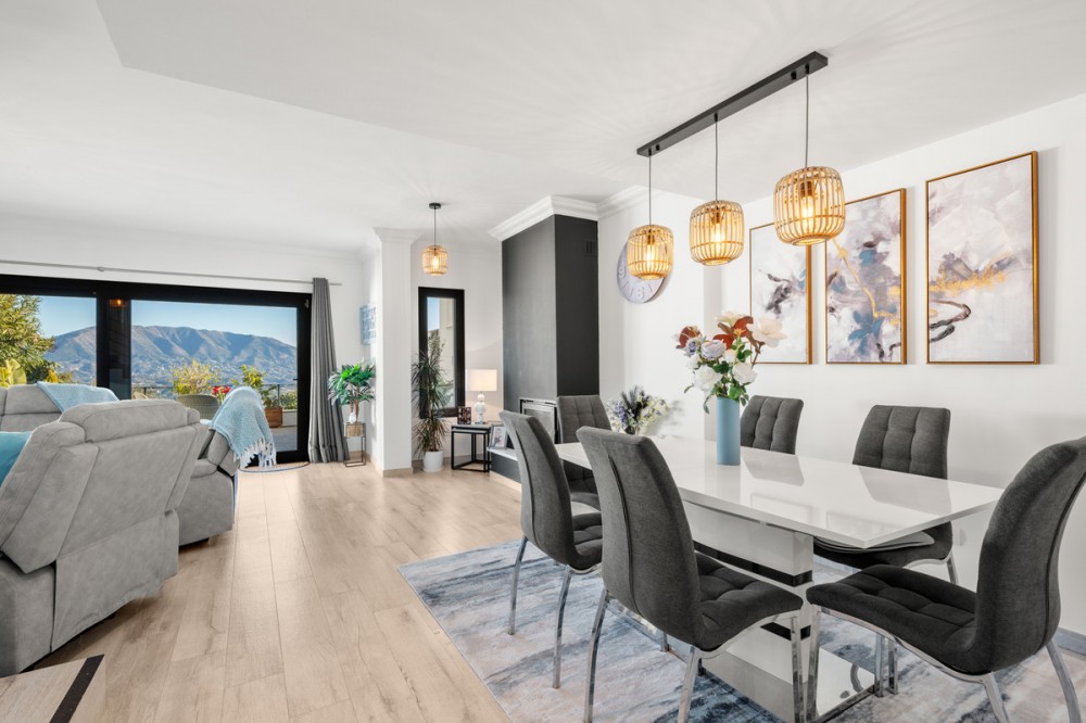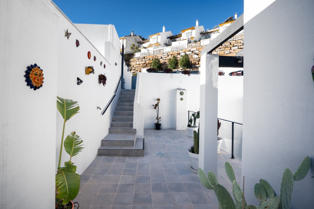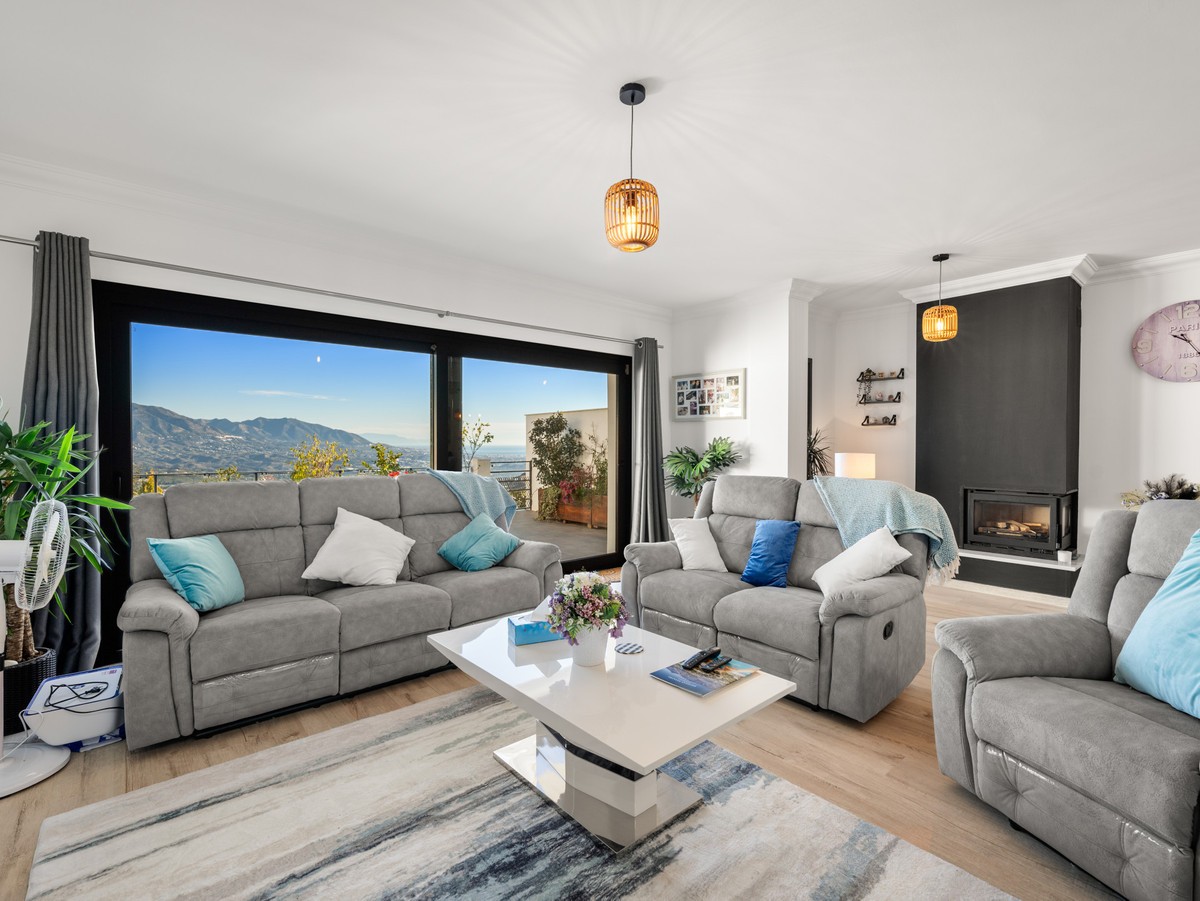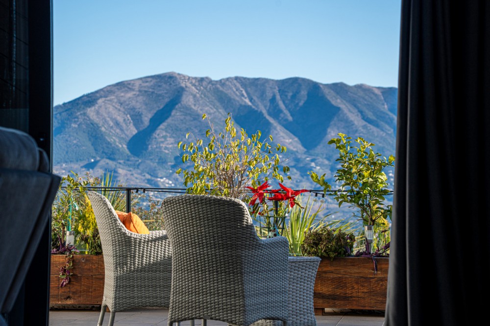 - Casa Altavista is a south east facing luxury townhouse for sale with panoramic mountain sea and coastal views. It offers three bedrooms and three ensuite bathrooms within 172 m2 built. The modern spacious kitchen has a view and direct access to the internal patio. Open plan living and dining areas lead to the main terrace with a gate to a small private garden. The home includes air conditioning central heating a wood burning fireplace two private parking spaces and a storage room. Three large sunny terraces create outdoor living on every level. The internal patio connects the house from top to bottom and brings in natural light. The master bedroom enjoys its own private terrace with open views to the coast and the mountains. Residents benefit from landscaped communal gardens and a swimming pool. This property suits buyers seeking a low maintenance luxury home with strong rental and resale appeal. Casa Altavista is ideal as a main residence or a high quality investment in a prime view location.